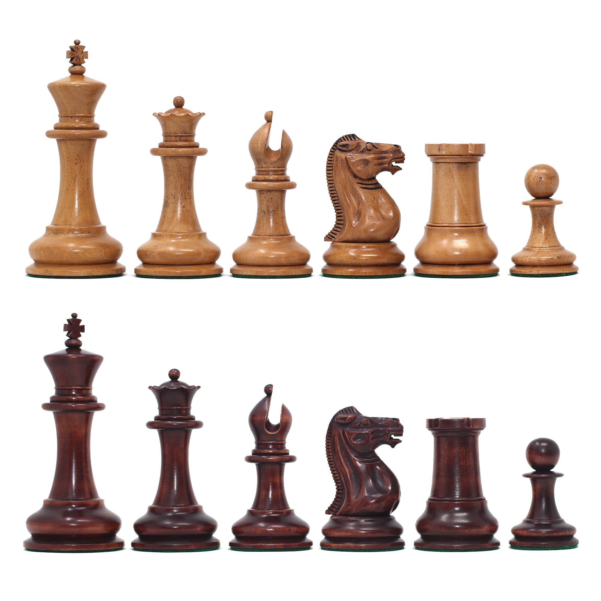 This tournament sized Chess set features a 4.4" King with a 1.9725" diameter base. The chess pieces are hand carved by our highly-skilled artisans out of the highest grade woods. The chess pieces are perfectly balanced and heavily weighted and felted and are beautifully finished.