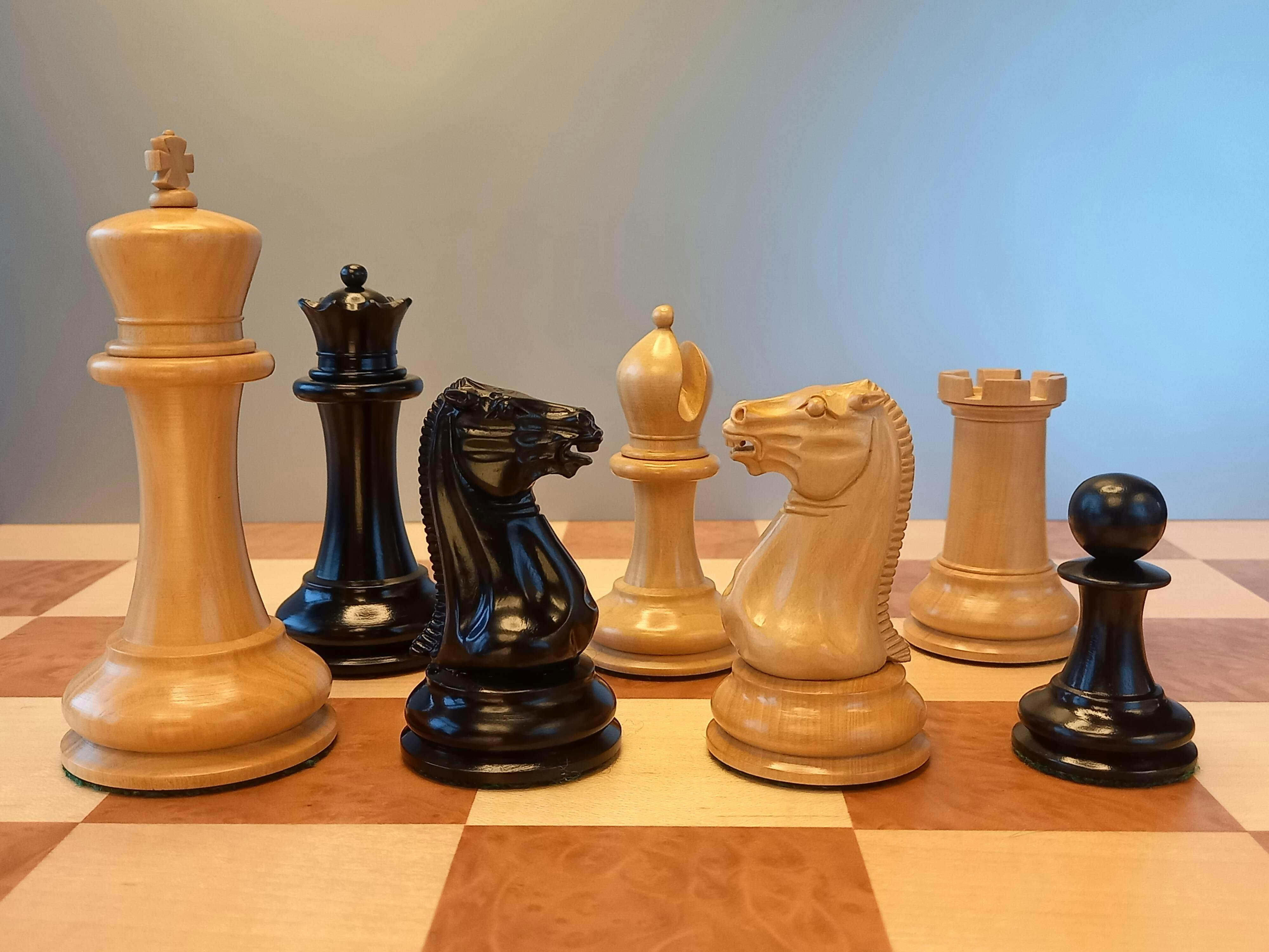 An excellent reproduction of the rare early 1849 sets. Great detailing, well finished , polished and heavily weighted. The lovely ebony grain can be seen in a strong light, so I was surprised both sides weighed exactly the same. Mandeep Saggu explained the weighting is adjusted to equalise both sides, which shows an amazing attention to detail. This is a really wonderful set which I can highly recommend.