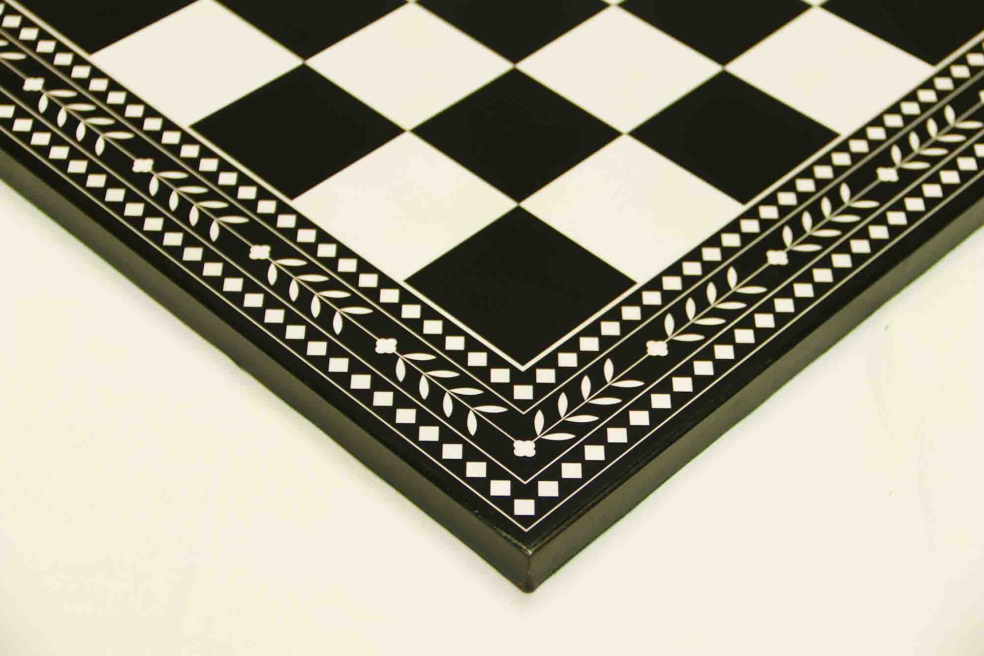 We are proud to present the Artistry Chess Board in a striking Black and White design, meticulously crafted to complement high-end chess pieces for an exceptional playing experience. This exclusive chessboard features a unique, artistic inlay work along the border, enhancing its visual appeal and making it a standout piece for chess collectors and enthusiasts.