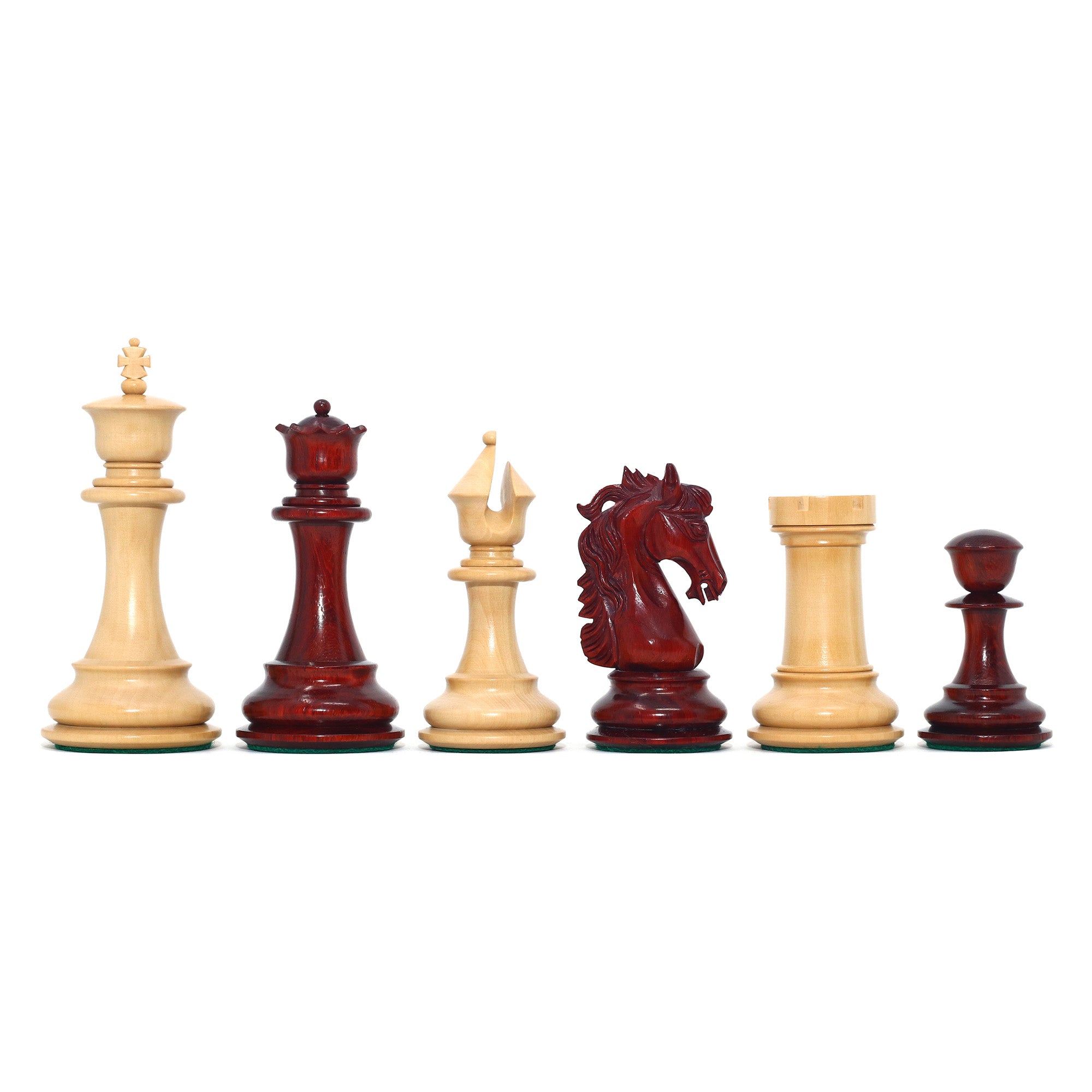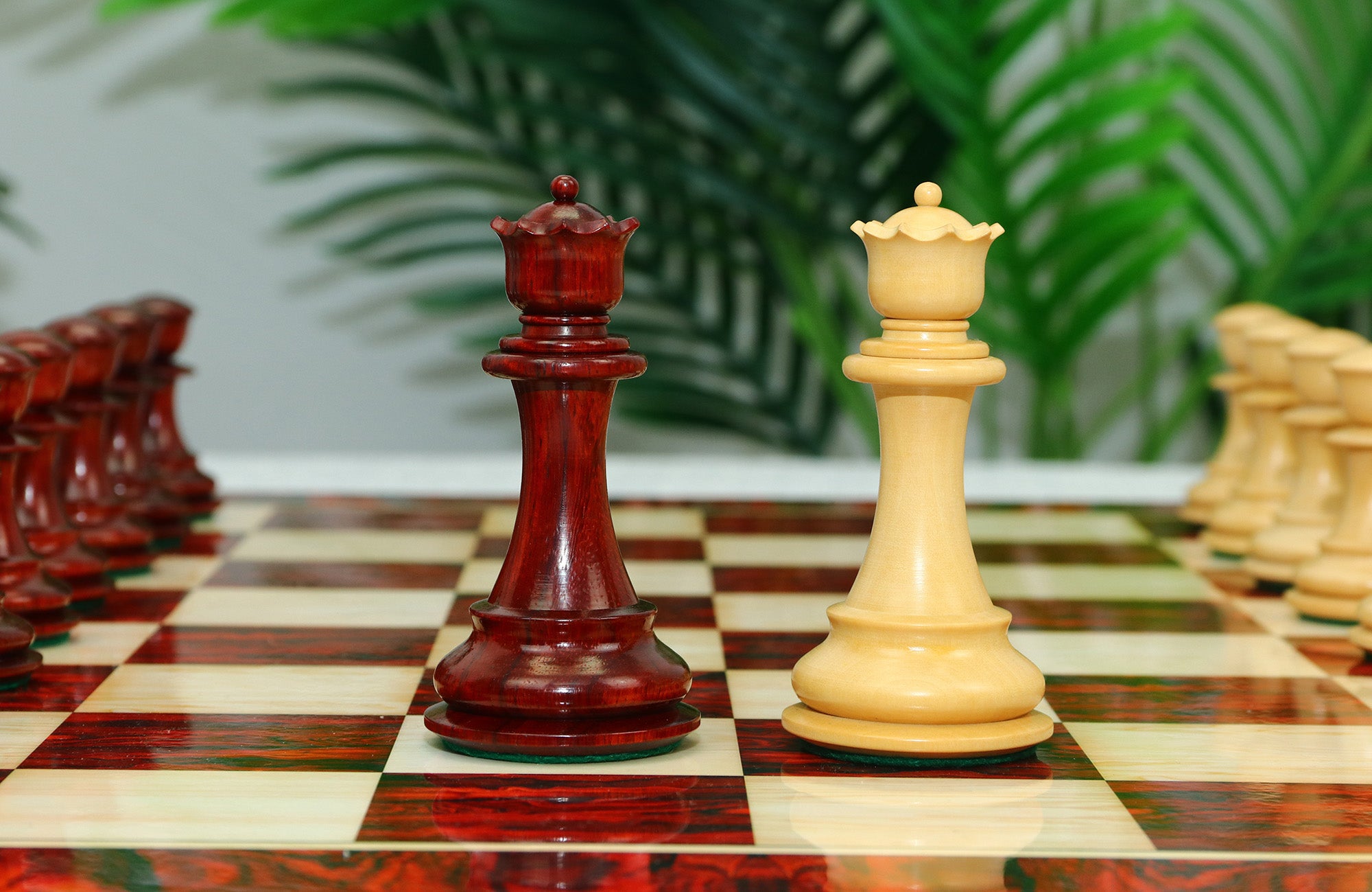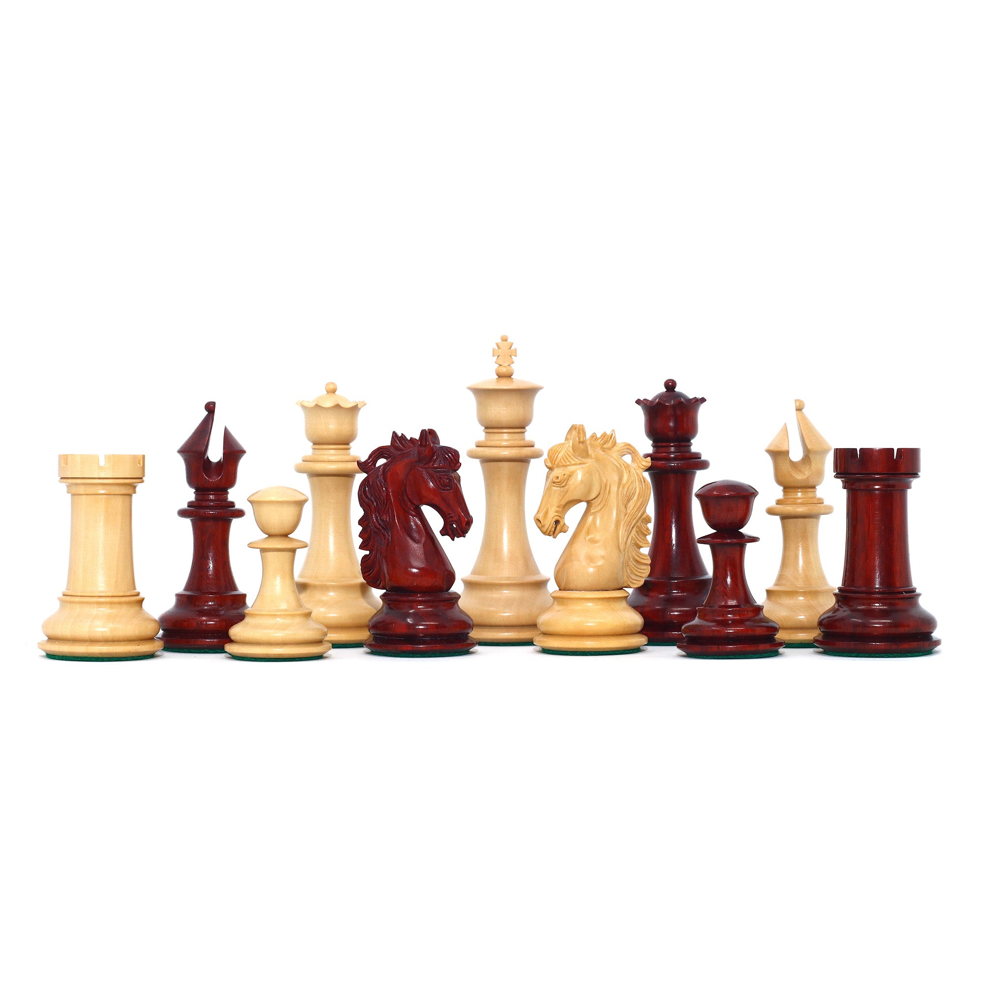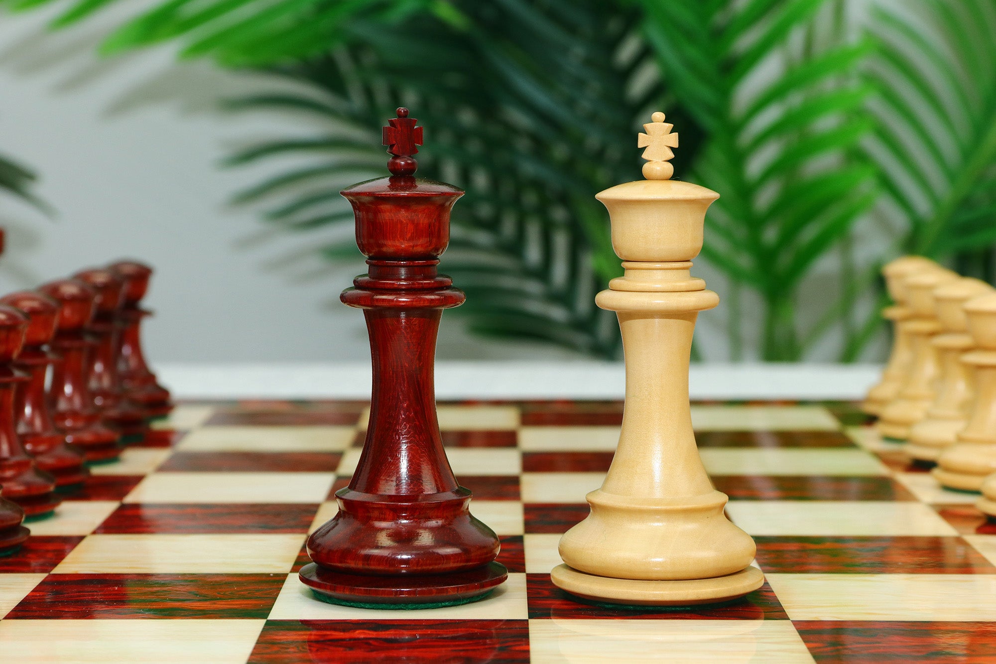 For this exquisite set, we use high-quality African Padauk wood for the dark pieces and natural Boxwood for the light pieces. African Padauk offers a rich reddish hue and superior hardness, ensuring strength, stability, and long-lasting beauty. The Boxwood pieces provide a smooth, creamy contrast that enhances the overall visual balance of the set.