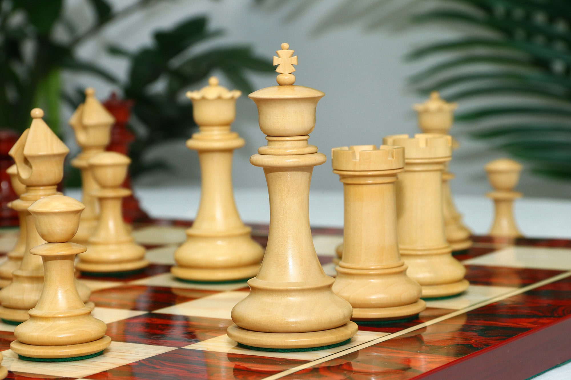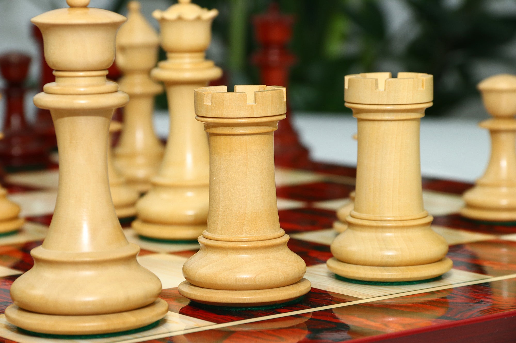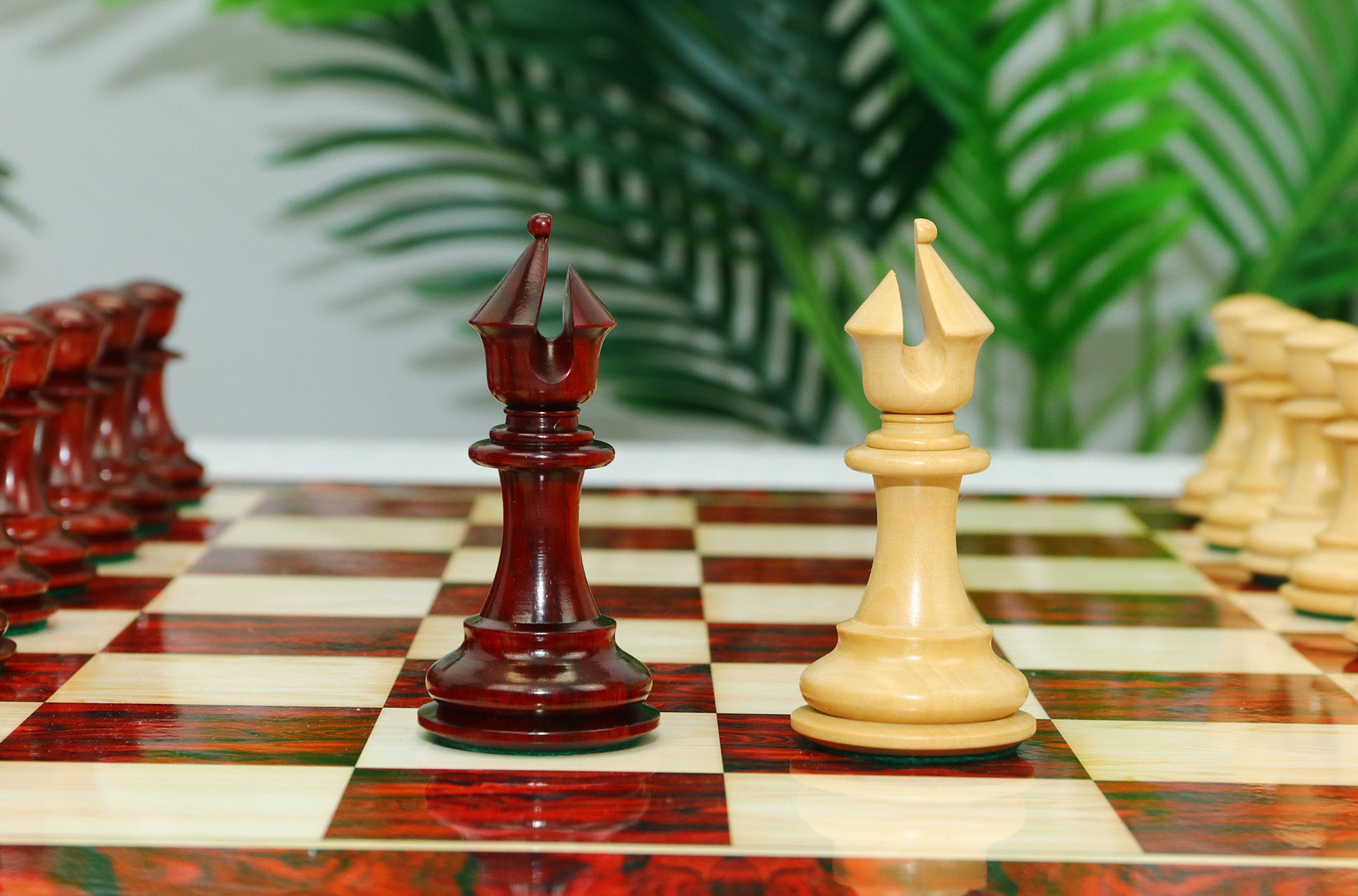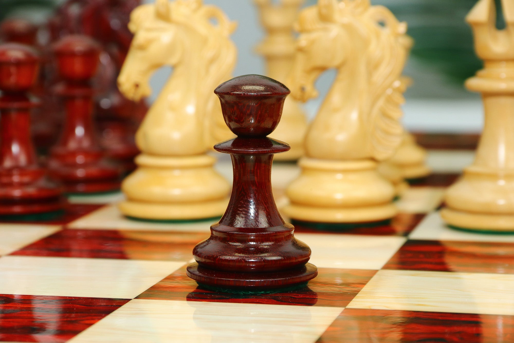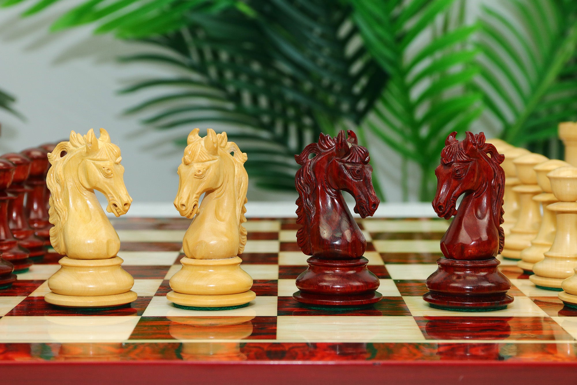 For this exquisite set, we use high-quality African Padauk wood for the dark pieces and natural Boxwood for the light pieces. African Padauk offers a rich reddish hue and superior hardness, ensuring strength, stability, and long-lasting beauty. The Boxwood pieces provide a smooth, creamy contrast that enhances the overall visual balance of the set.