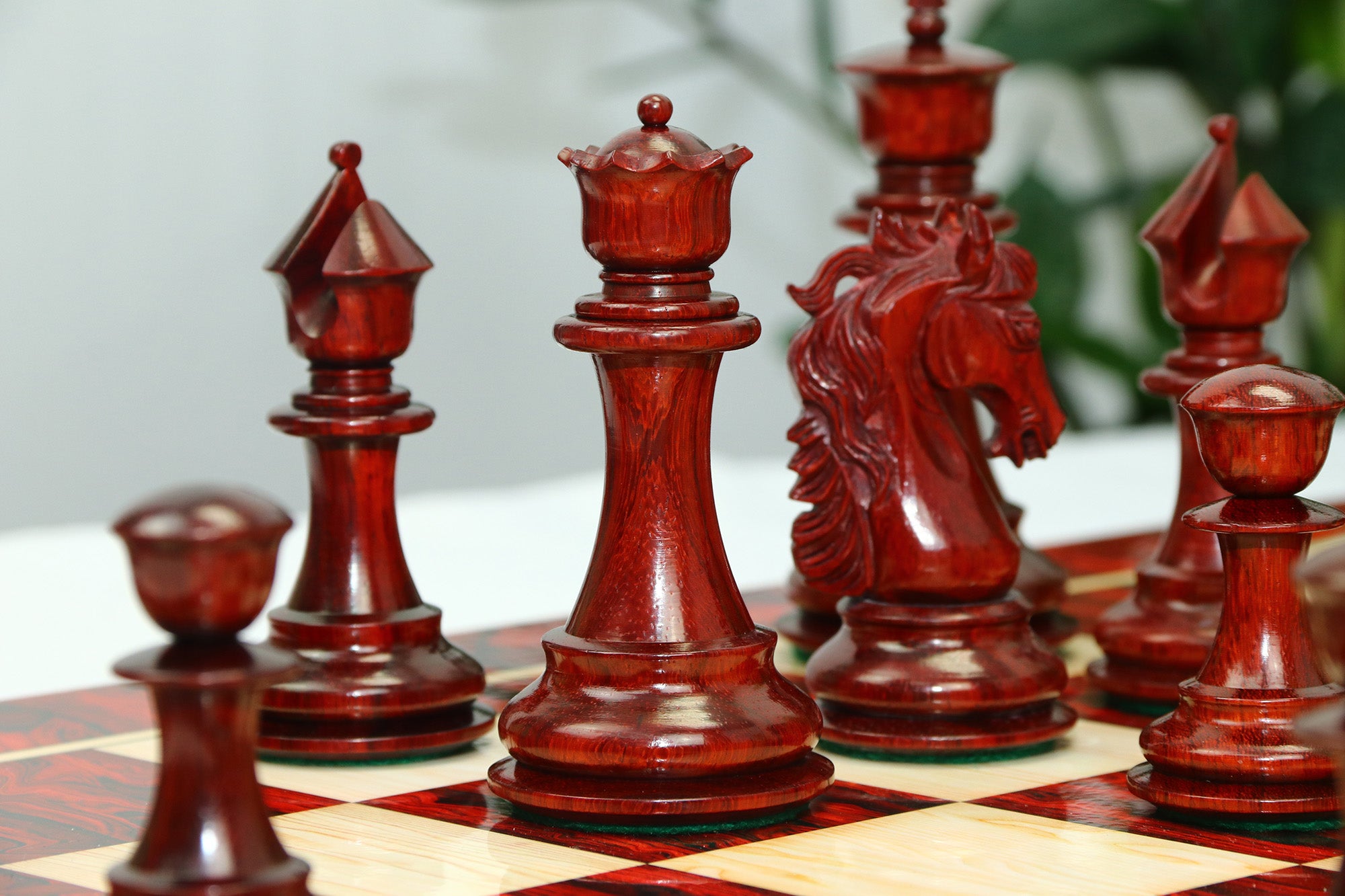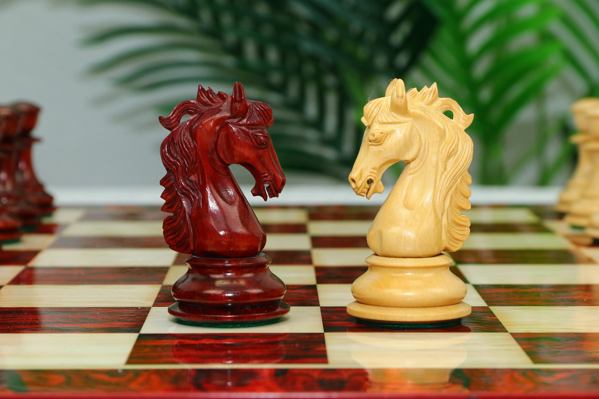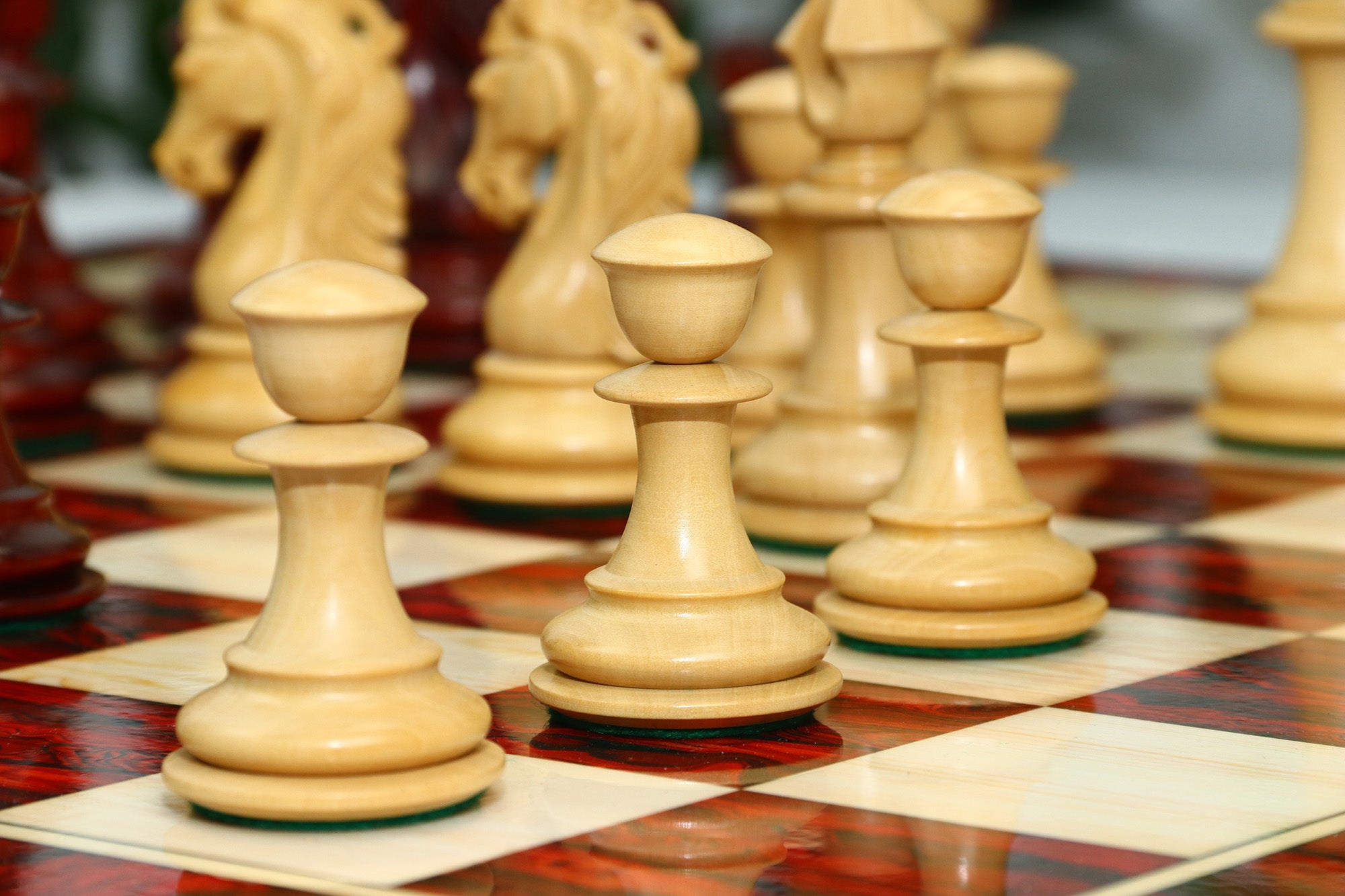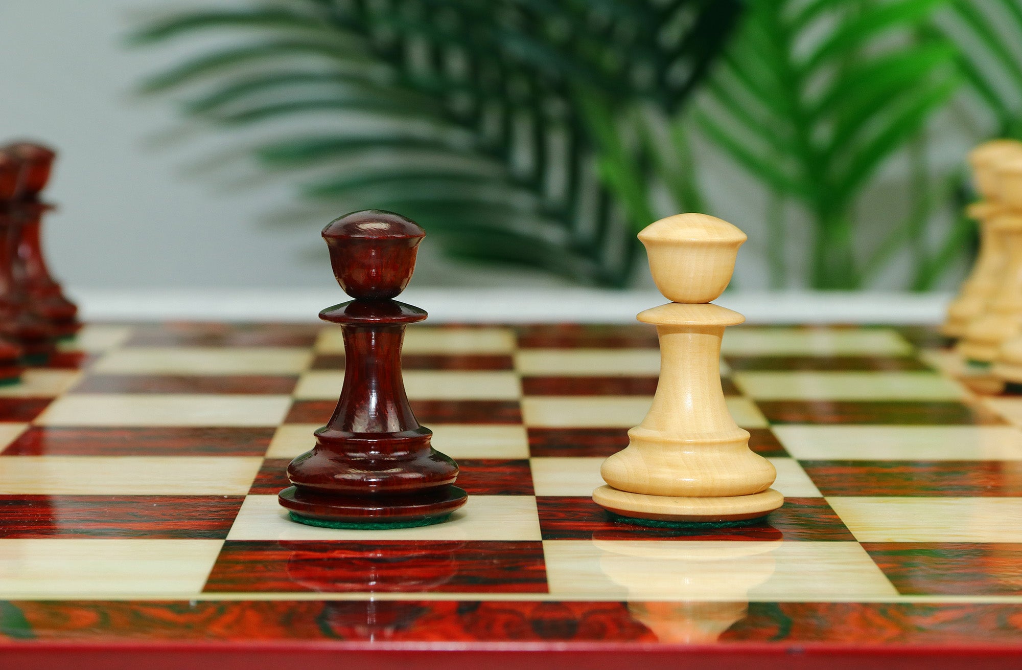 For this exquisite set, we use high-quality African Padauk wood for the dark pieces and natural Boxwood for the light pieces. African Padauk offers a rich reddish hue and superior hardness, ensuring strength, stability, and long-lasting beauty. The Boxwood pieces provide a smooth, creamy contrast that enhances the overall visual balance of the set.