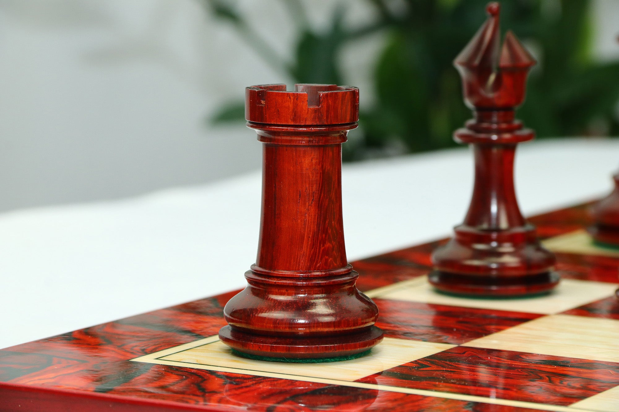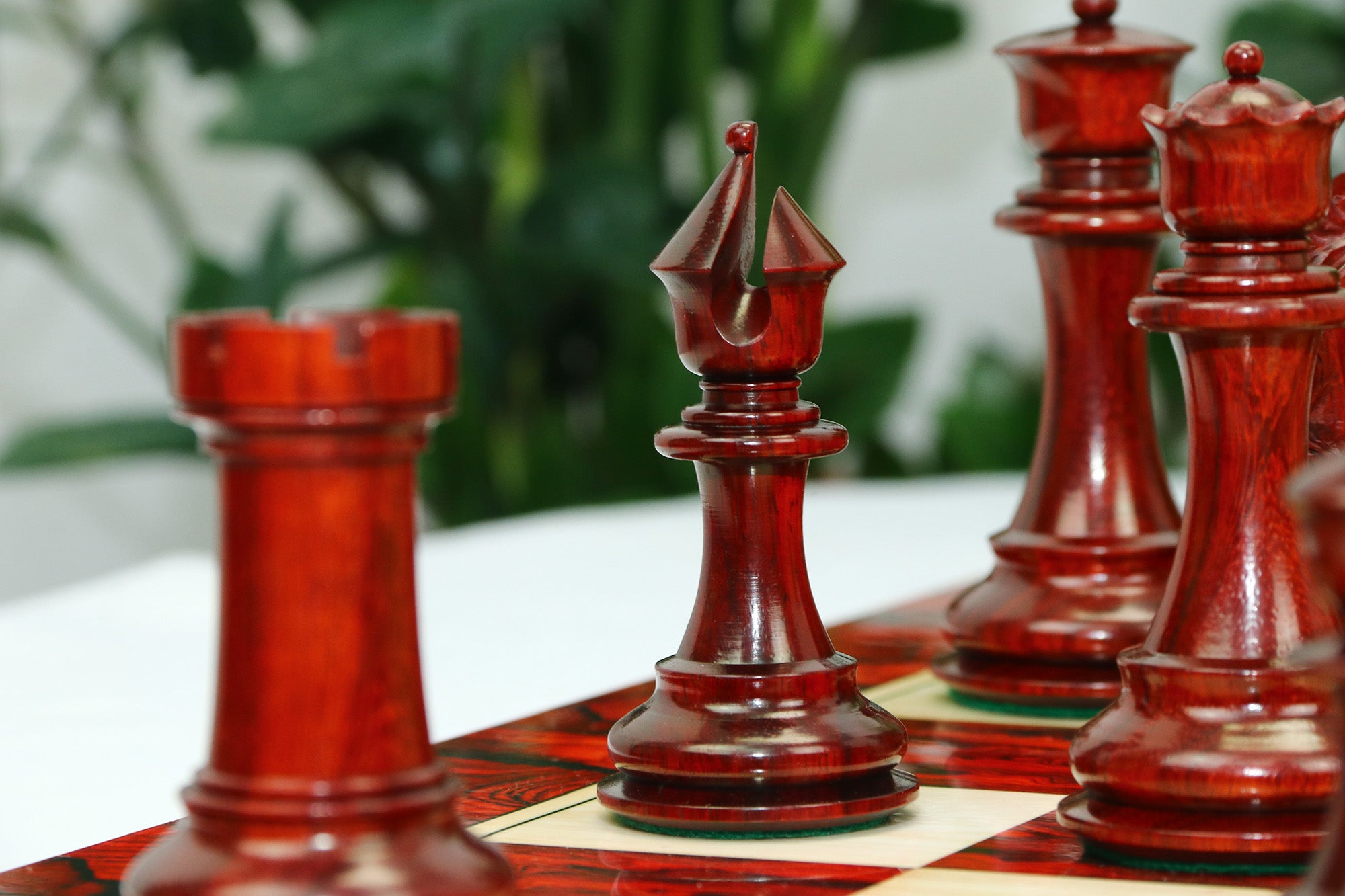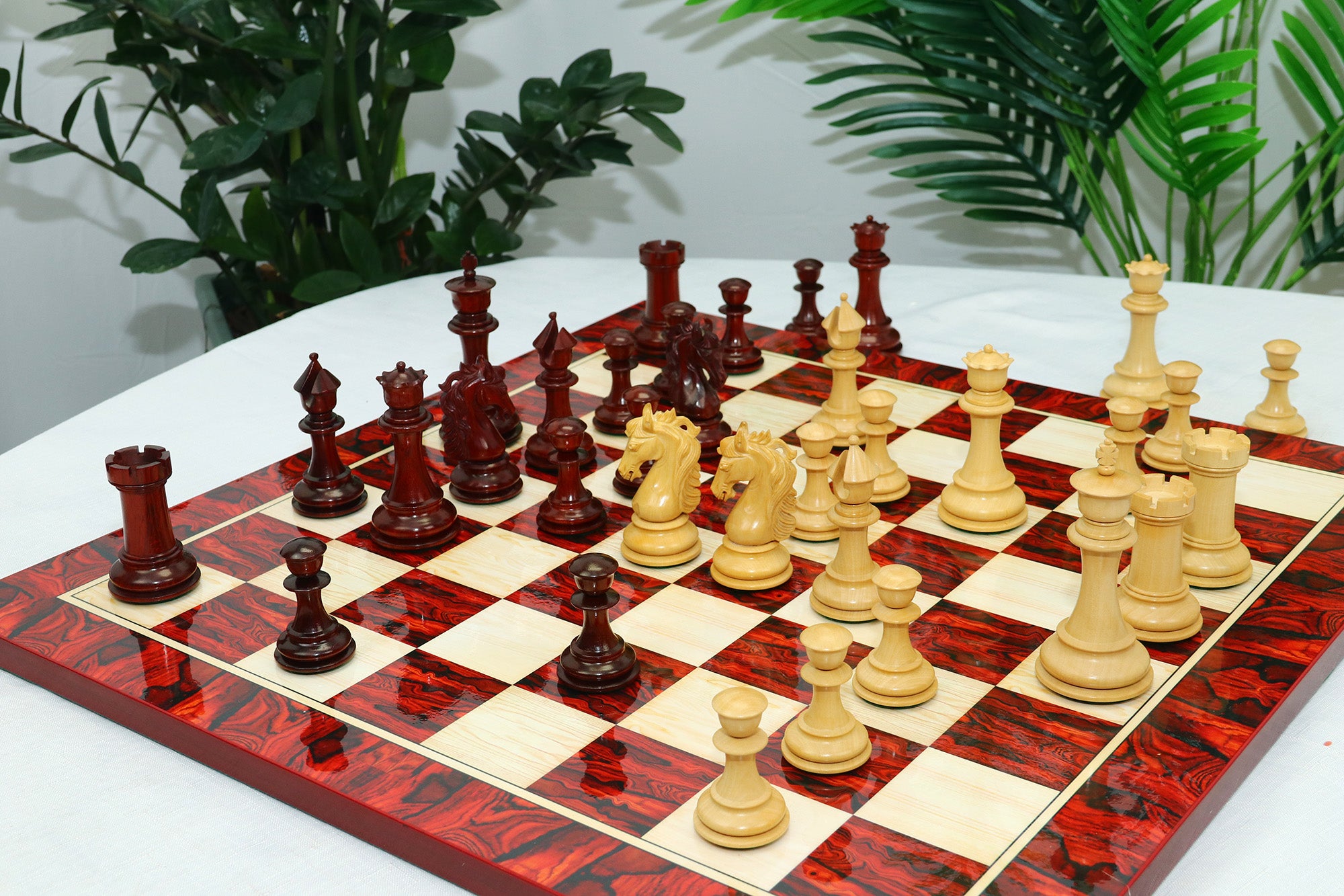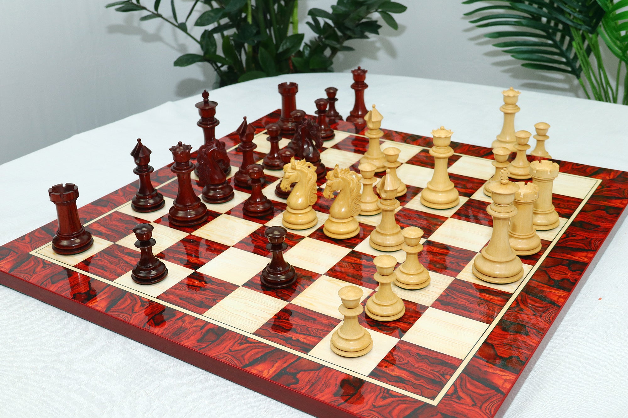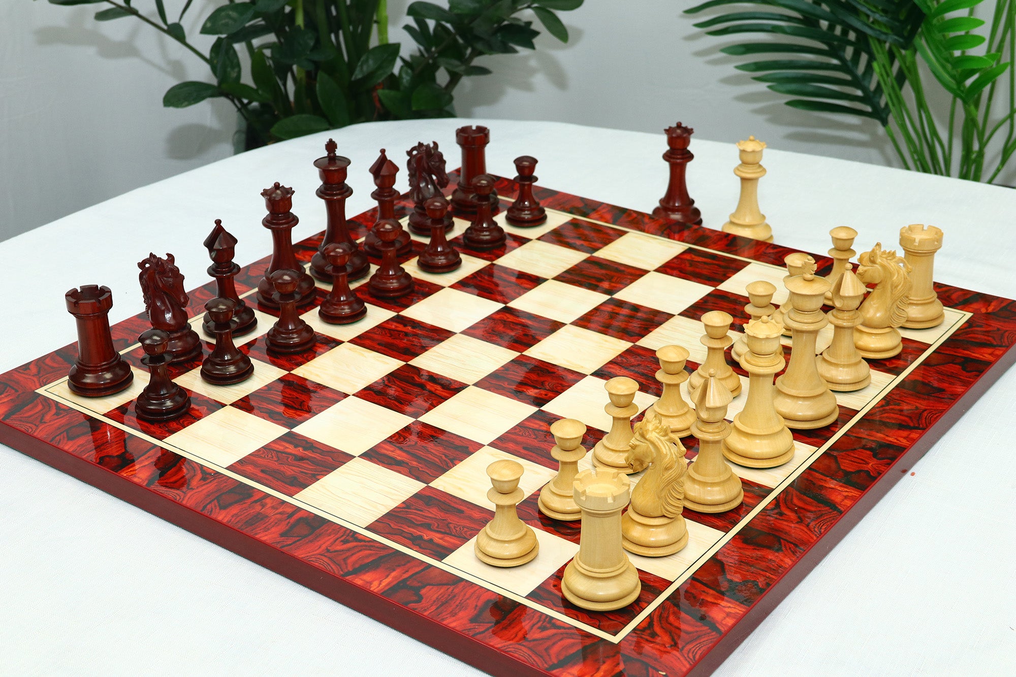 For this exquisite set, we use high-quality African Padauk wood for the dark pieces and natural Boxwood for the light pieces. African Padauk offers a rich reddish hue and superior hardness, ensuring strength, stability, and long-lasting beauty. The Boxwood pieces provide a smooth, creamy contrast that enhances the overall visual balance of the set.