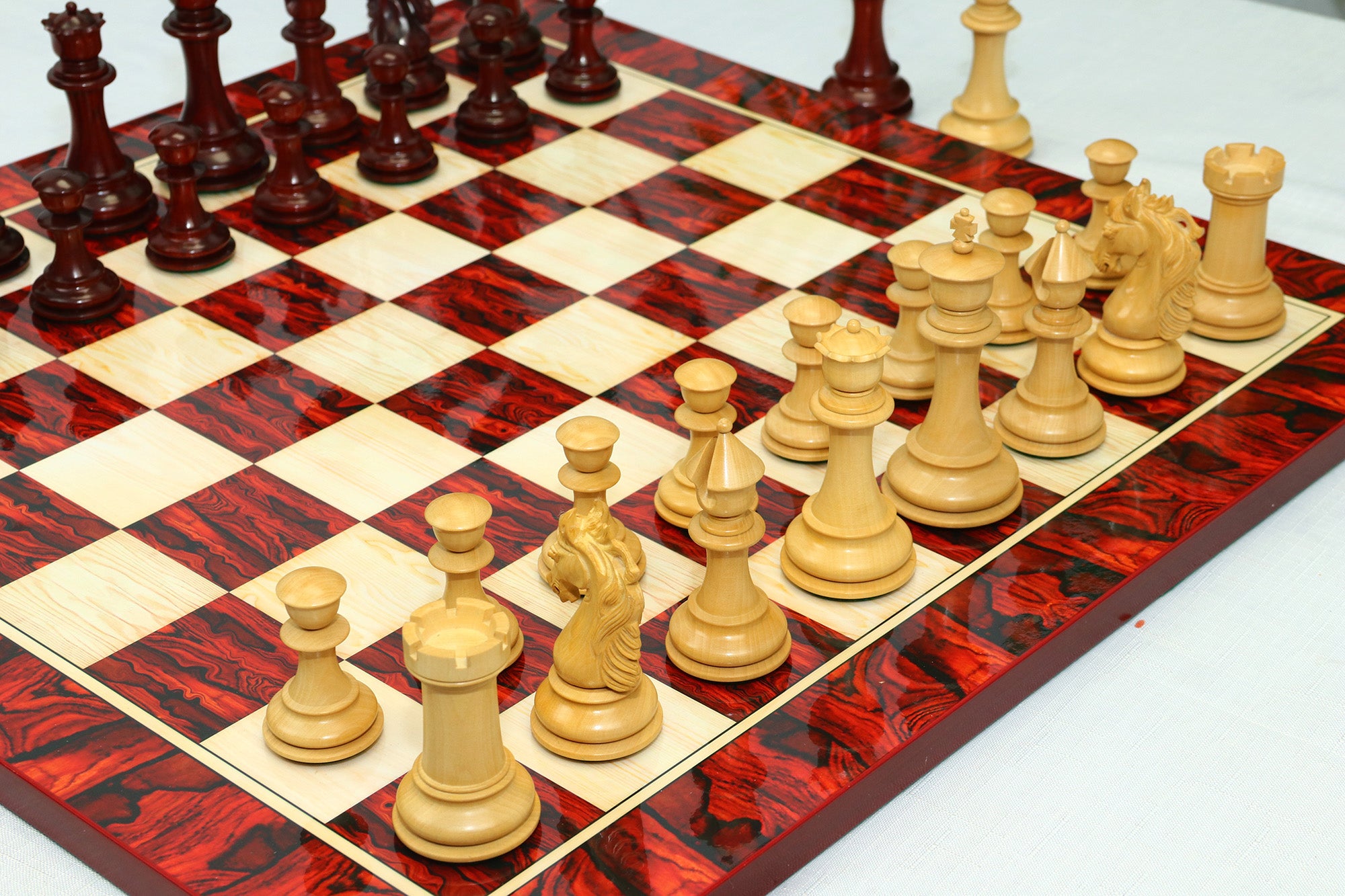 Each chess piece is carefully turned, hand-carved, and polished to perfection. The superb lacquered finish not only highlights the natural grain of the wood but also provides excellent durability and protection.