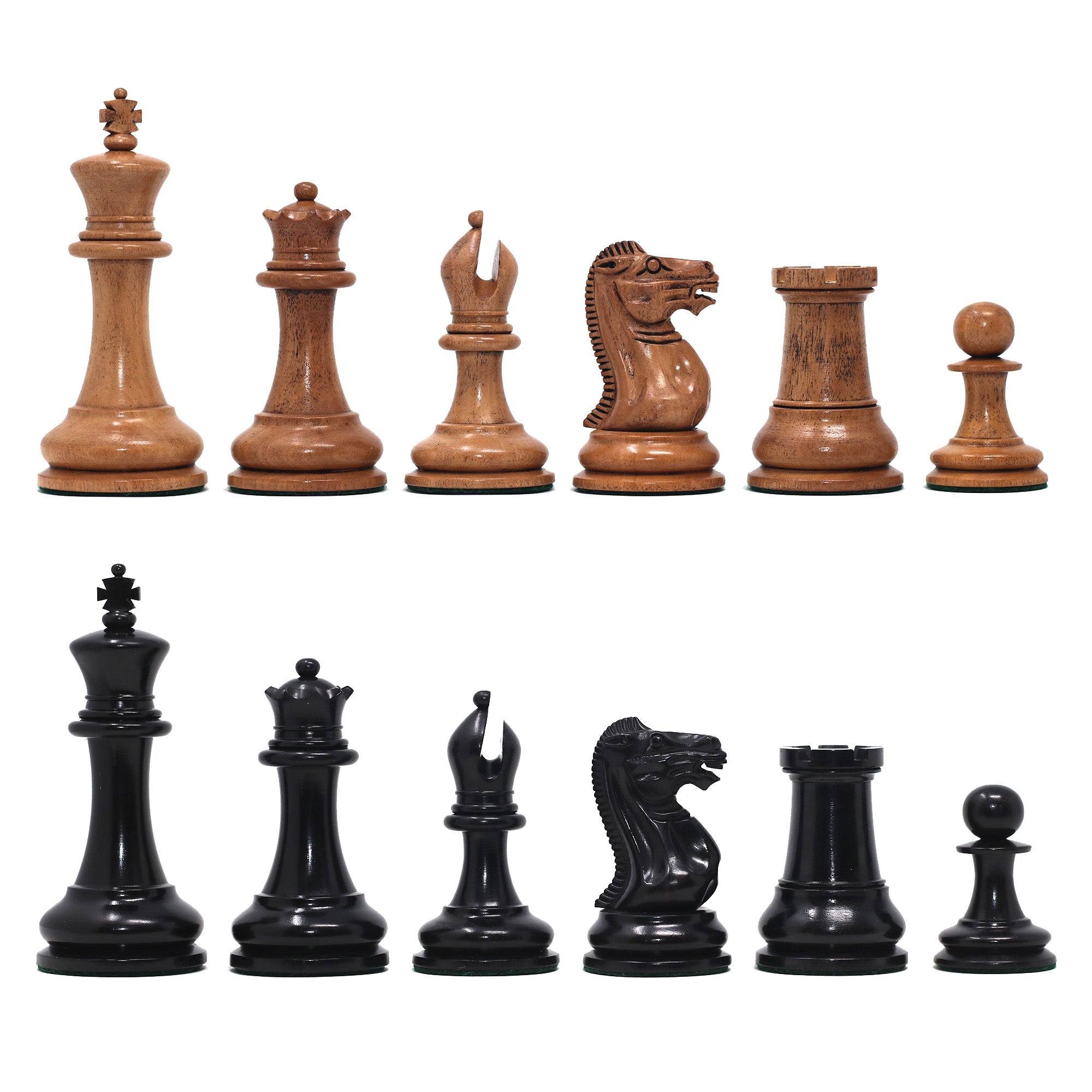 This tournament sized Chess set features a 3.75" King with a 1.5" diameter base. The chess pieces are hand carved by our highly-skilled artisans out of the highest grade woods. The chess pieces are perfectly balanced and heavily weighted and felted and are beautifully finished.