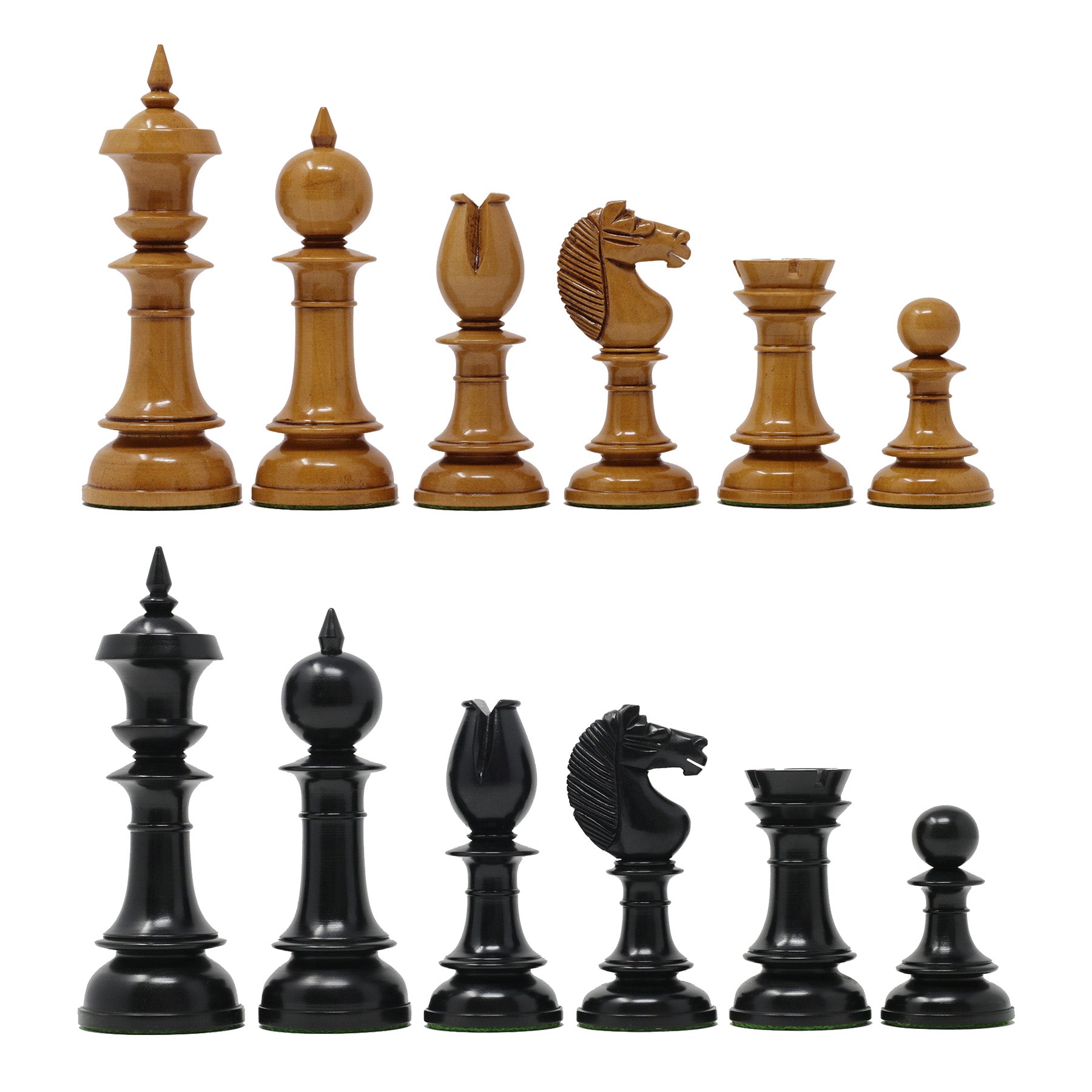 The set is carved from Boxwood & genuine Ebony, and the pieces are well-weighted and felted. There is a choice of 3 finishes – plain, antique & distressed antique.