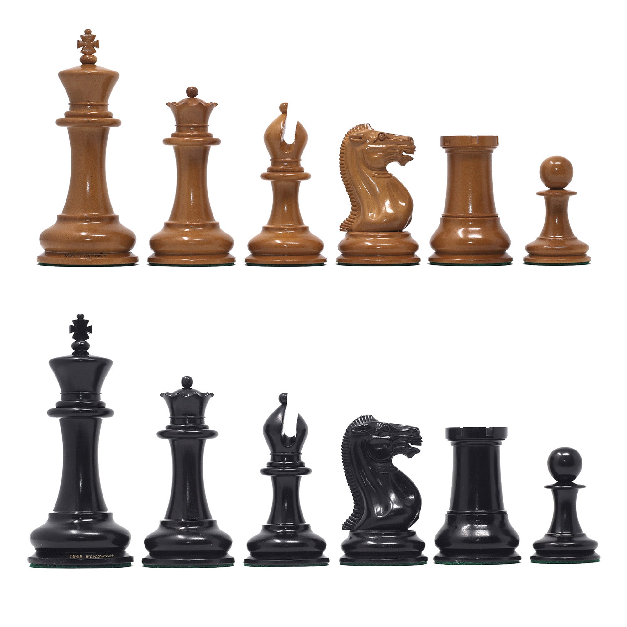 Staunton Castle proudly present their very latest, carefully researched and precisely carved reproduction – The Nathaniel Cooke 1849 Set Distinctive features of this set include the Bishops with open-miters and the unique design of the Knights, which was apparently inspired by the noble horses from the Elgin Marbles (Greek Parthenon). |