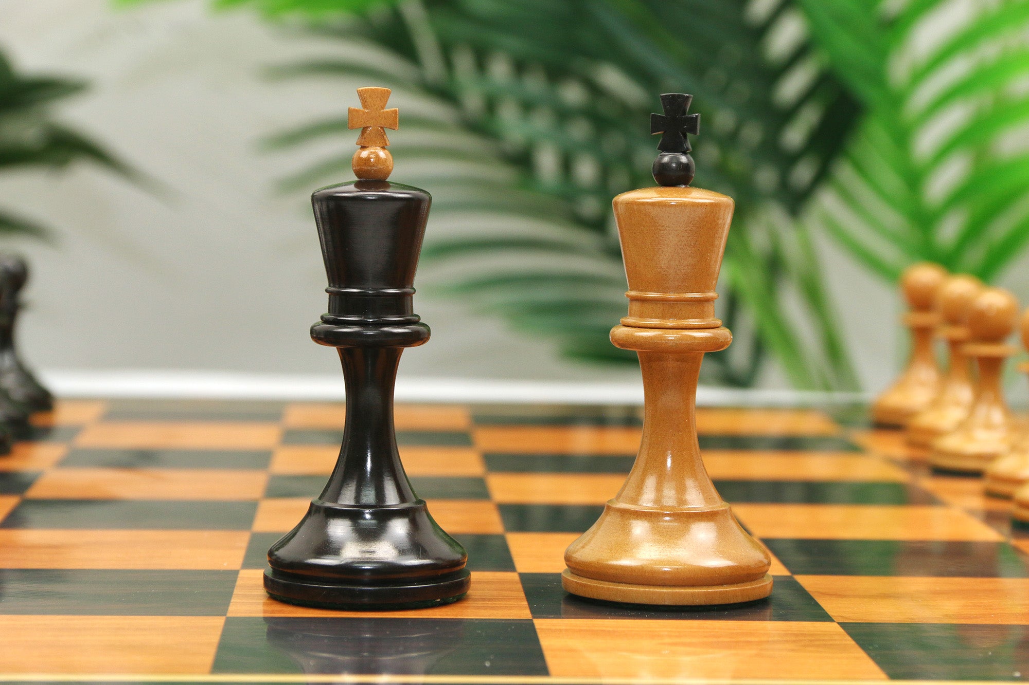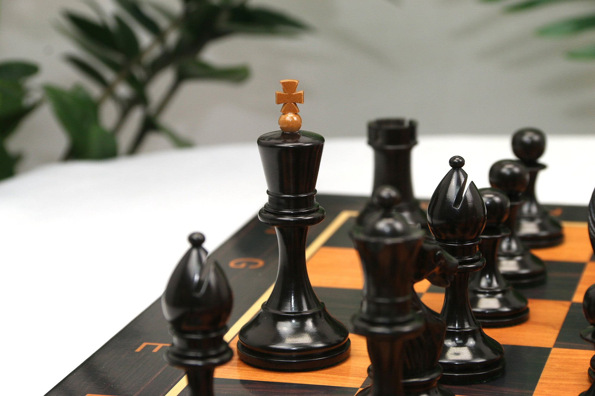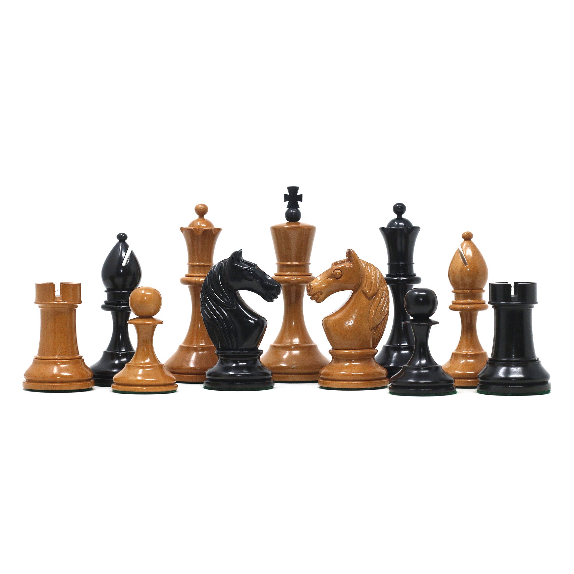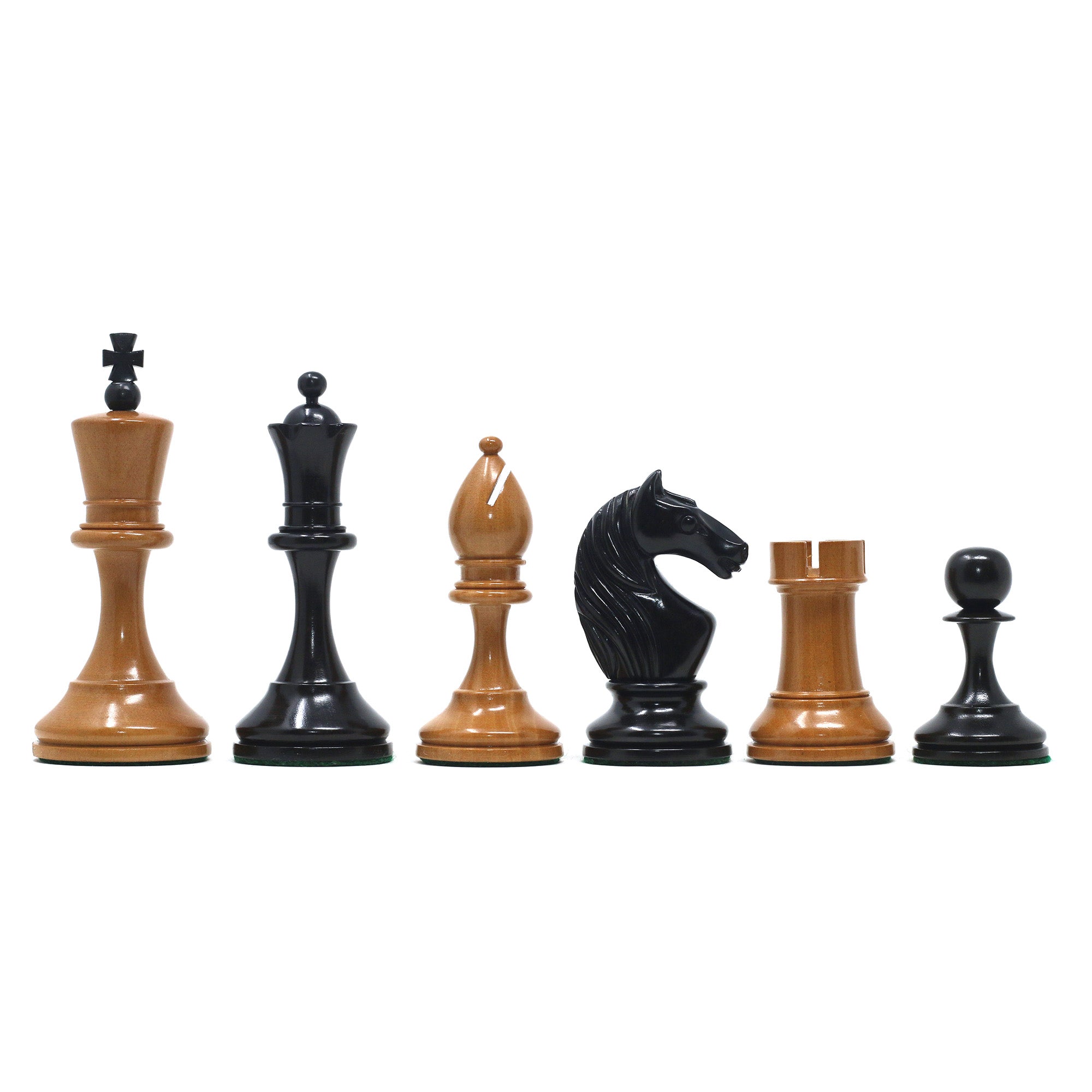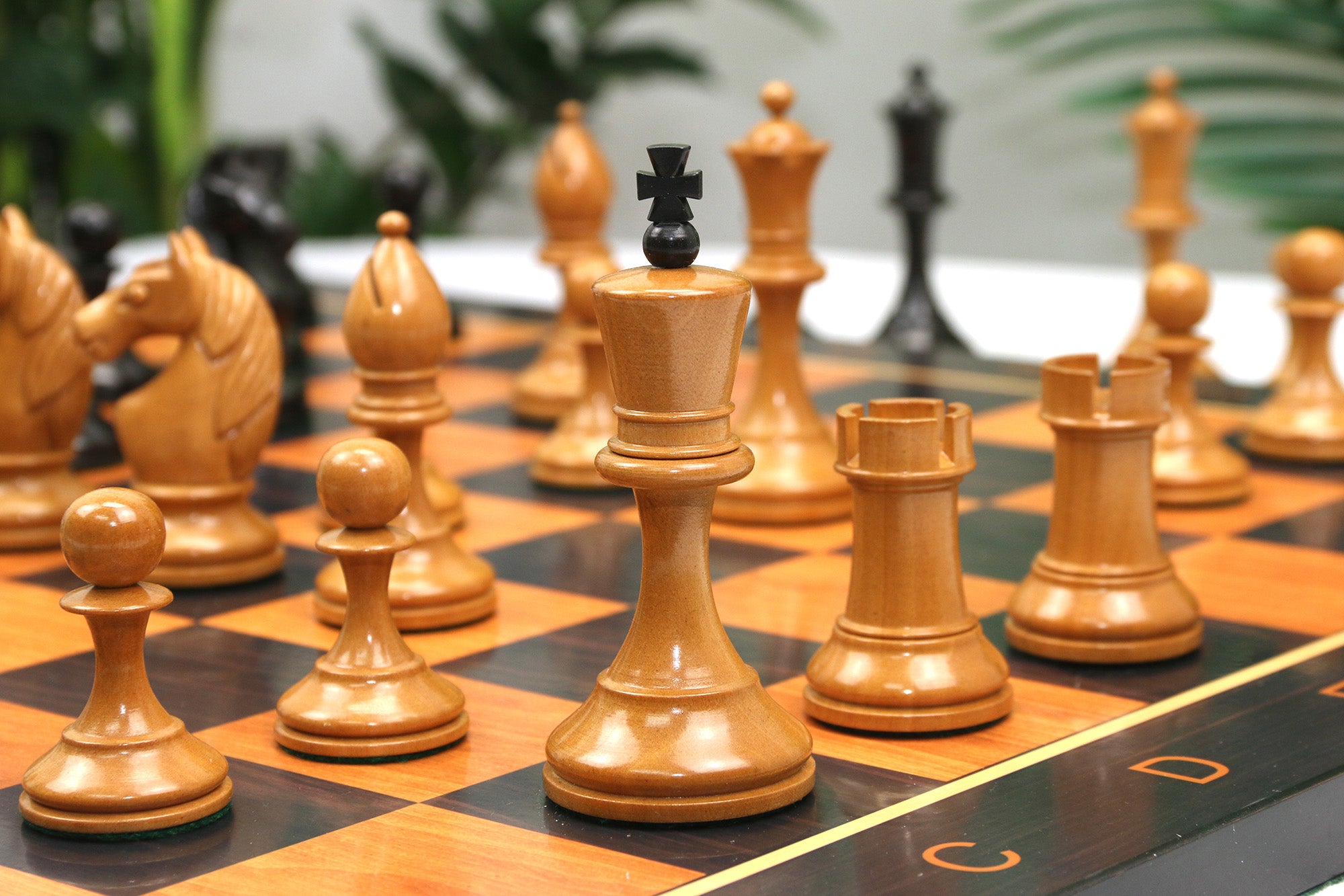 Crafted in antiqued boxwood chess pieces for the light army and premium ebony wood chess pieces for the dark, the set evokes the dignified patina and gravitas of early 20th-century tournament chess sets while maintaining exceptional balance and playability for modern use.
