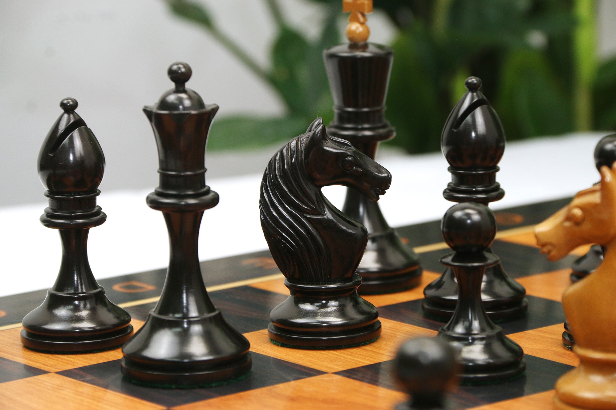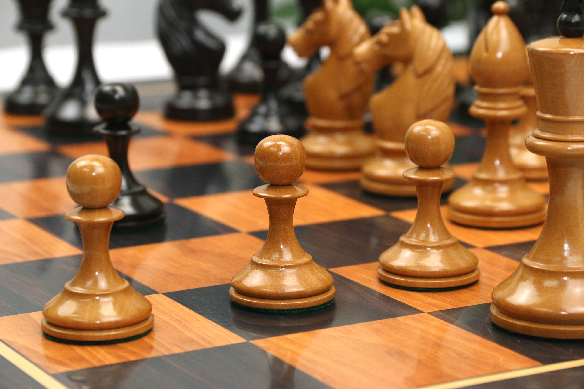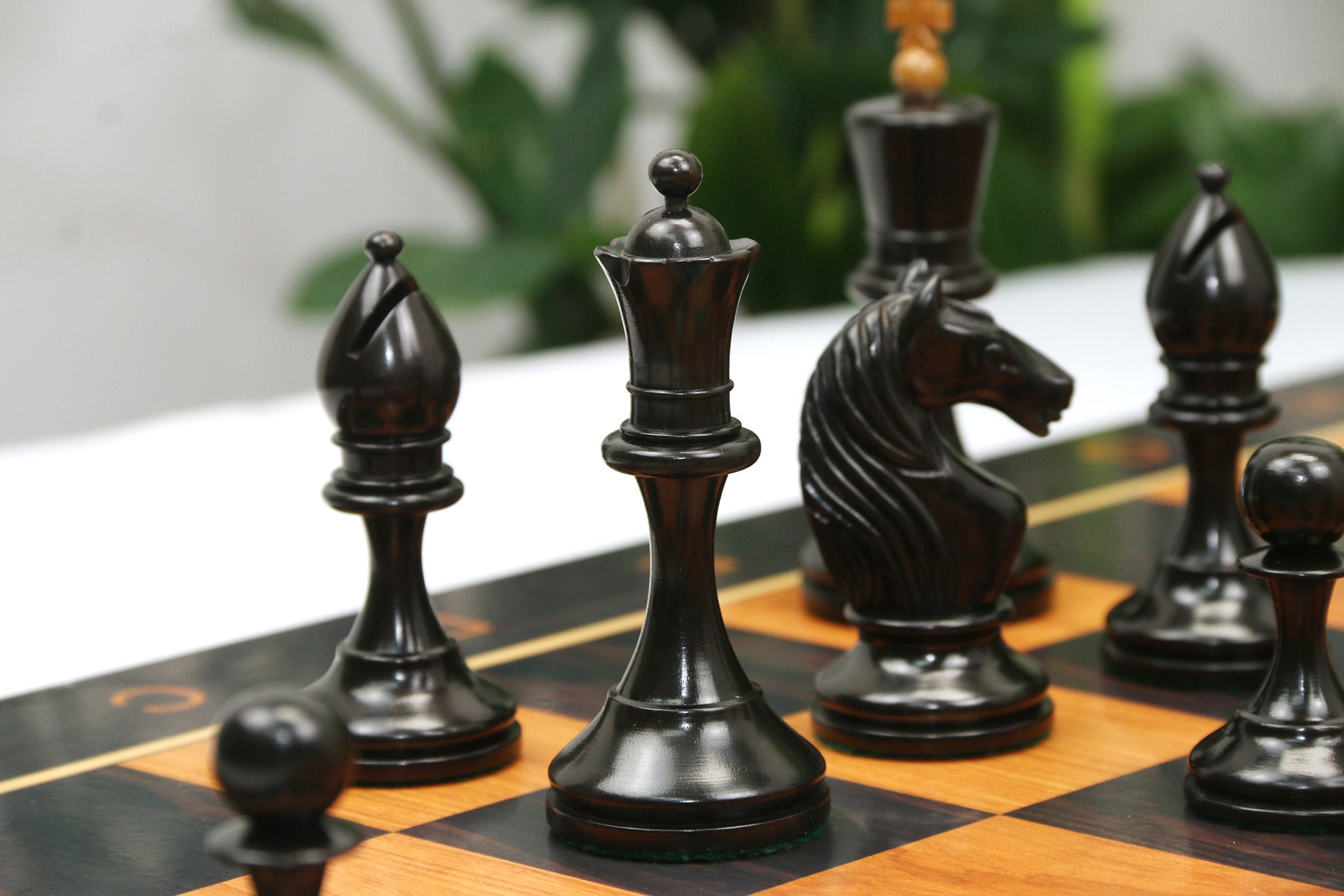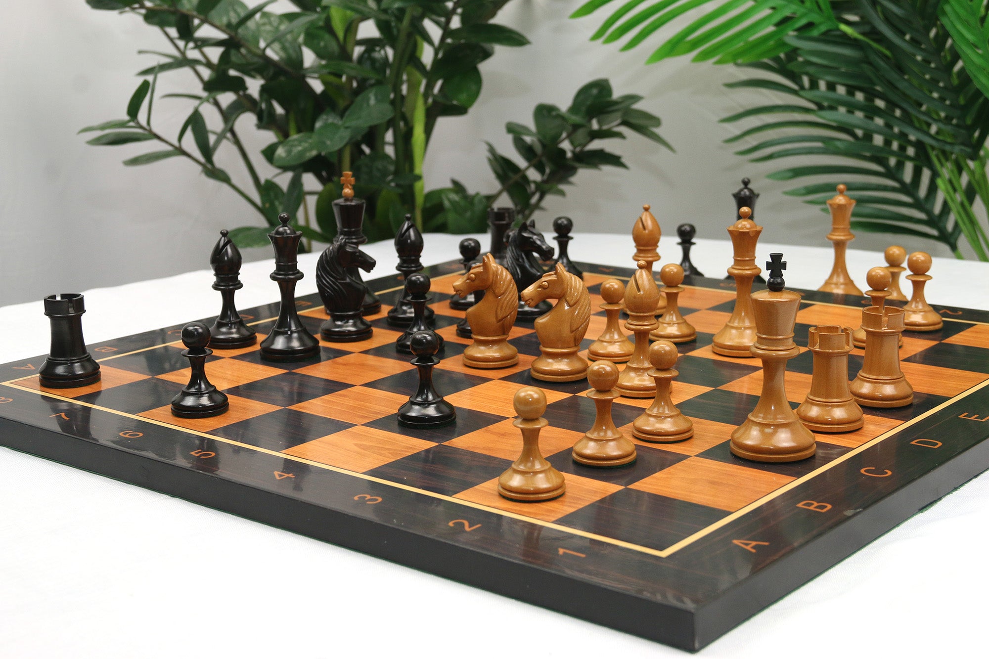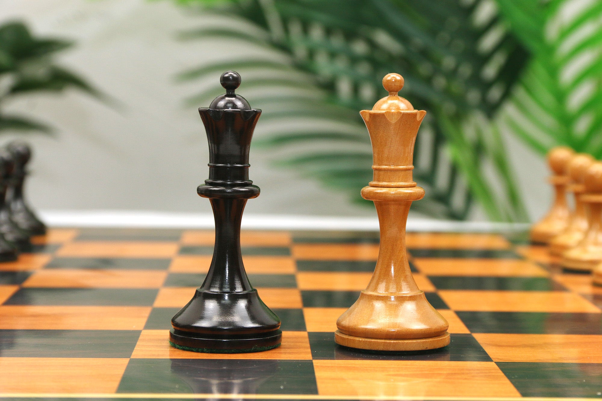 Crafted in antiqued boxwood chess pieces for the light army and premium ebony wood chess pieces for the dark, the set evokes the dignified patina and gravitas of early 20th-century tournament chess sets while maintaining exceptional balance and playability for modern use.