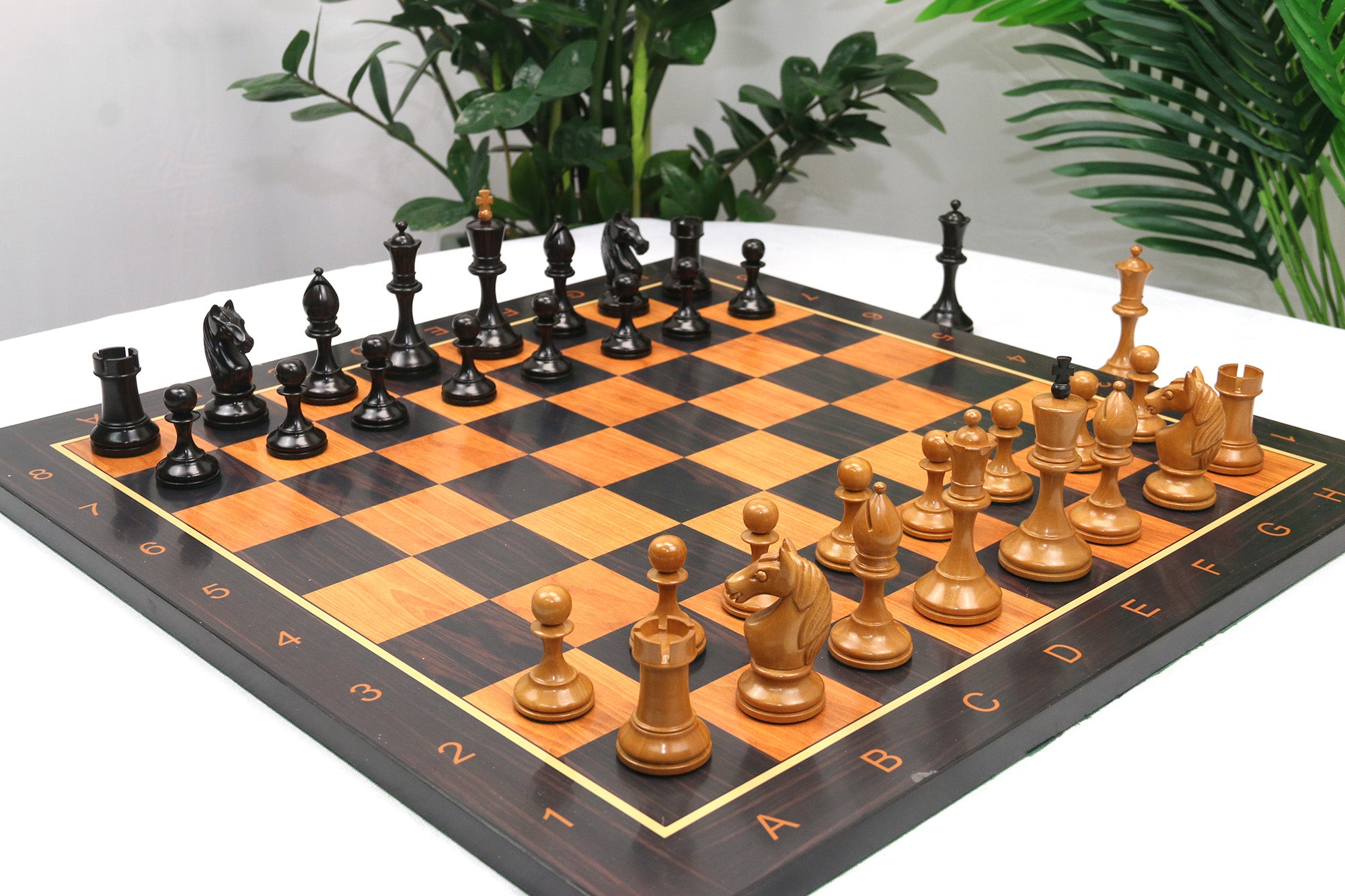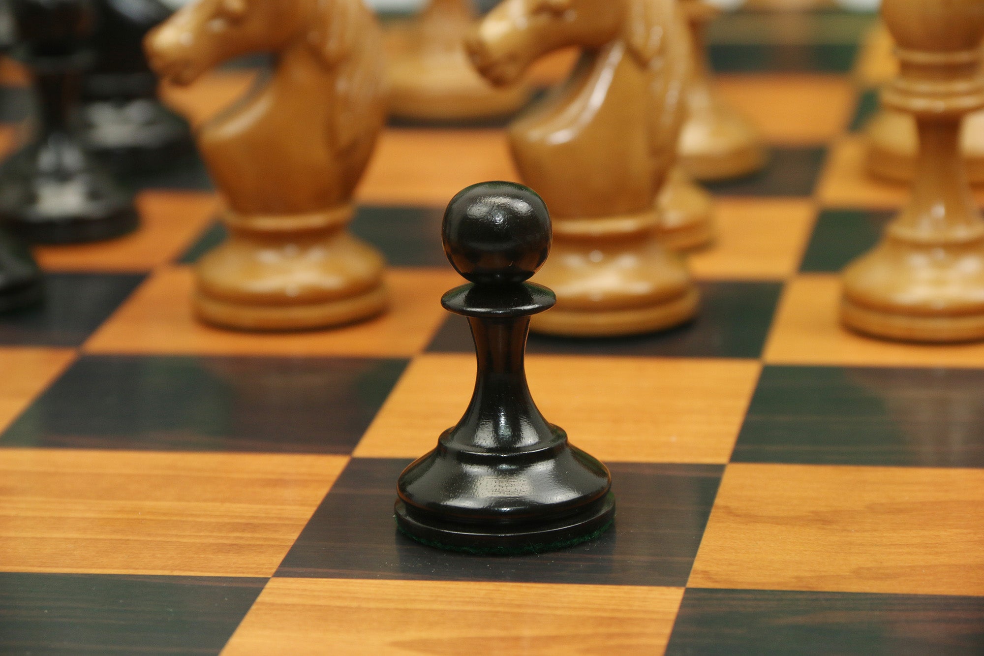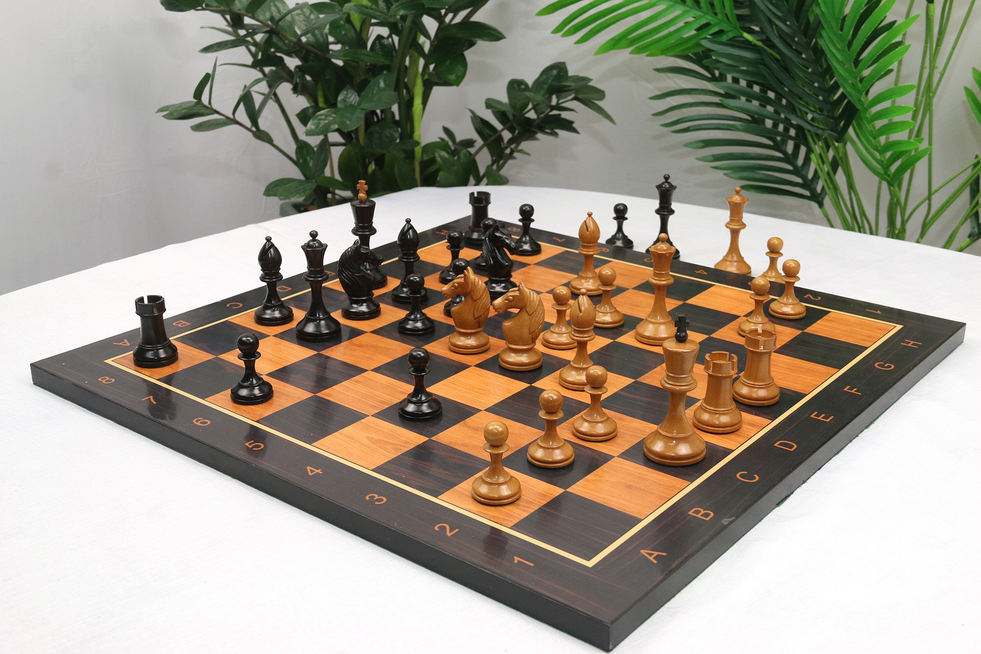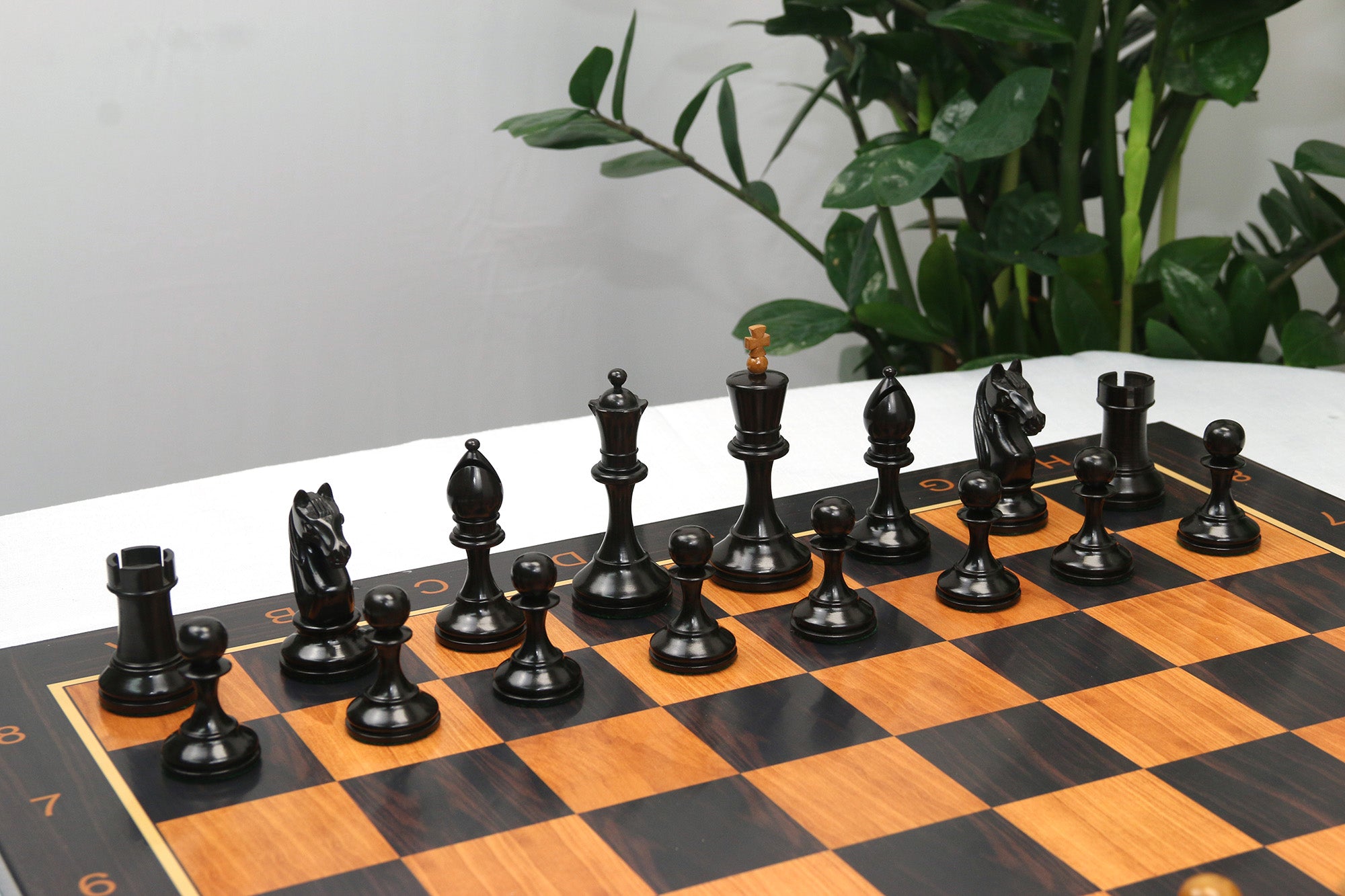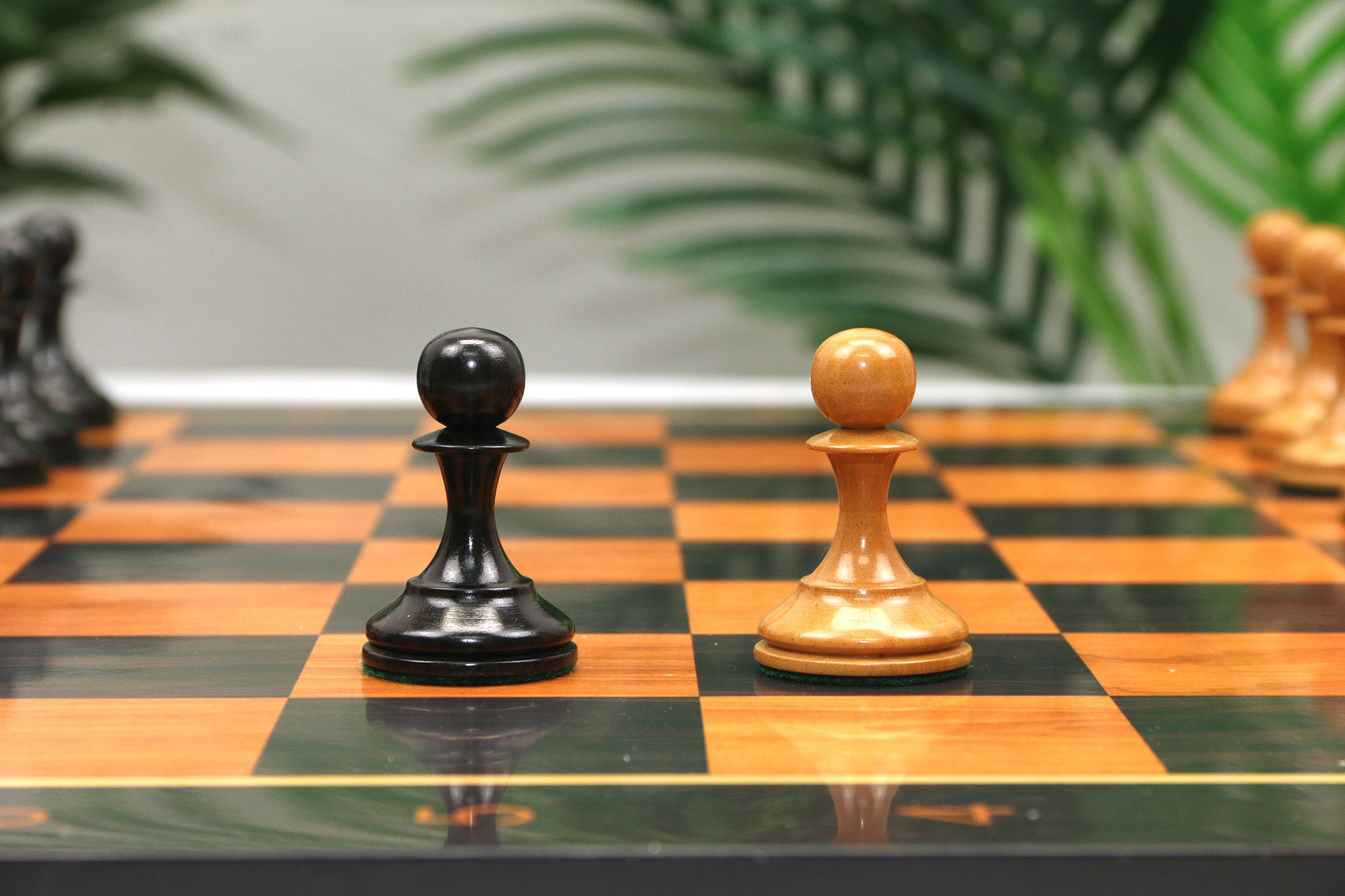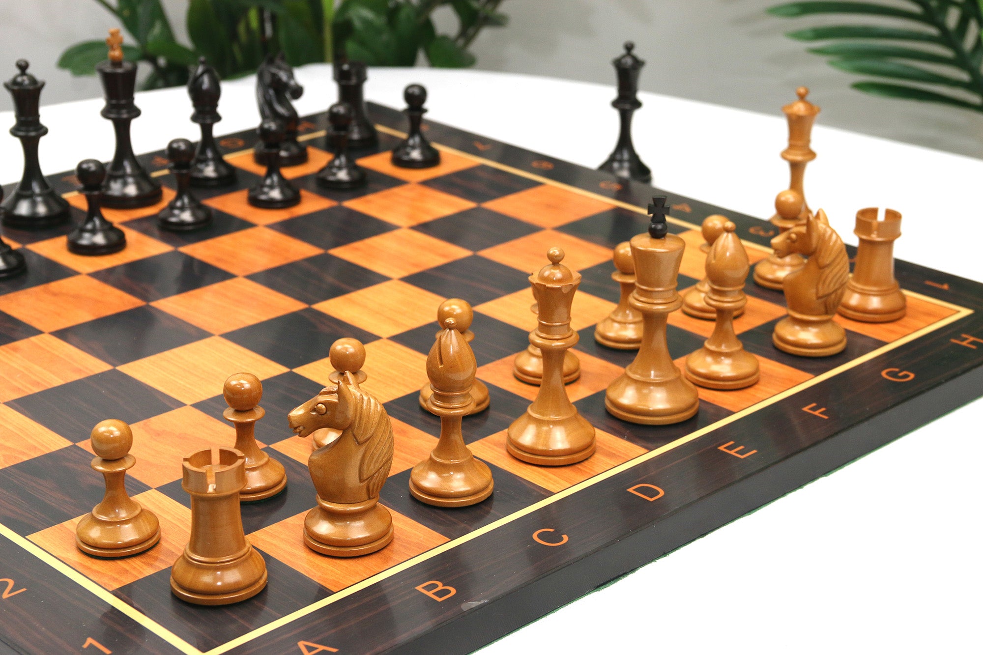 Crafted in antiqued boxwood chess pieces for the light army and premium ebony wood chess pieces for the dark, the set evokes the dignified patina and gravitas of early 20th-century tournament chess sets while maintaining exceptional balance and playability for modern use.
