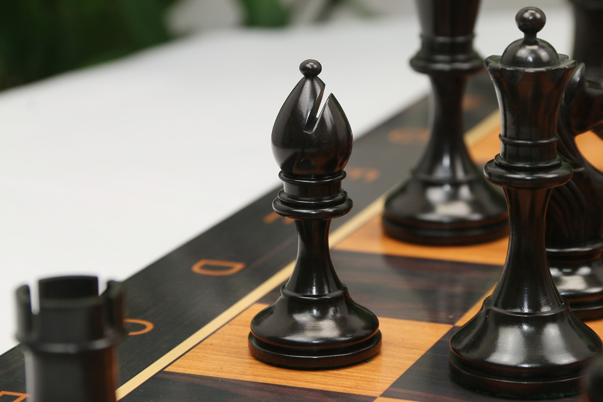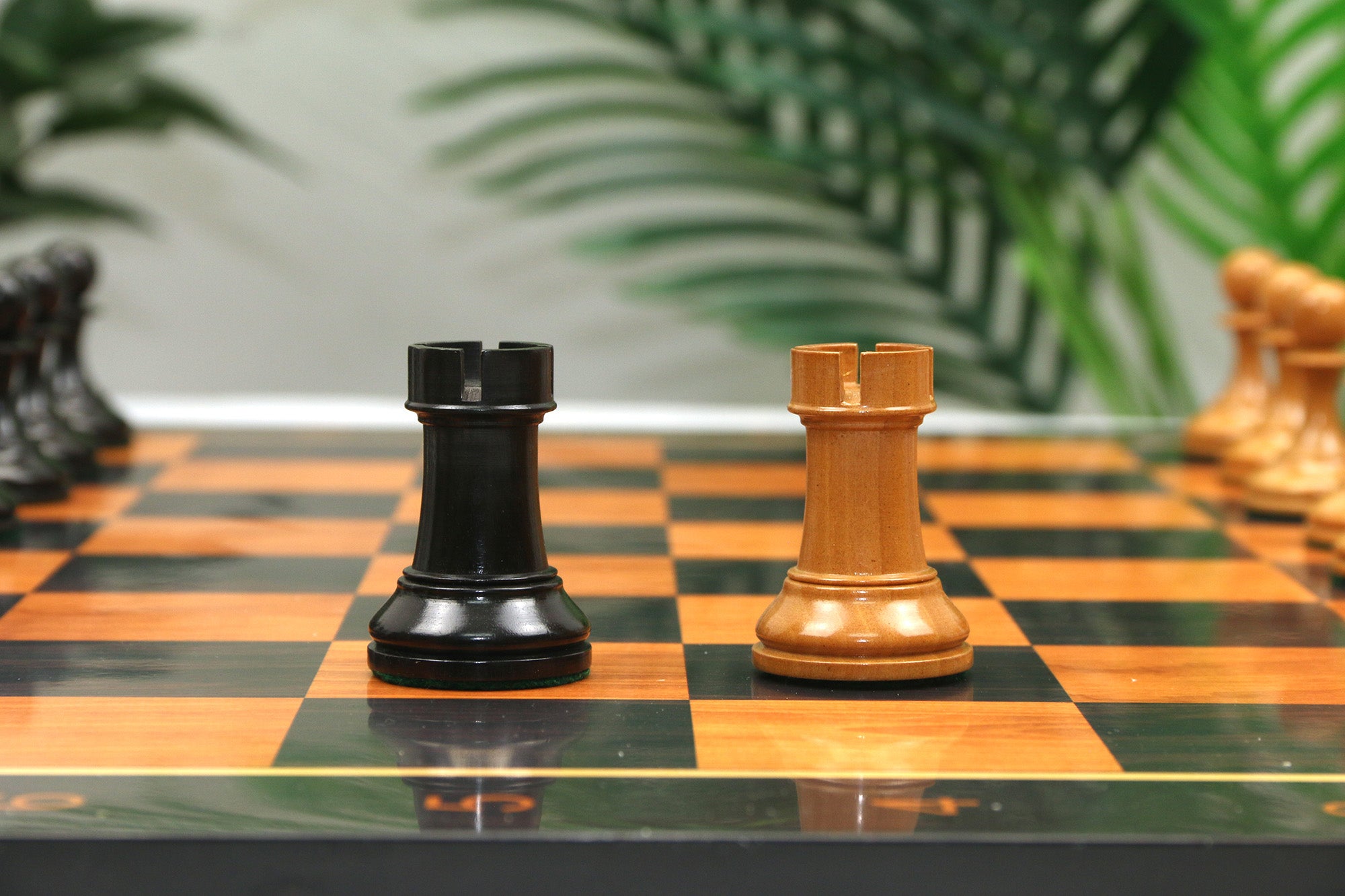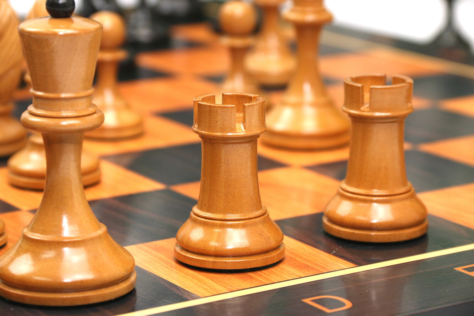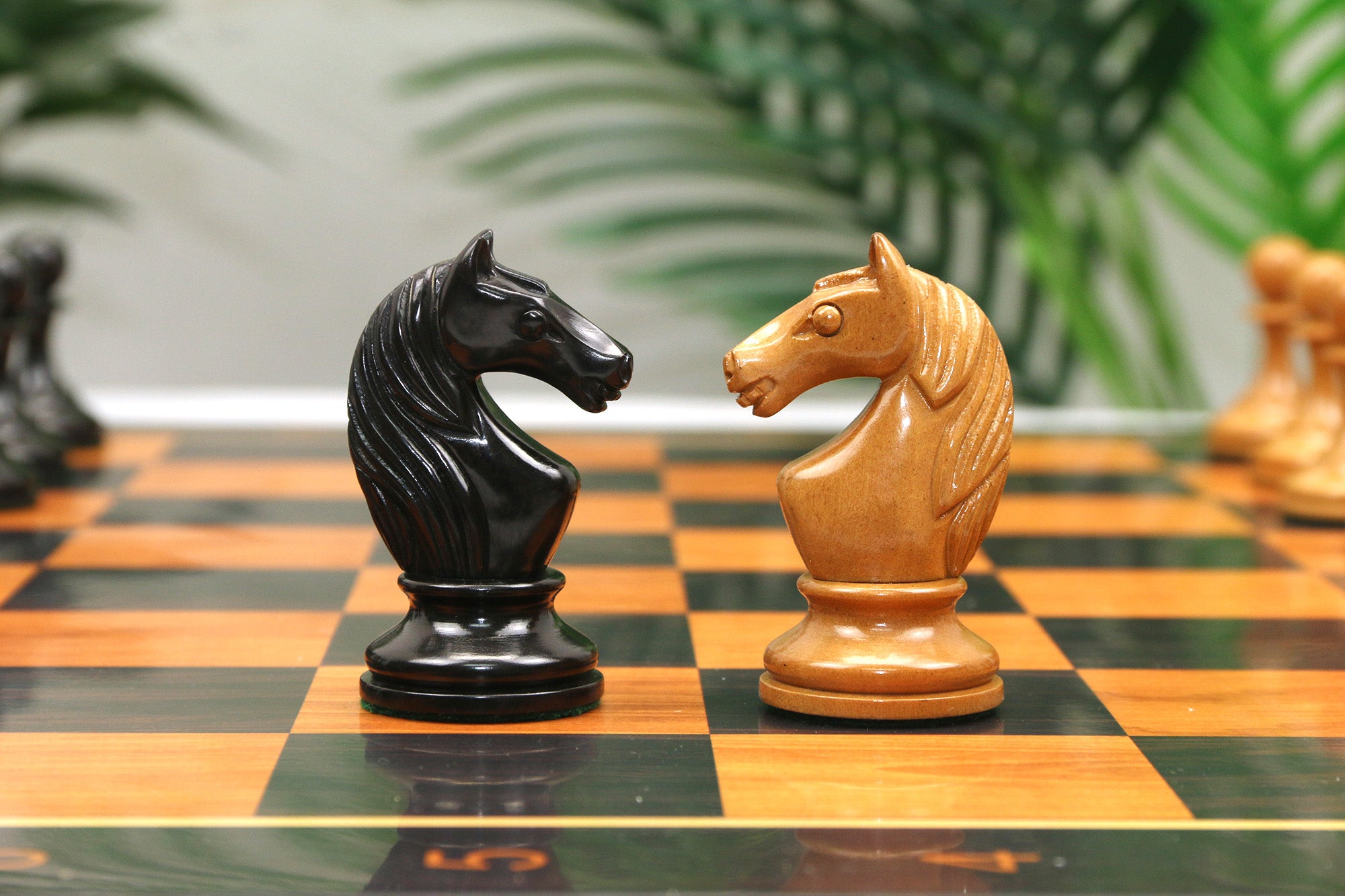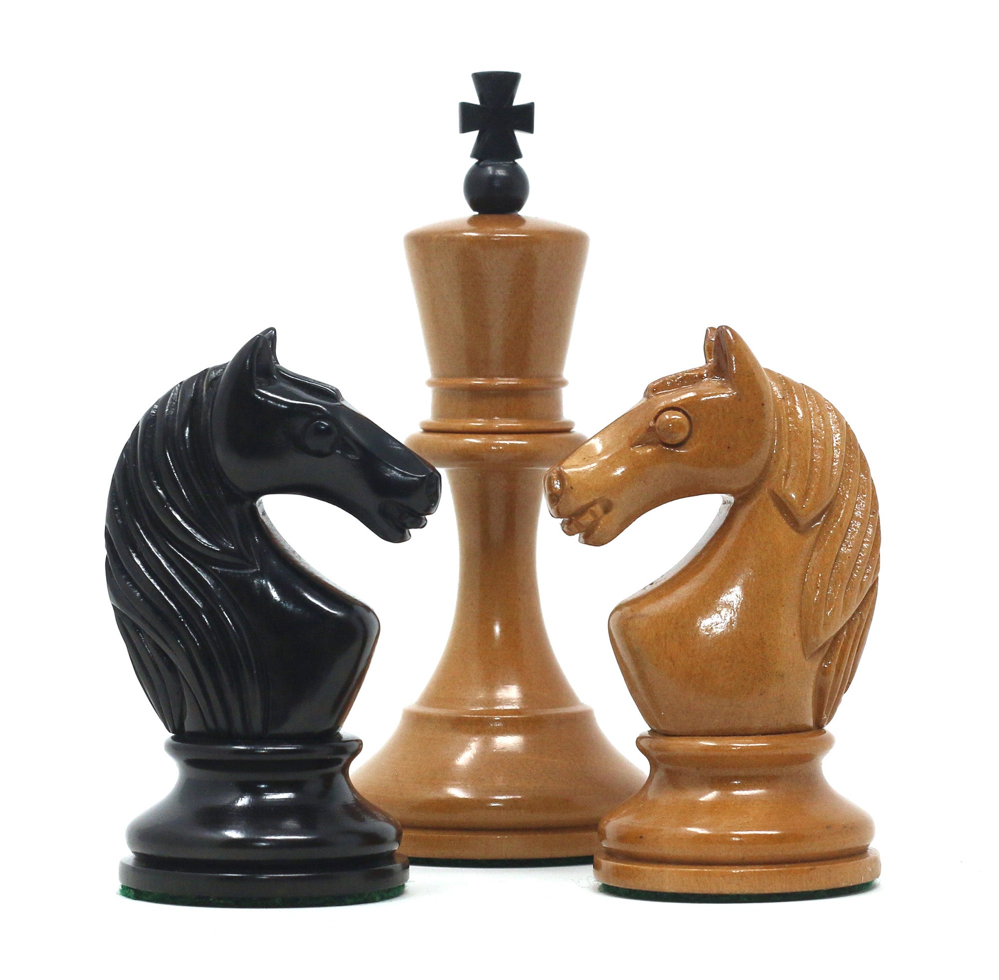 Crafted in antiqued boxwood chess pieces for the light army and premium ebony wood chess pieces for the dark, the set evokes the dignified patina and gravitas of early 20th-century tournament chess sets while maintaining exceptional balance and playability for modern use.