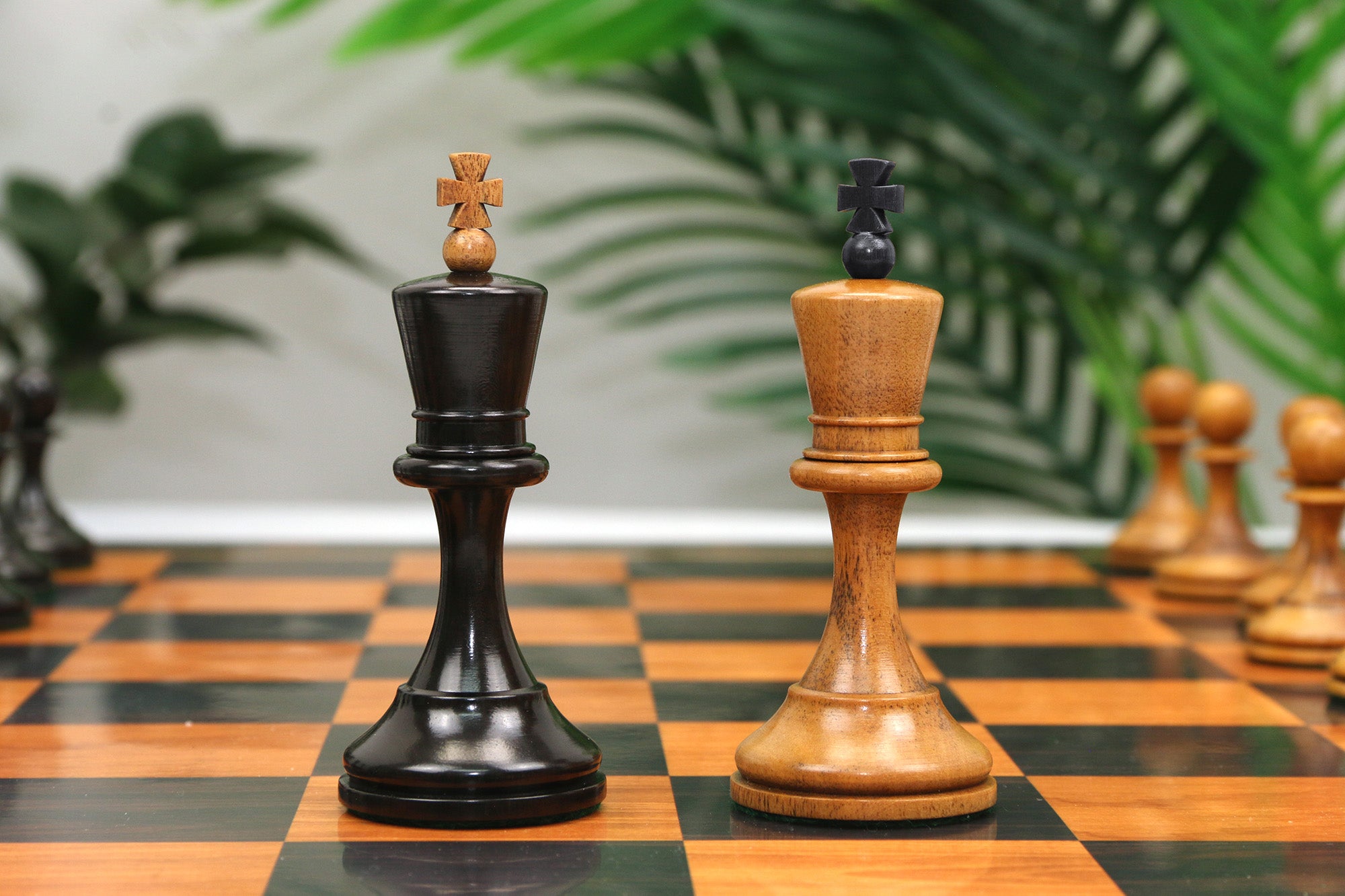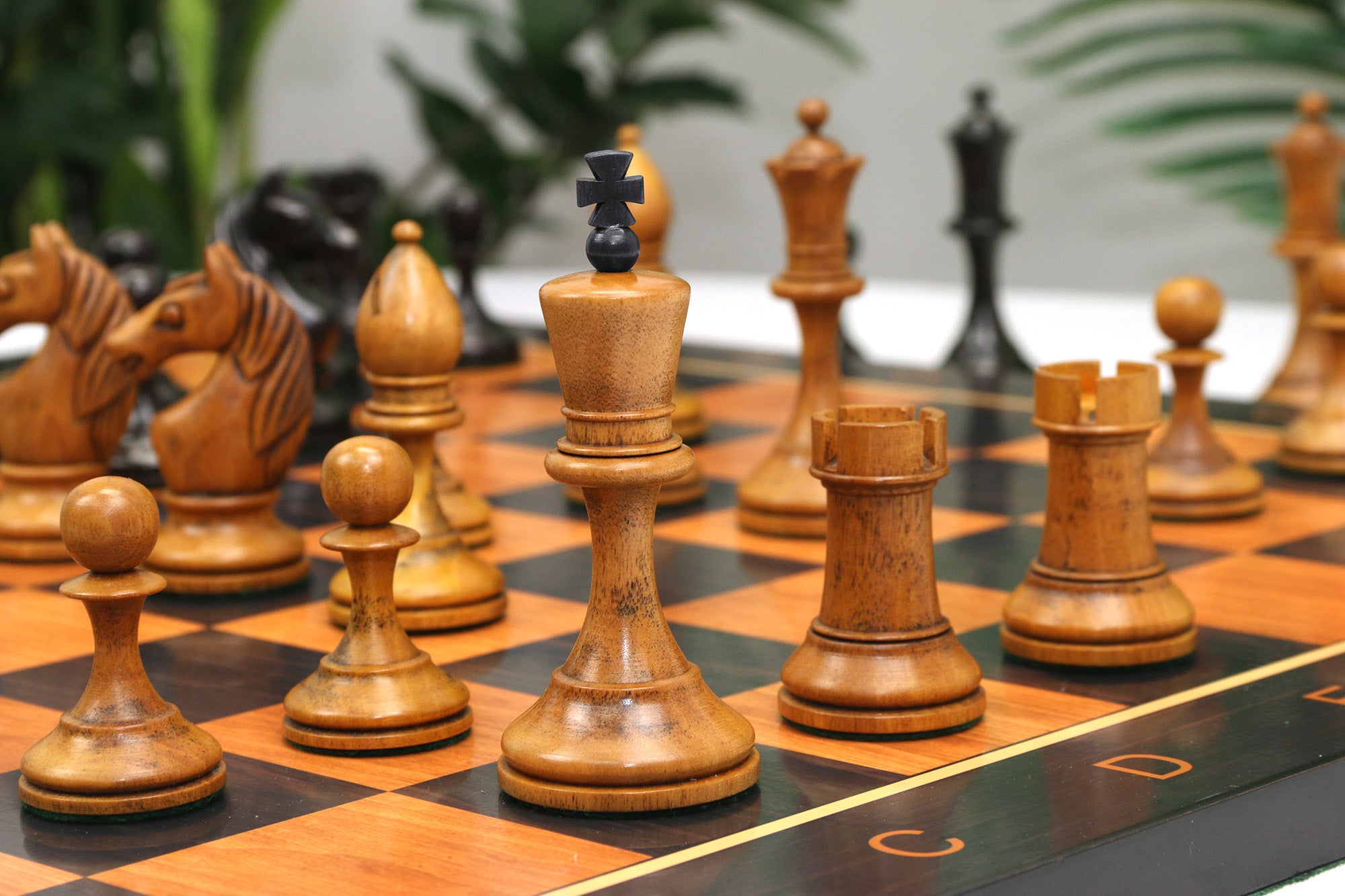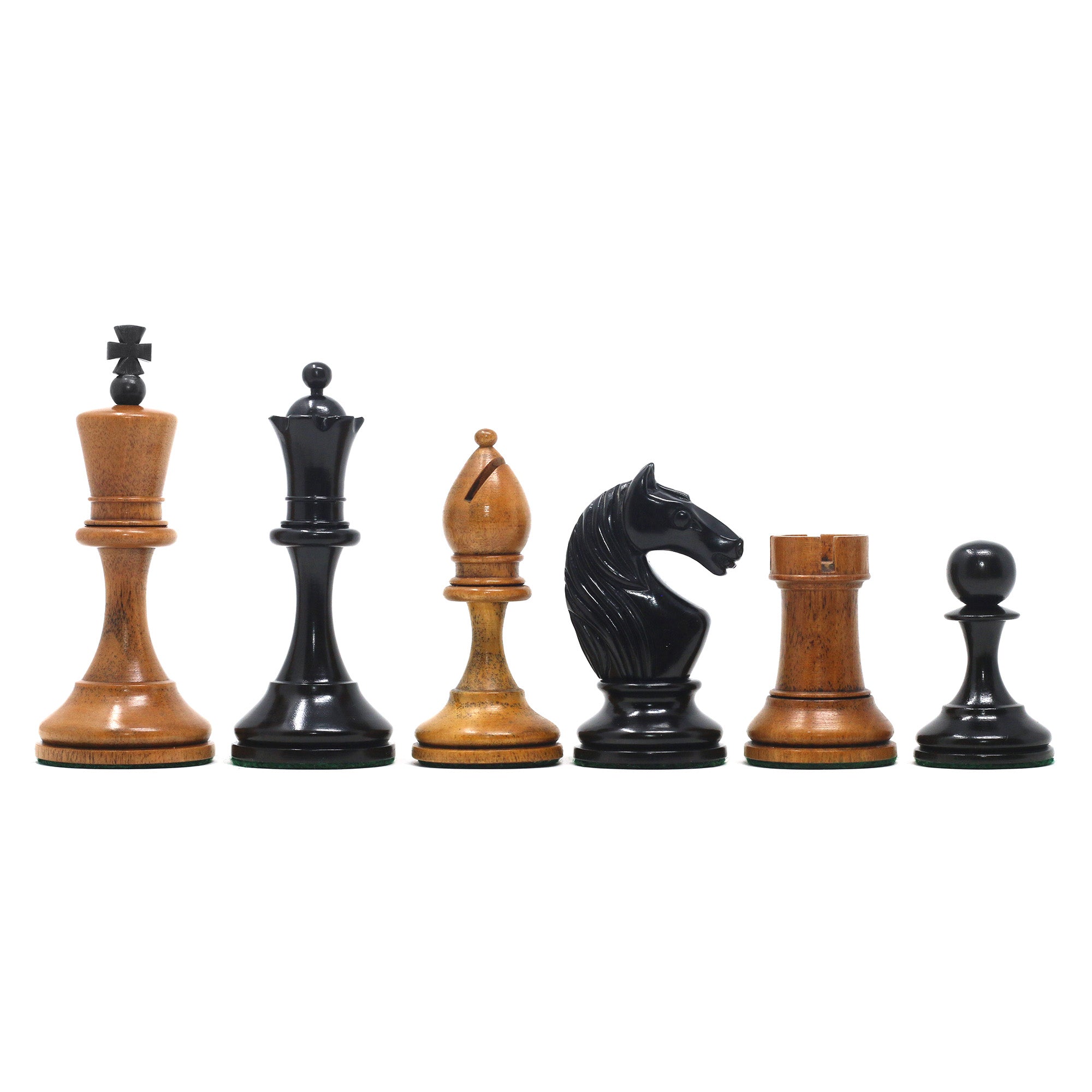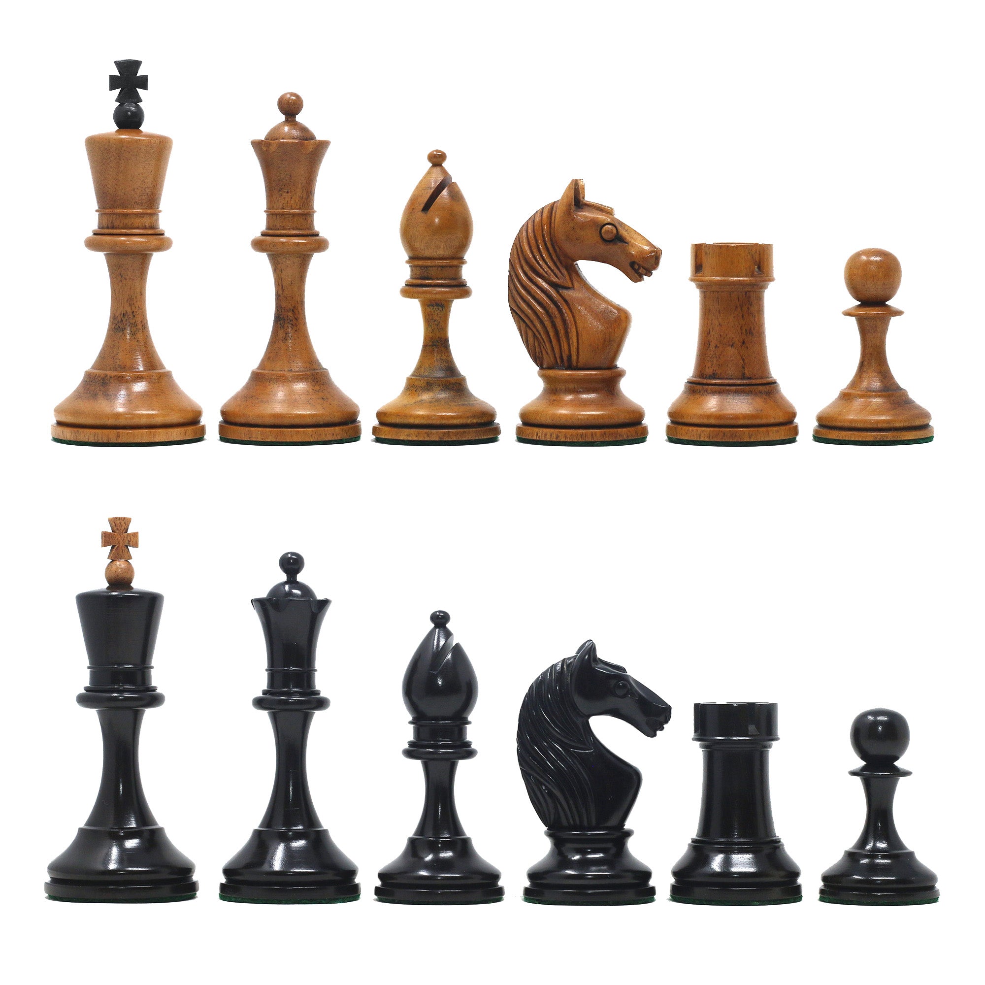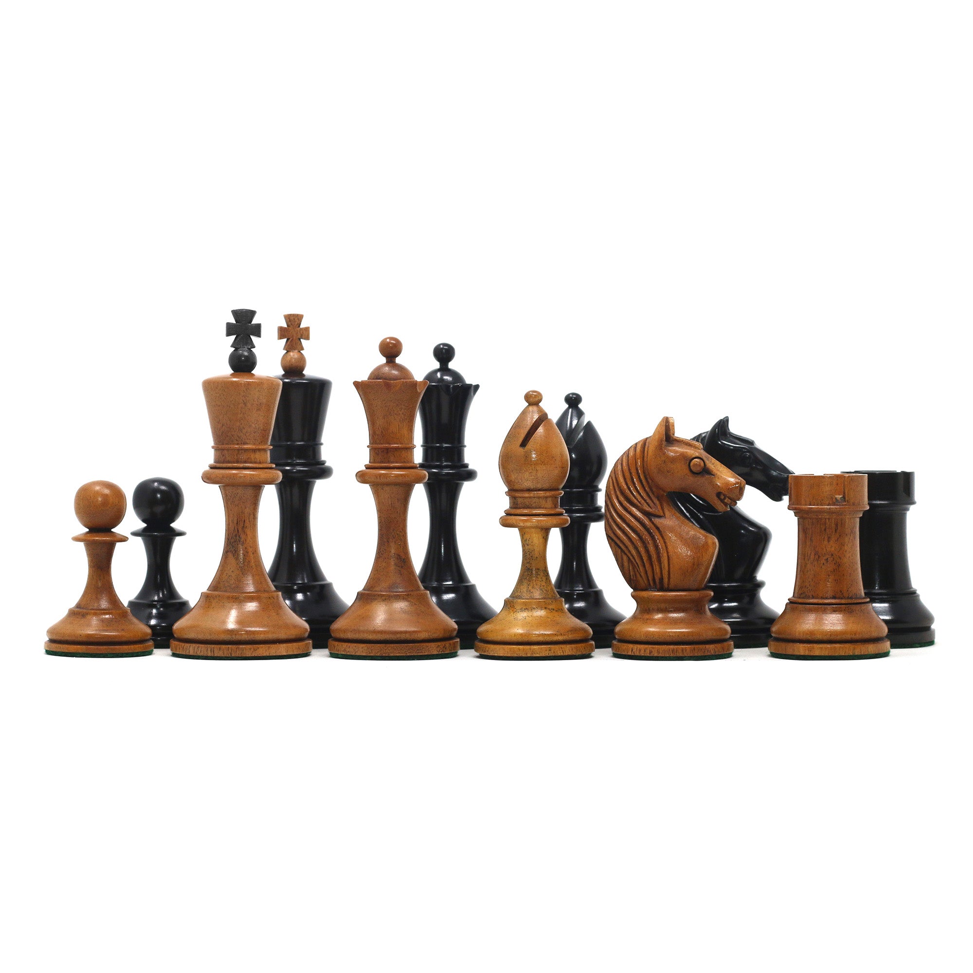 Crafted in antiqued boxwood chess pieces for the light army and premium ebony wood chess pieces for the dark, the set evokes the dignified patina and gravitas of early 20th-century tournament chess sets while maintaining exceptional balance and playability for modern use.