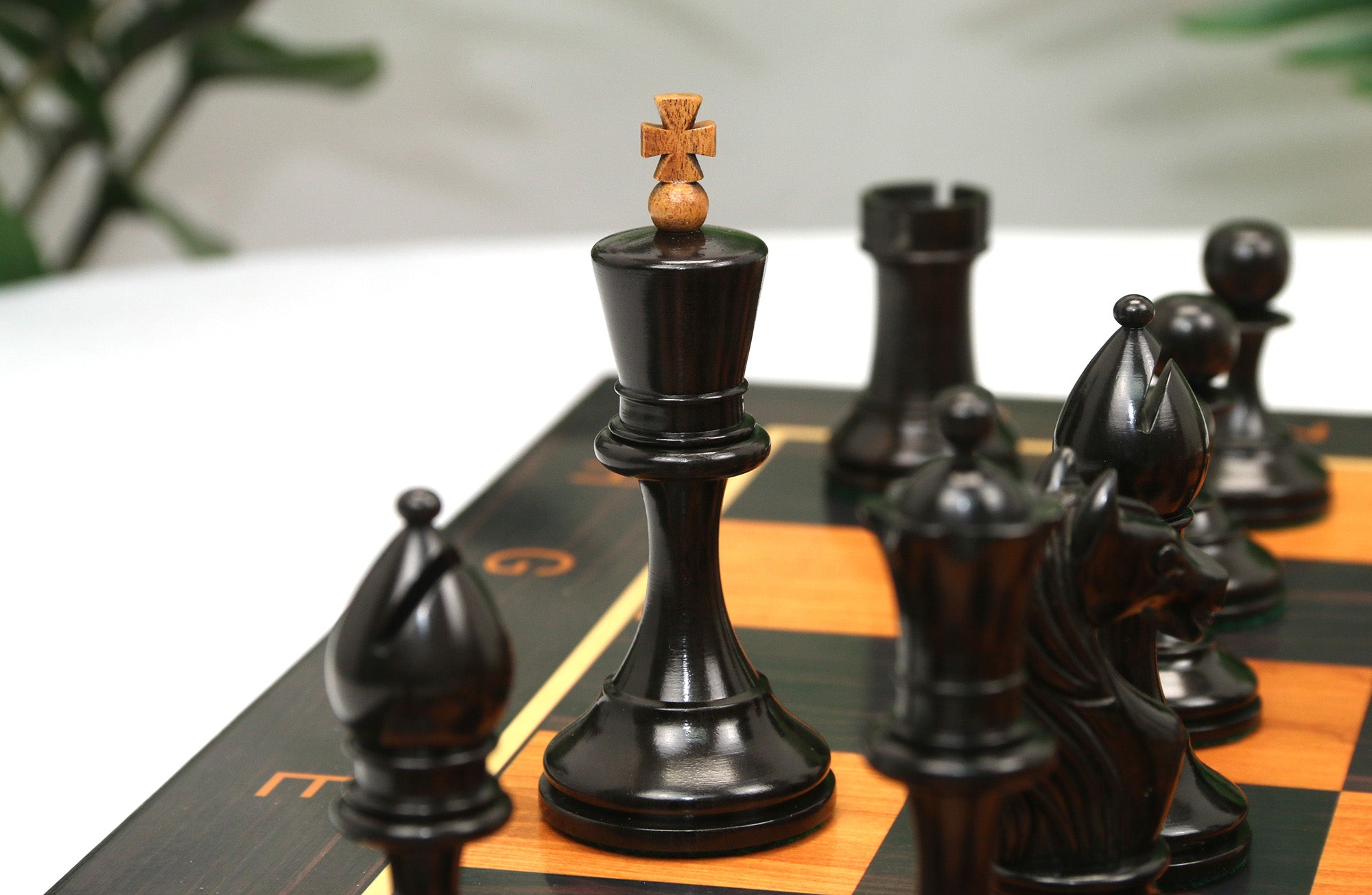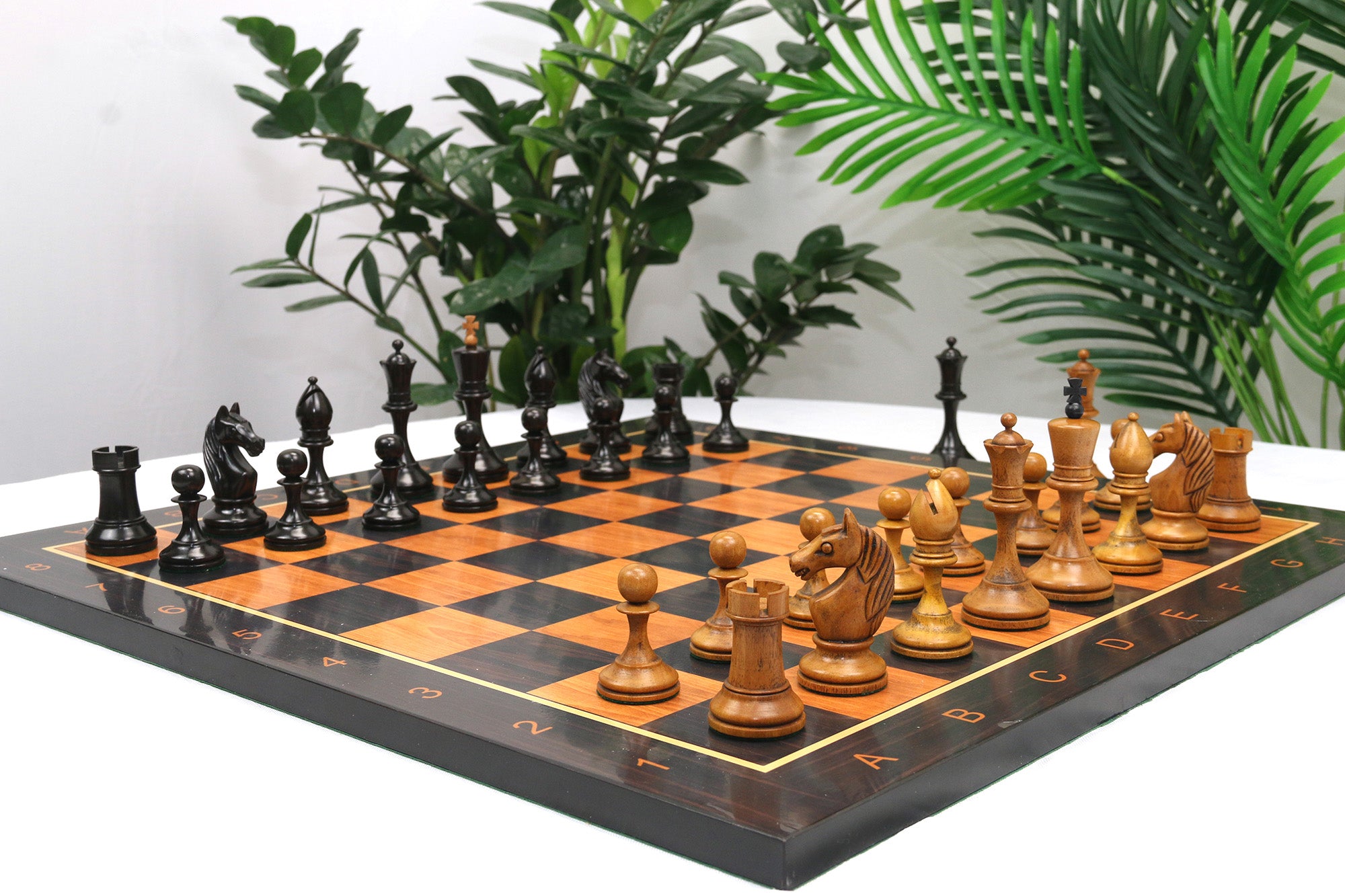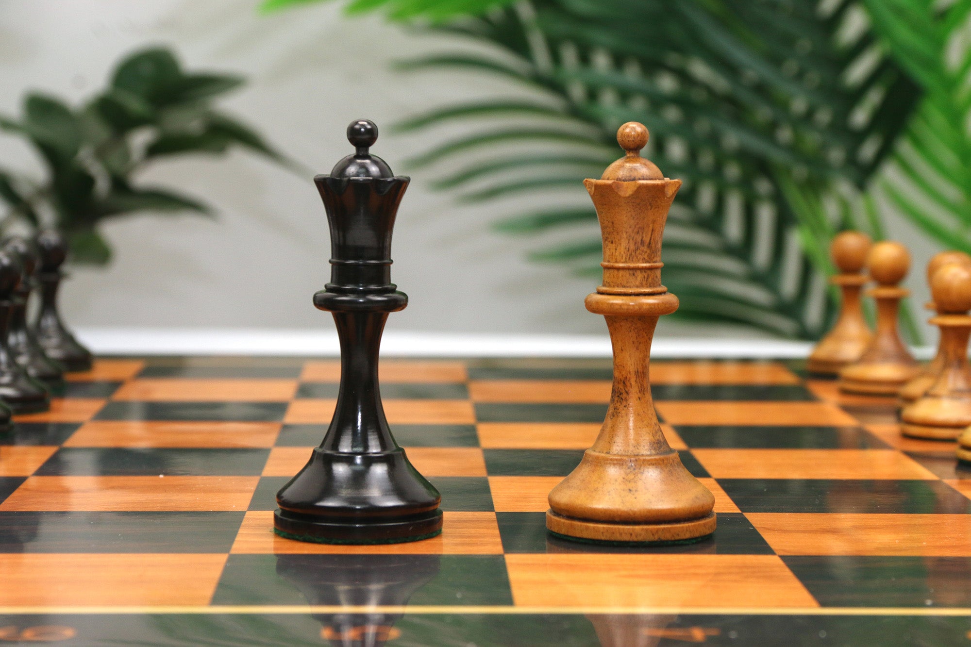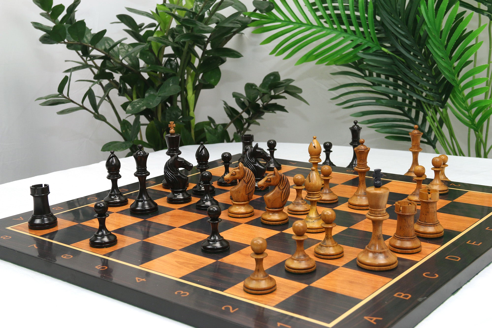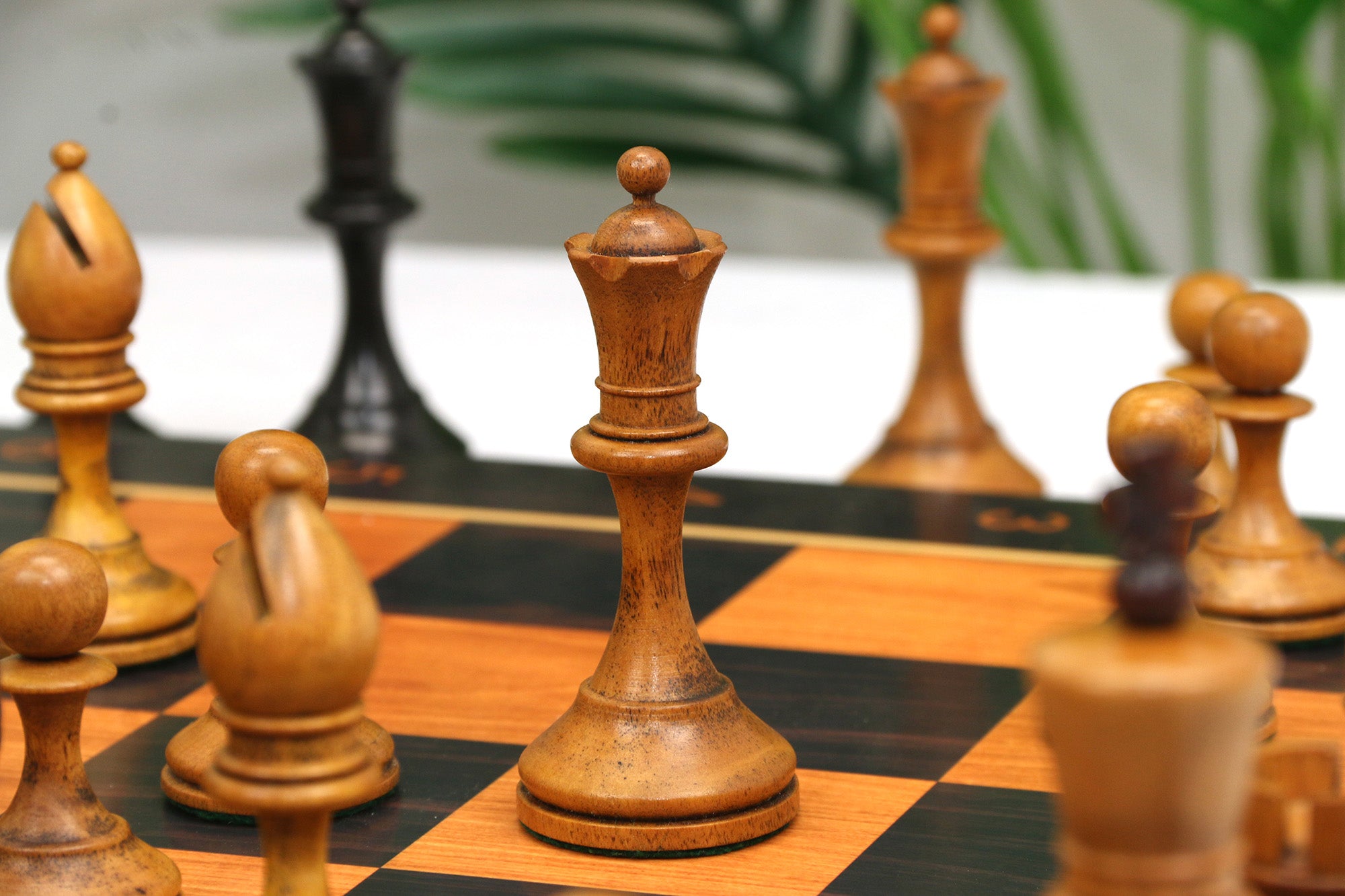 Crafted in antiqued boxwood chess pieces for the light army and premium ebony wood chess pieces for the dark, the set evokes the dignified patina and gravitas of early 20th-century tournament chess sets while maintaining exceptional balance and playability for modern use.