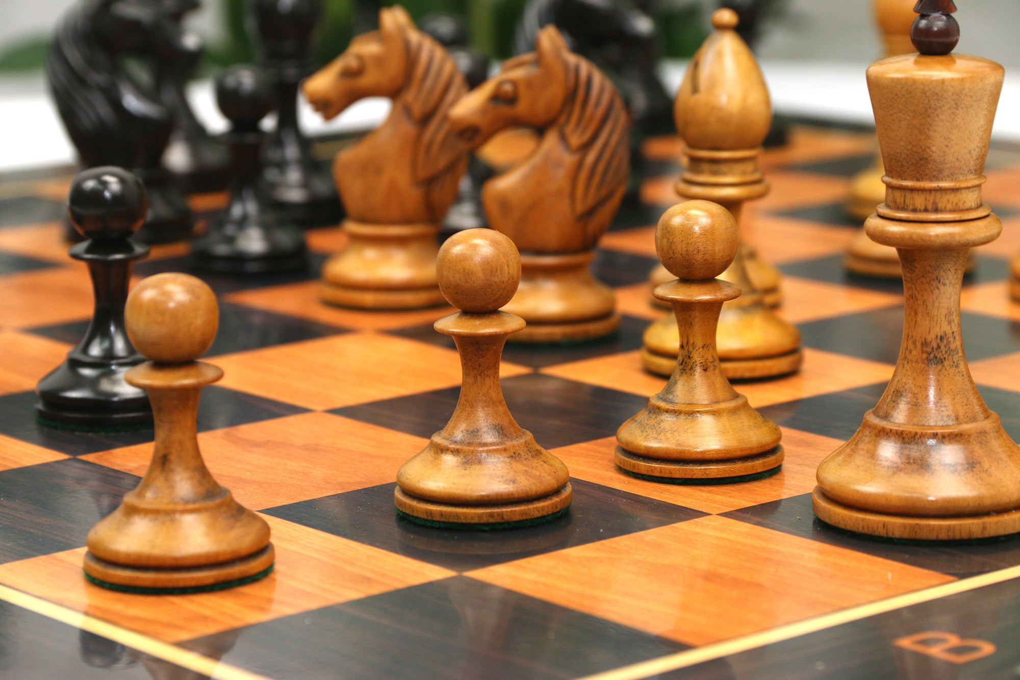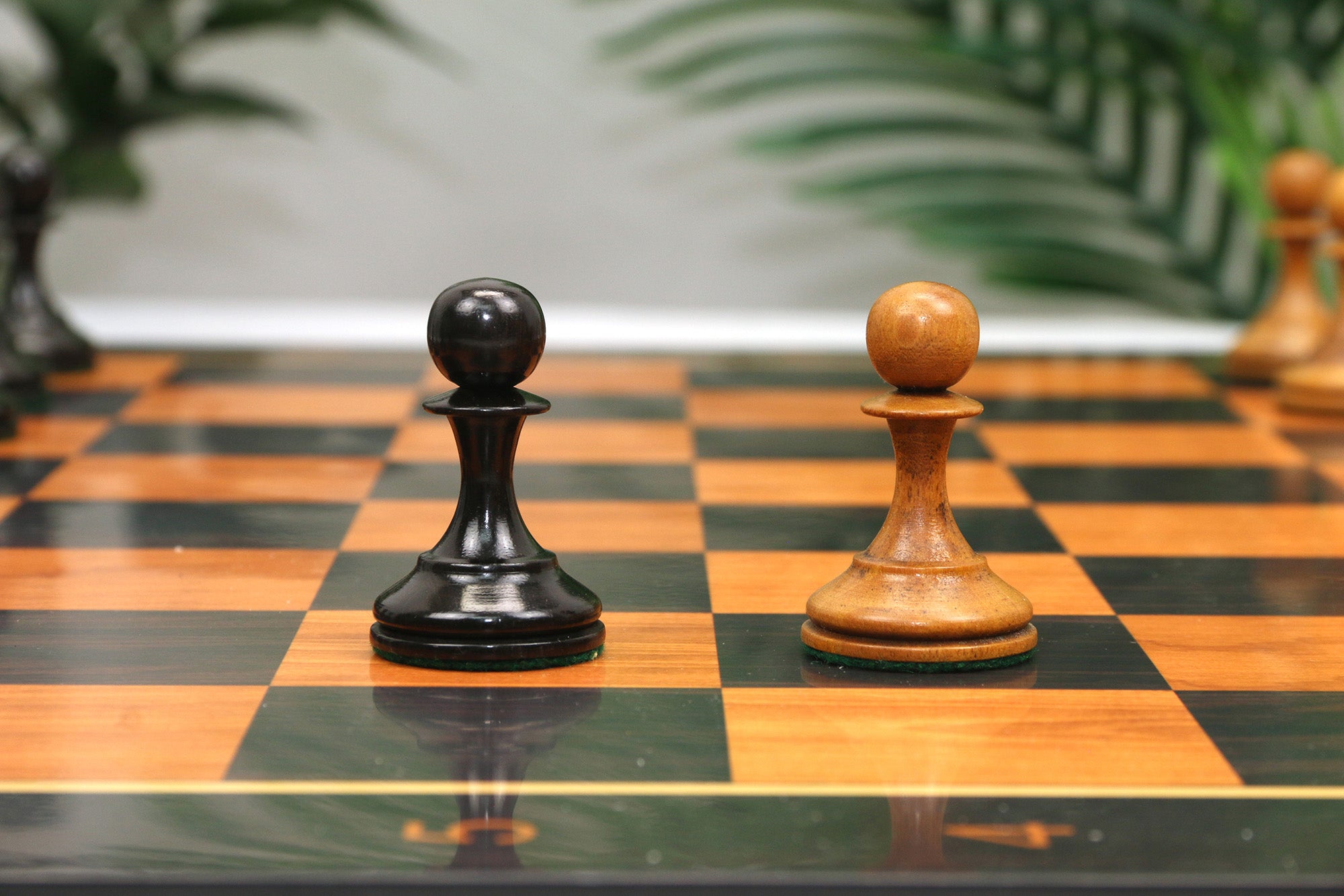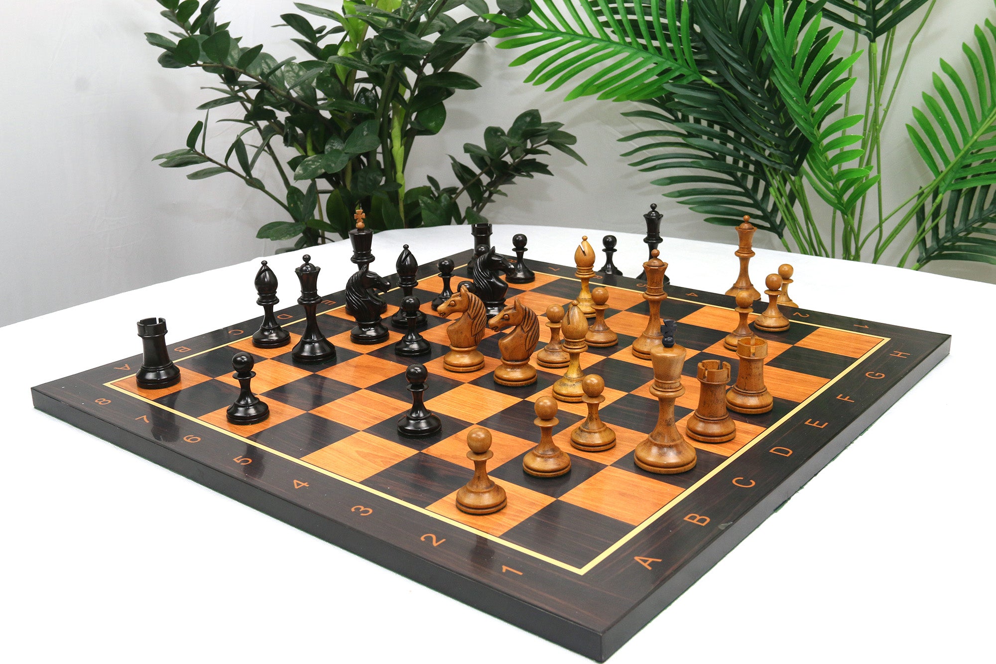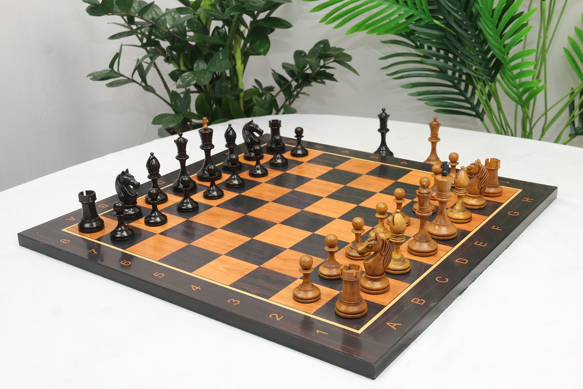 Crafted in antiqued boxwood chess pieces for the light army and premium ebony wood chess pieces for the dark, the set evokes the dignified patina and gravitas of early 20th-century tournament chess sets while maintaining exceptional balance and playability for modern use.