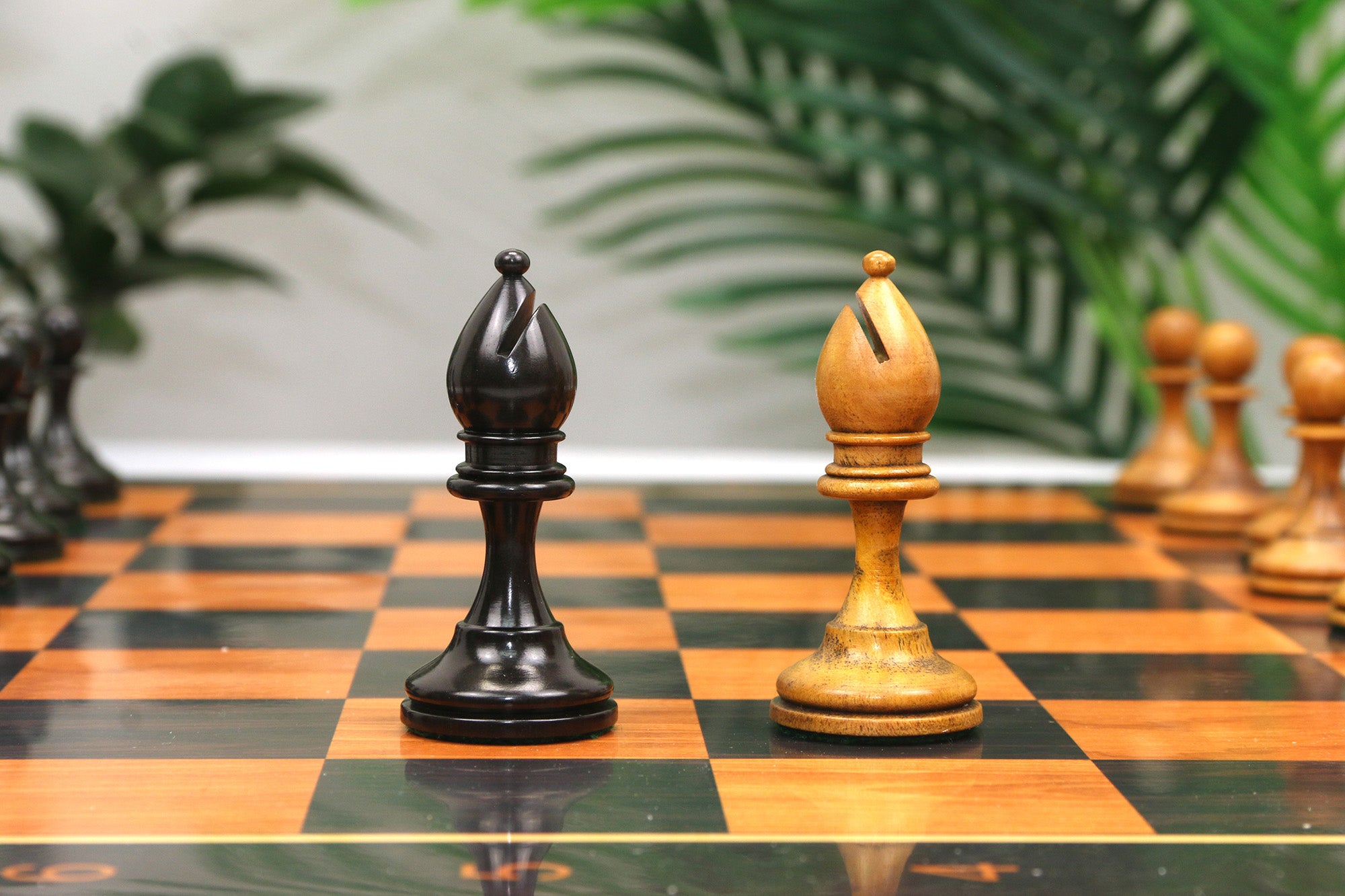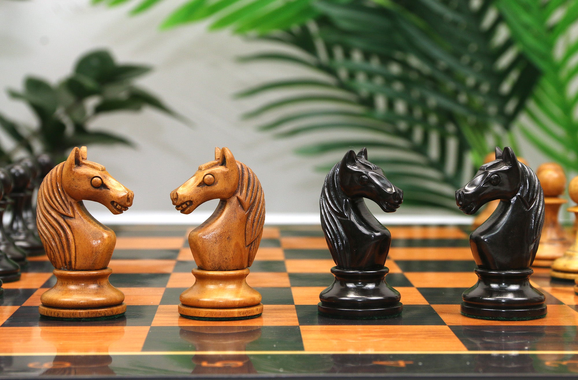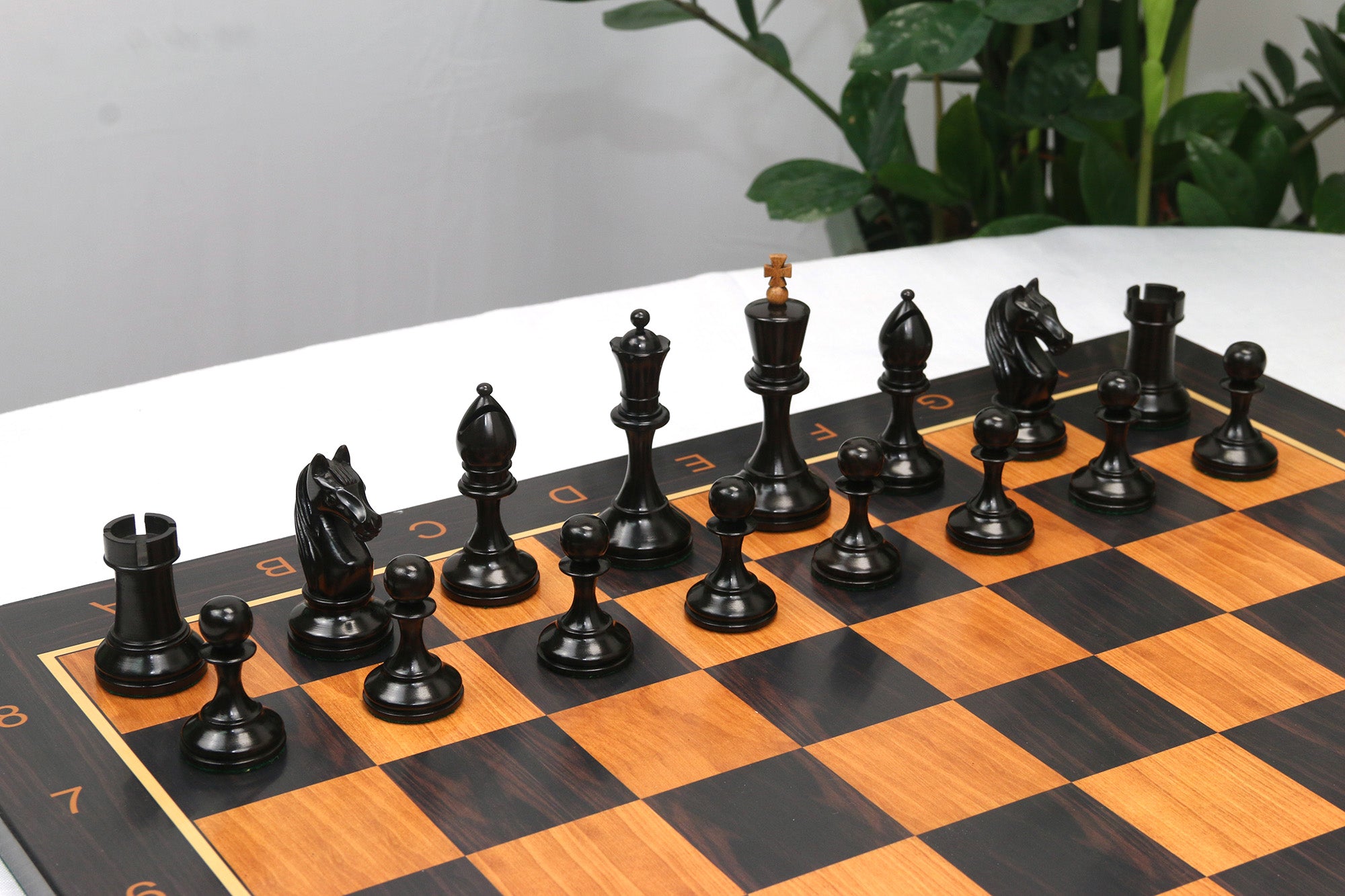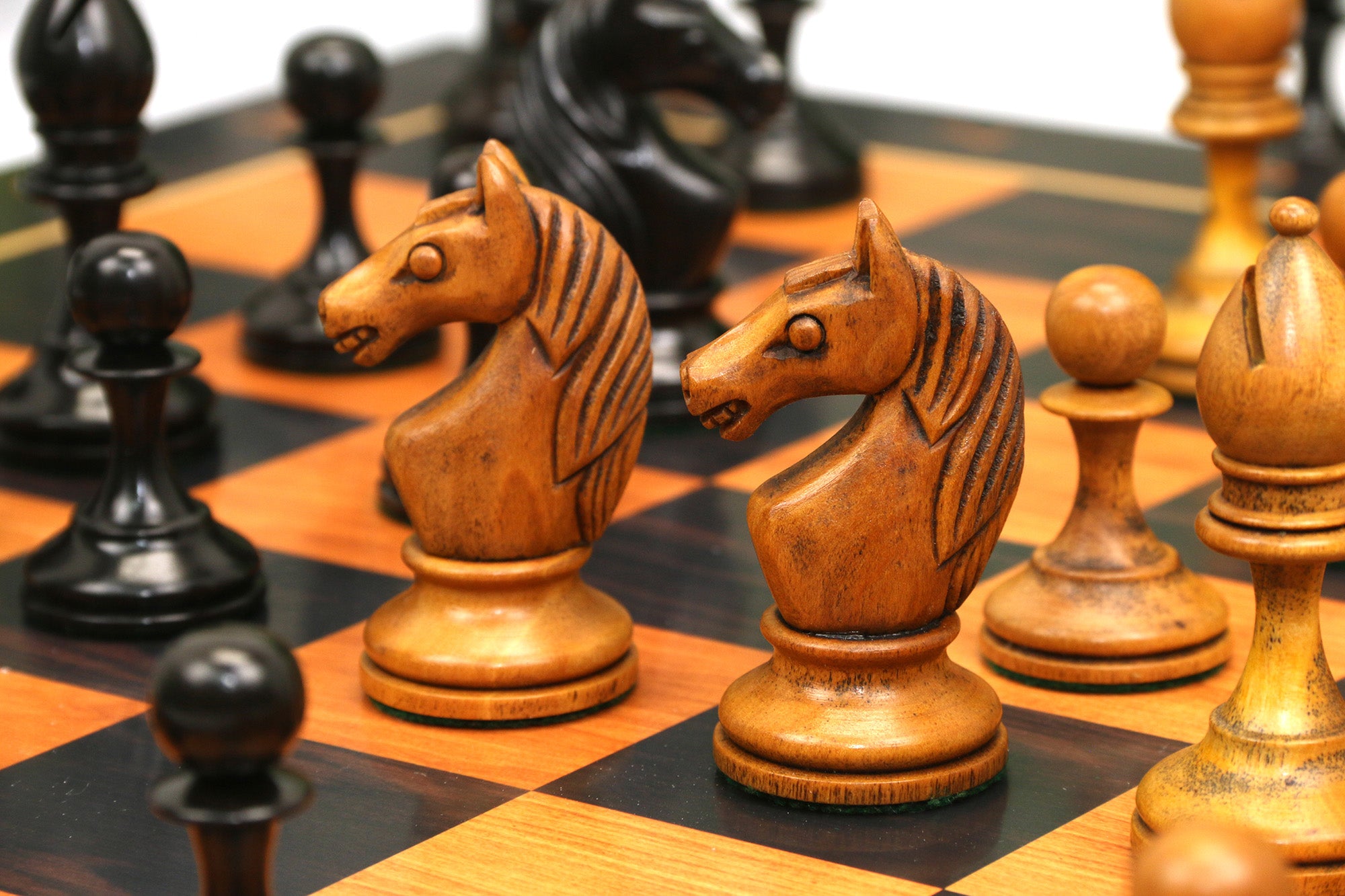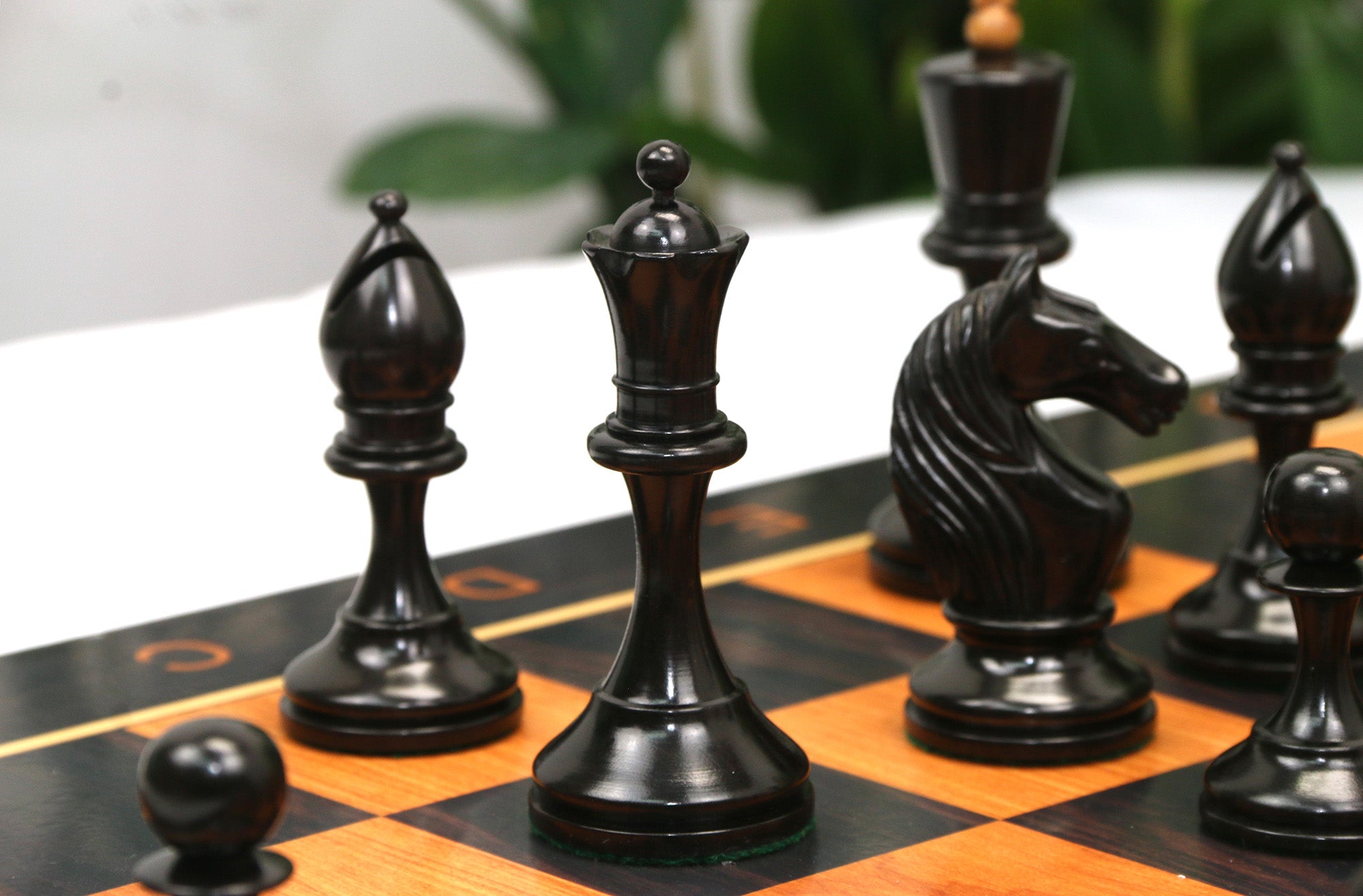 Crafted in antiqued boxwood chess pieces for the light army and premium ebony wood chess pieces for the dark, the set evokes the dignified patina and gravitas of early 20th-century tournament chess sets while maintaining exceptional balance and playability for modern use.