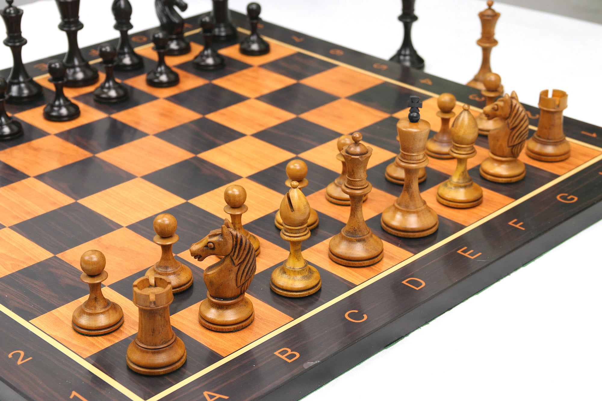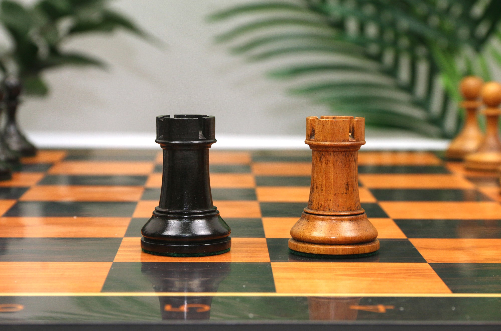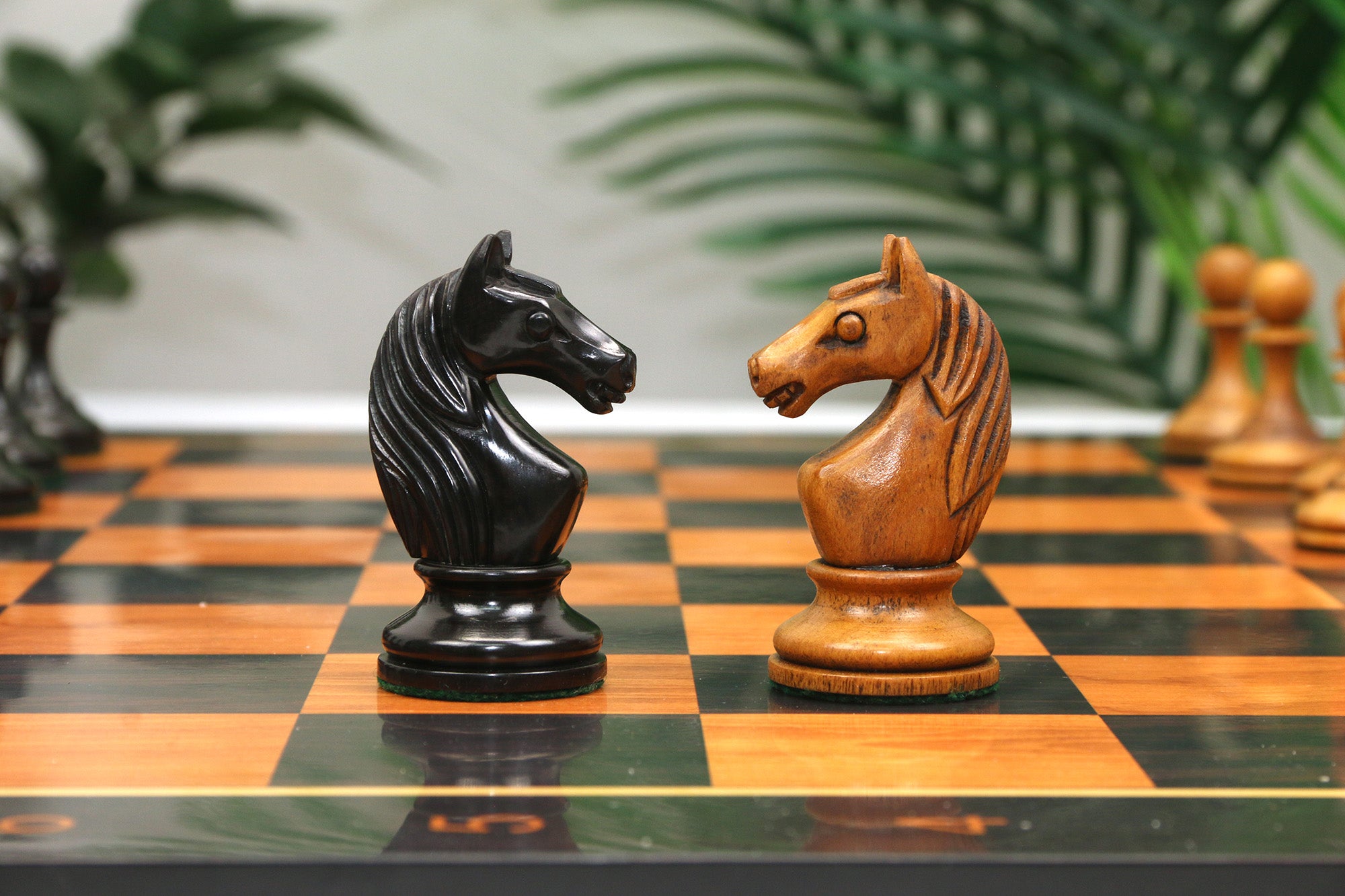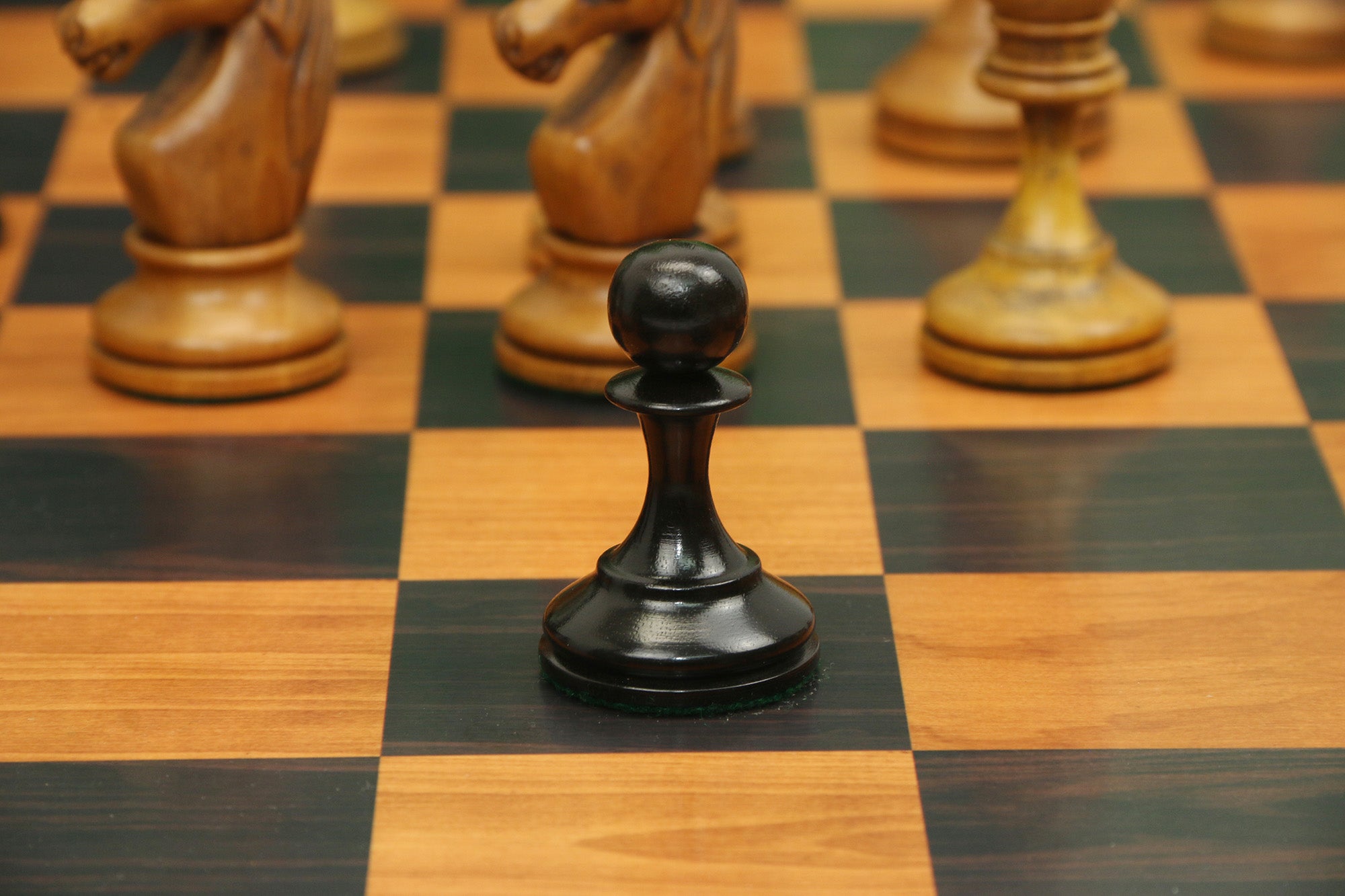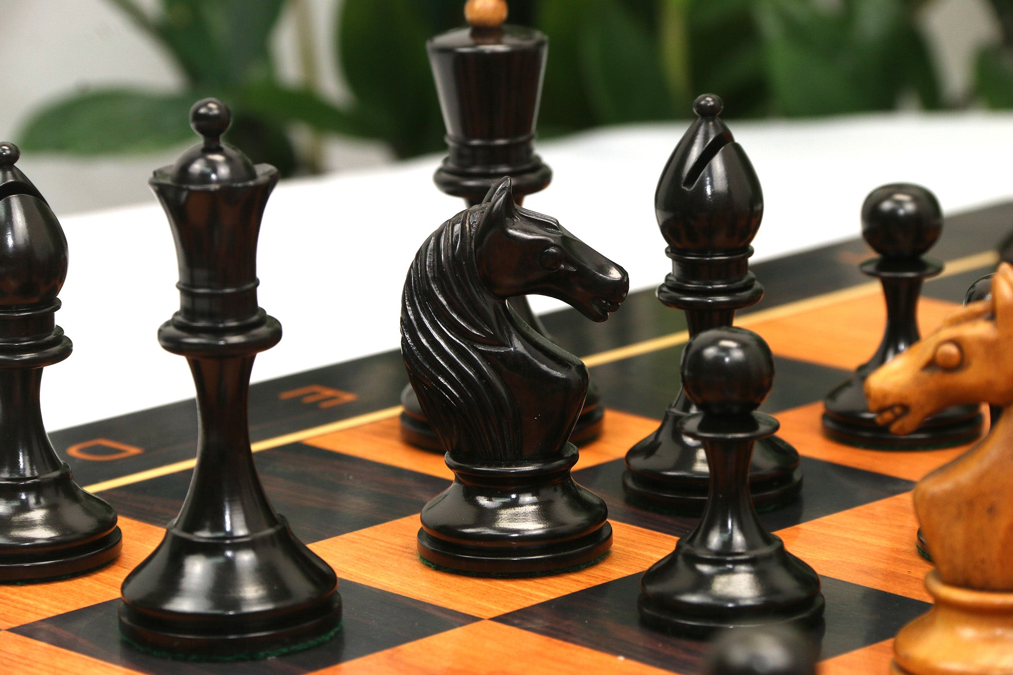 Crafted in antiqued boxwood chess pieces for the light army and premium ebony wood chess pieces for the dark, the set evokes the dignified patina and gravitas of early 20th-century tournament chess sets while maintaining exceptional balance and playability for modern use.