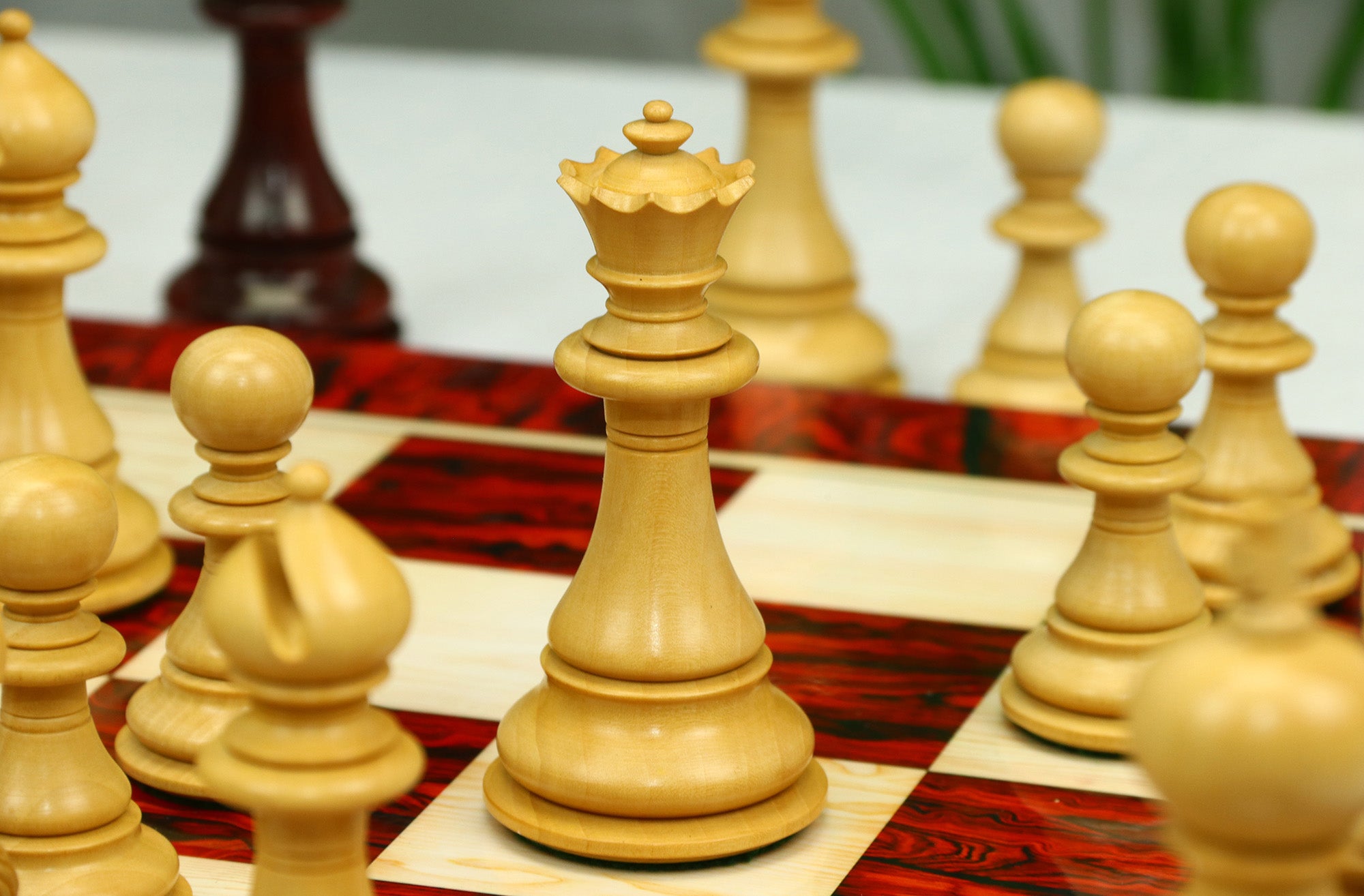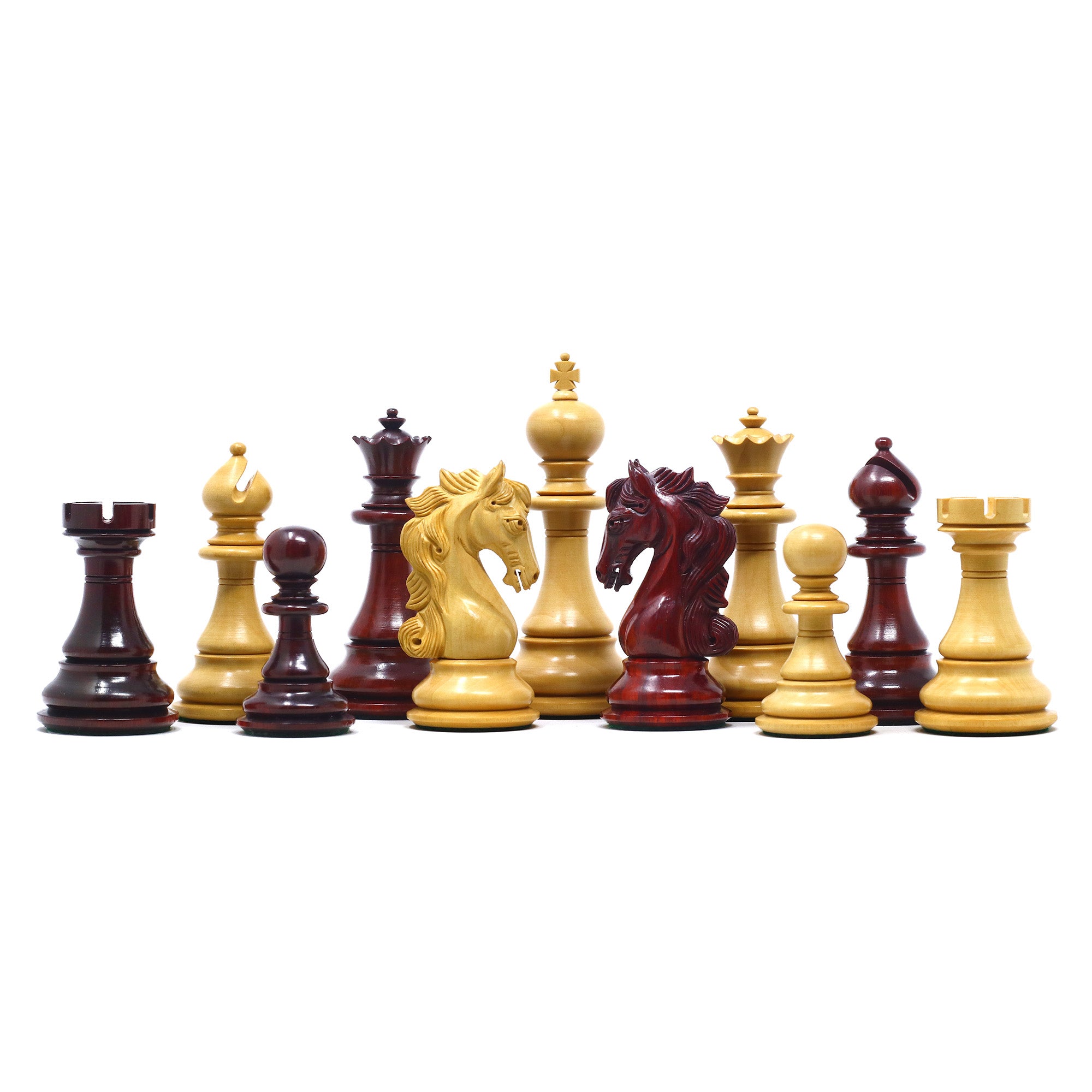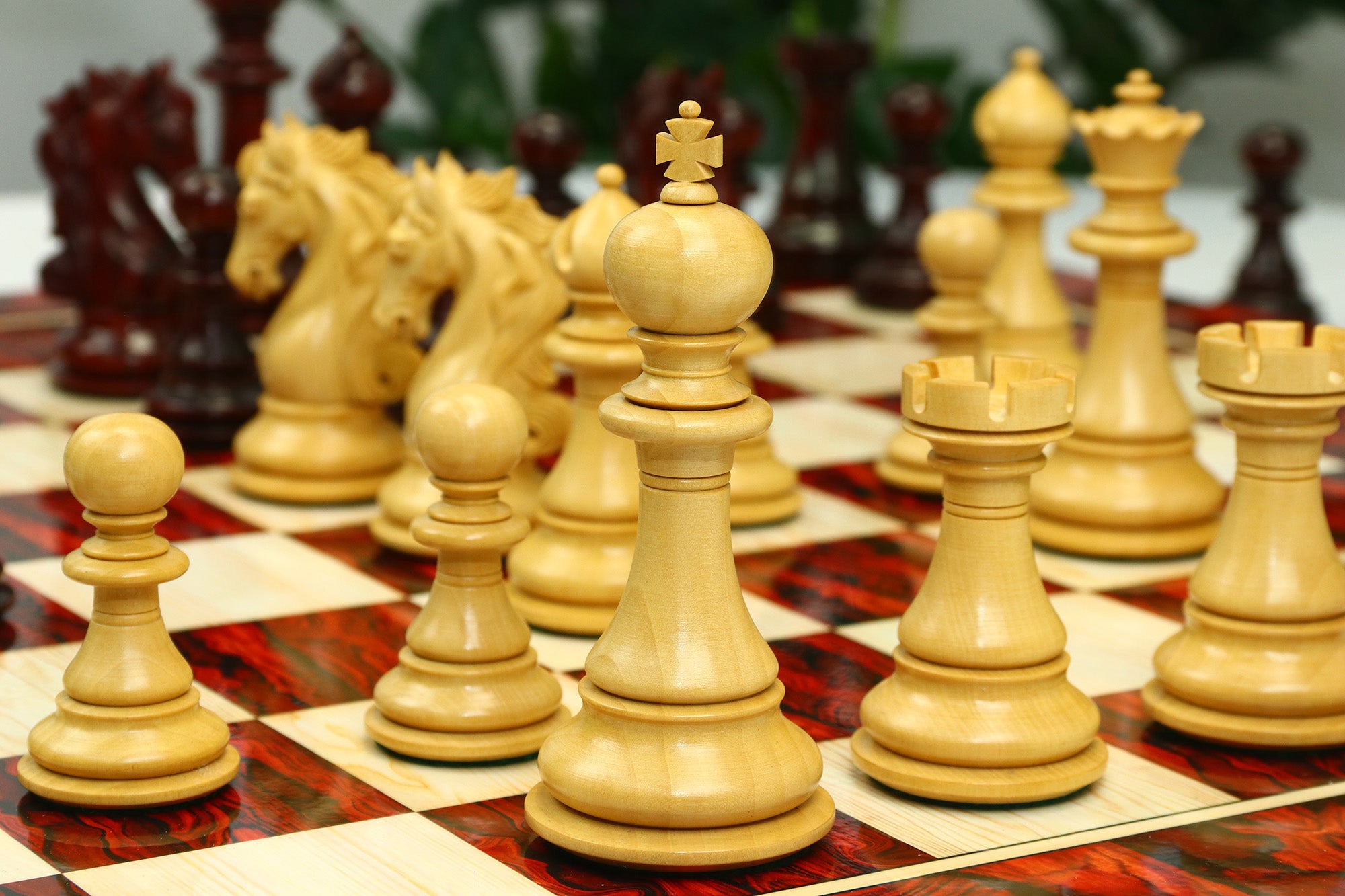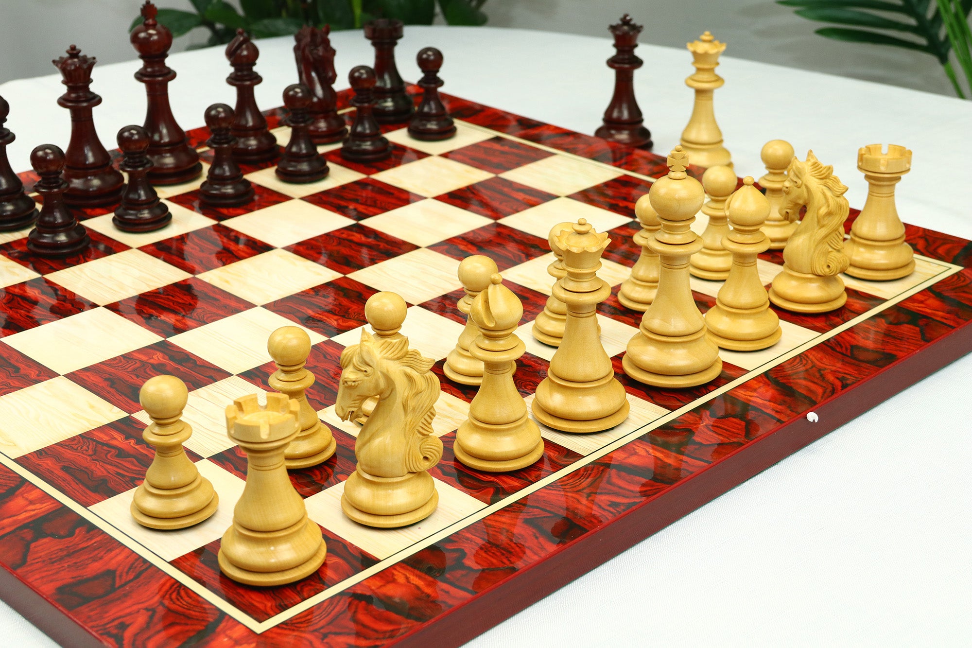 The chess pieces are crafted from high-grade African Padouk and premium Boxwood.