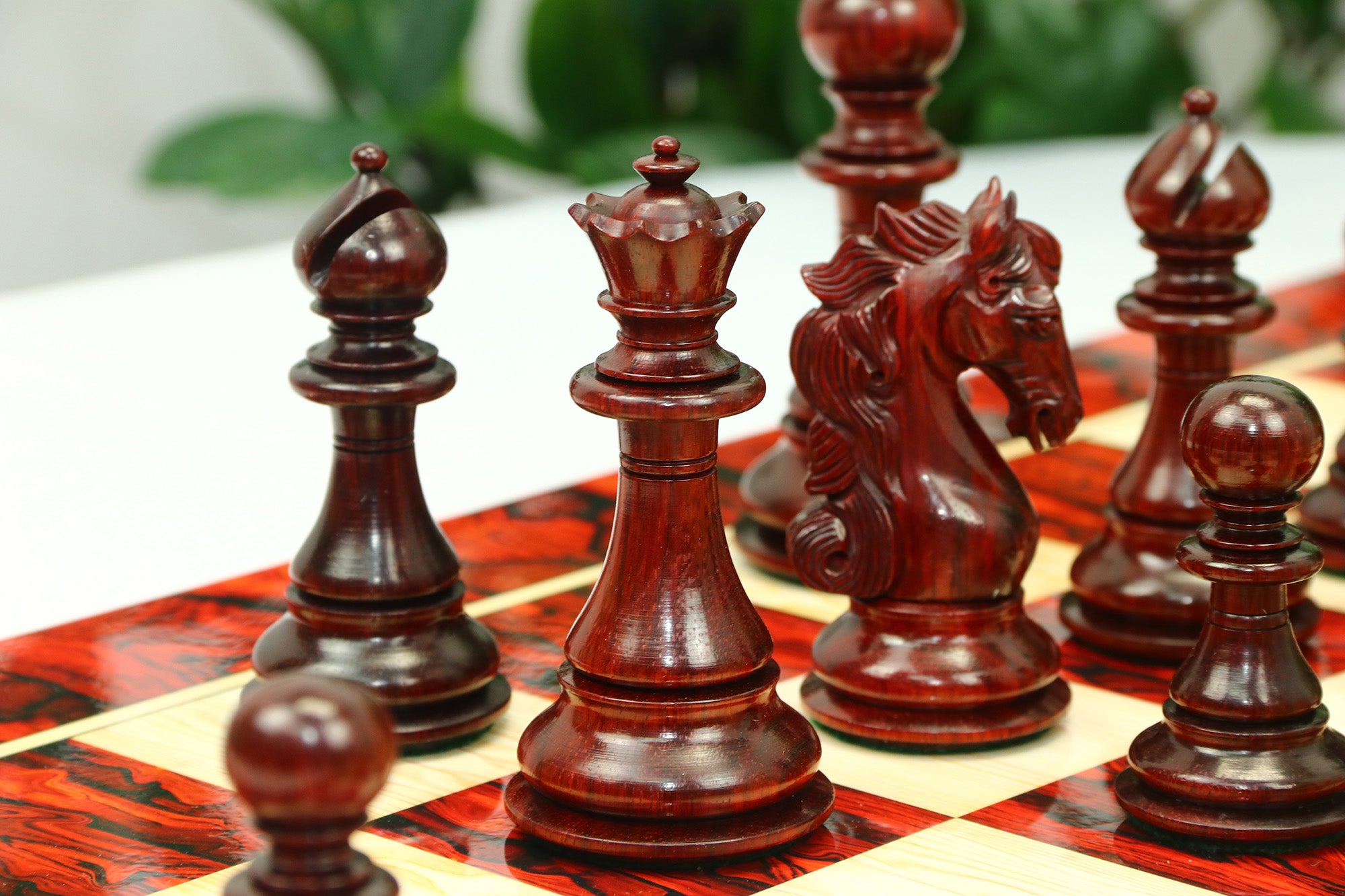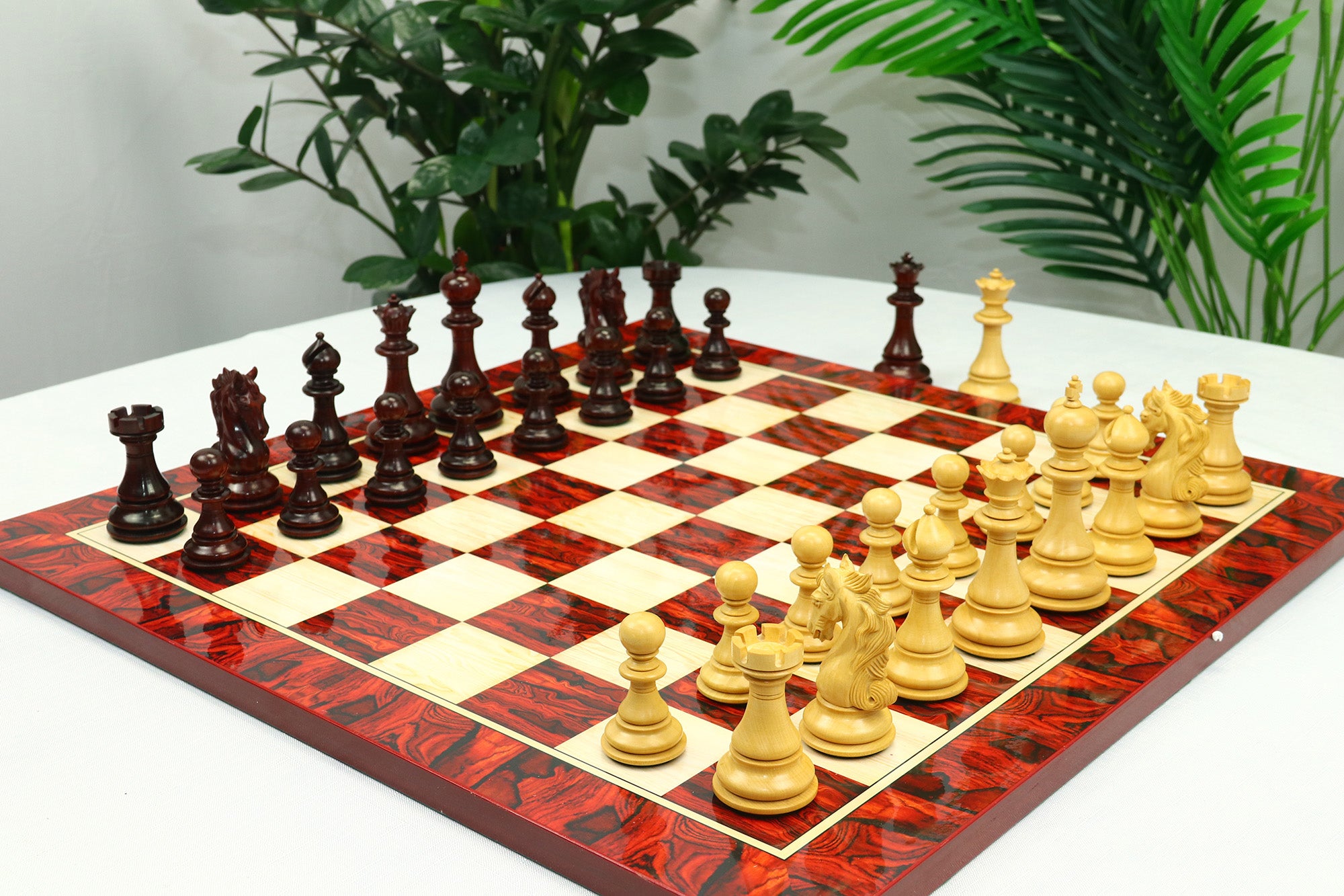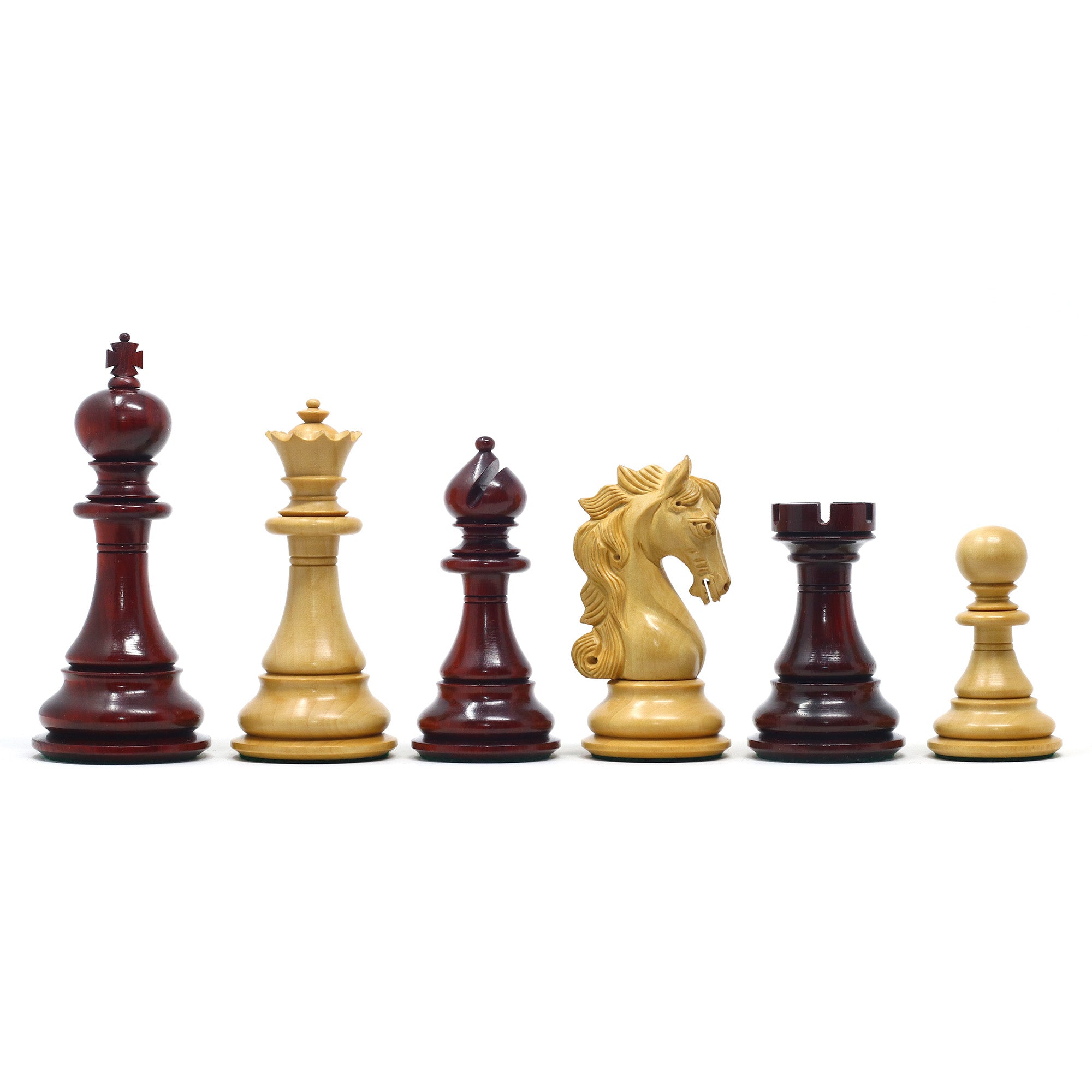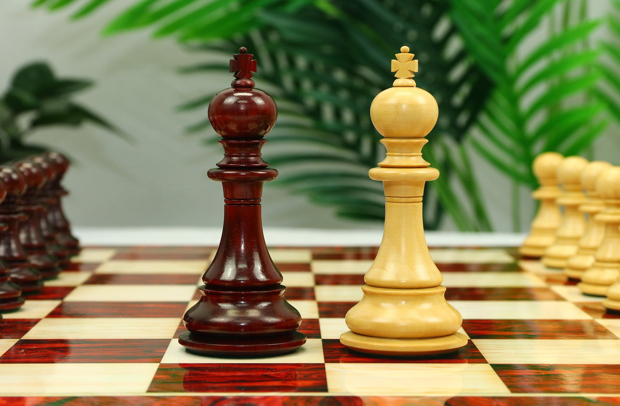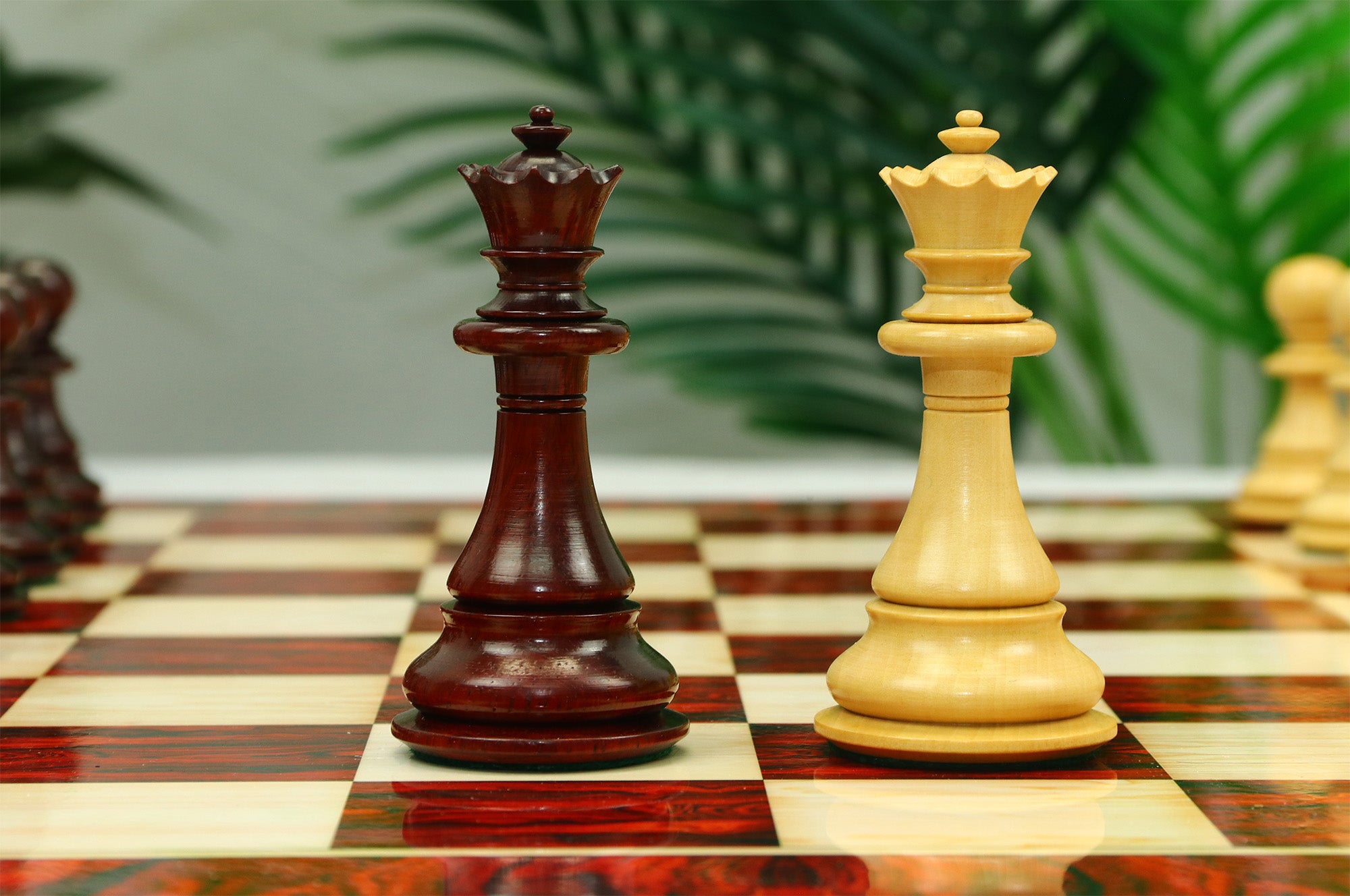 The chess pieces are crafted from high-grade African Padouk and premium Boxwood.