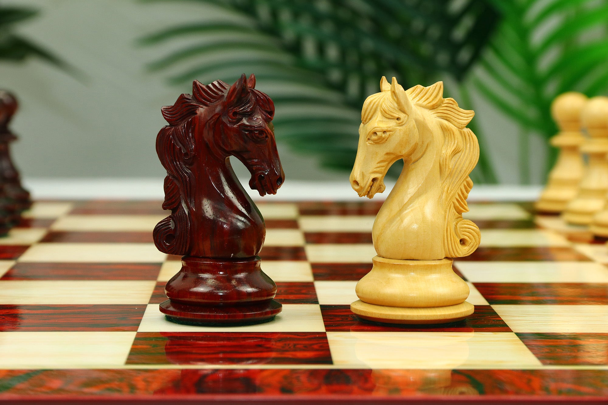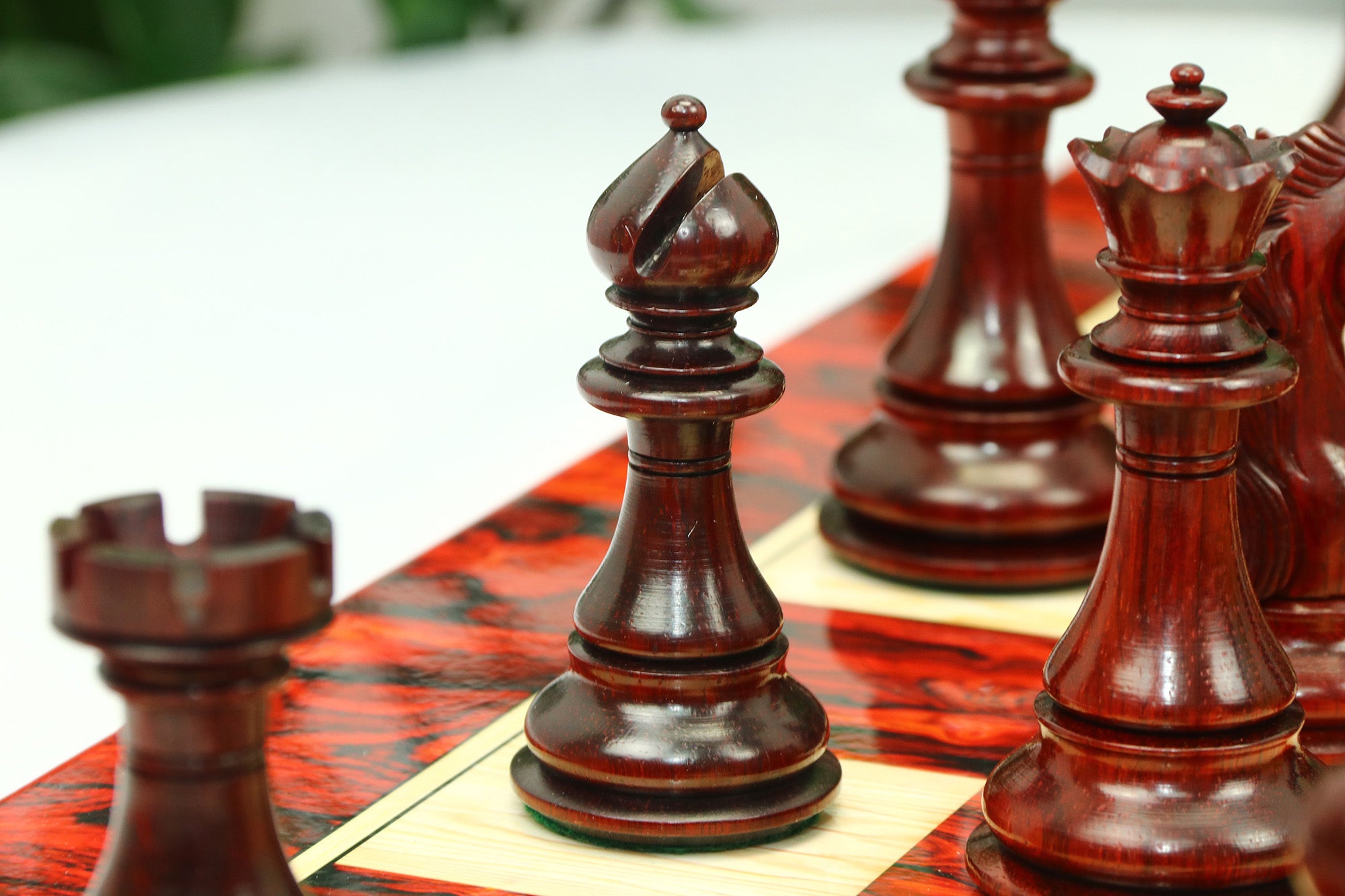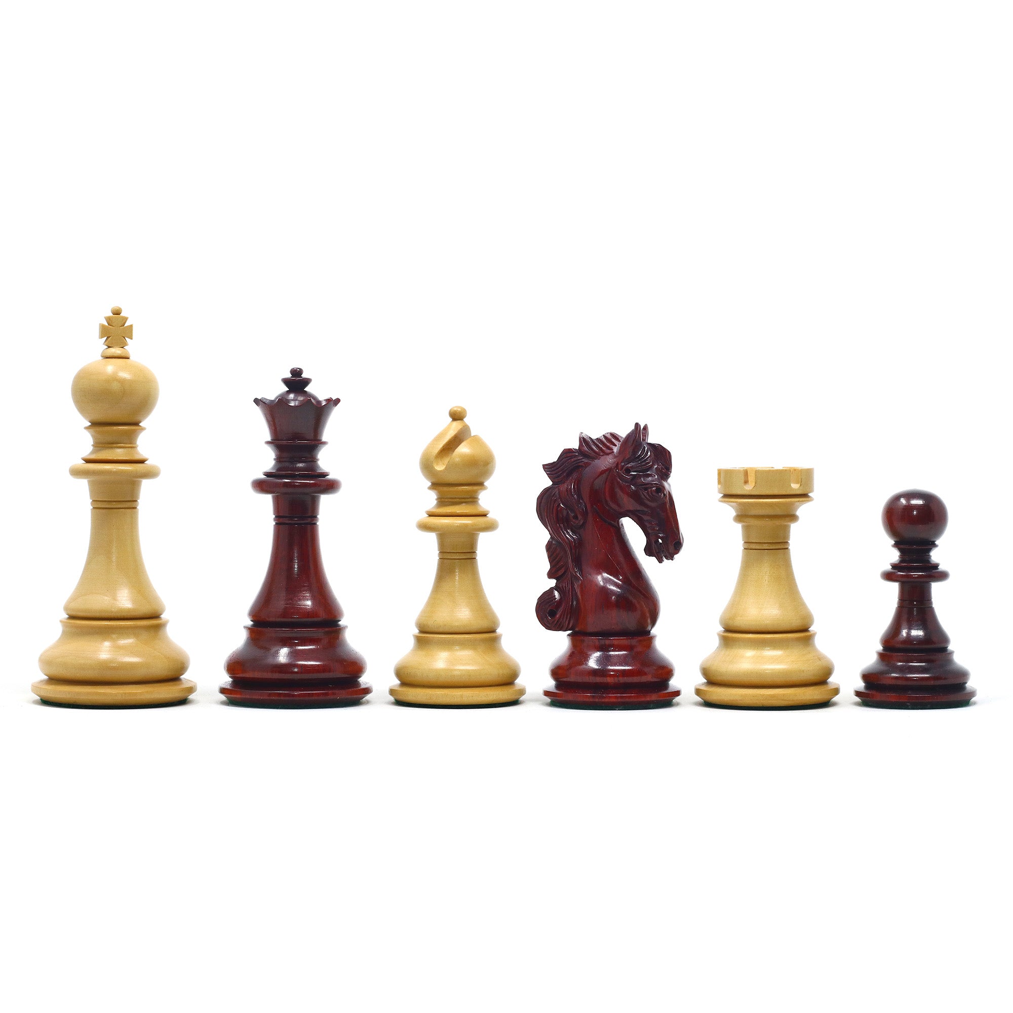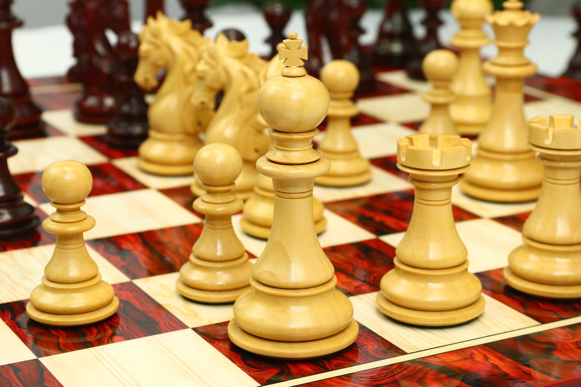 The chess pieces are crafted from high-grade African Padouk and premium Boxwood.