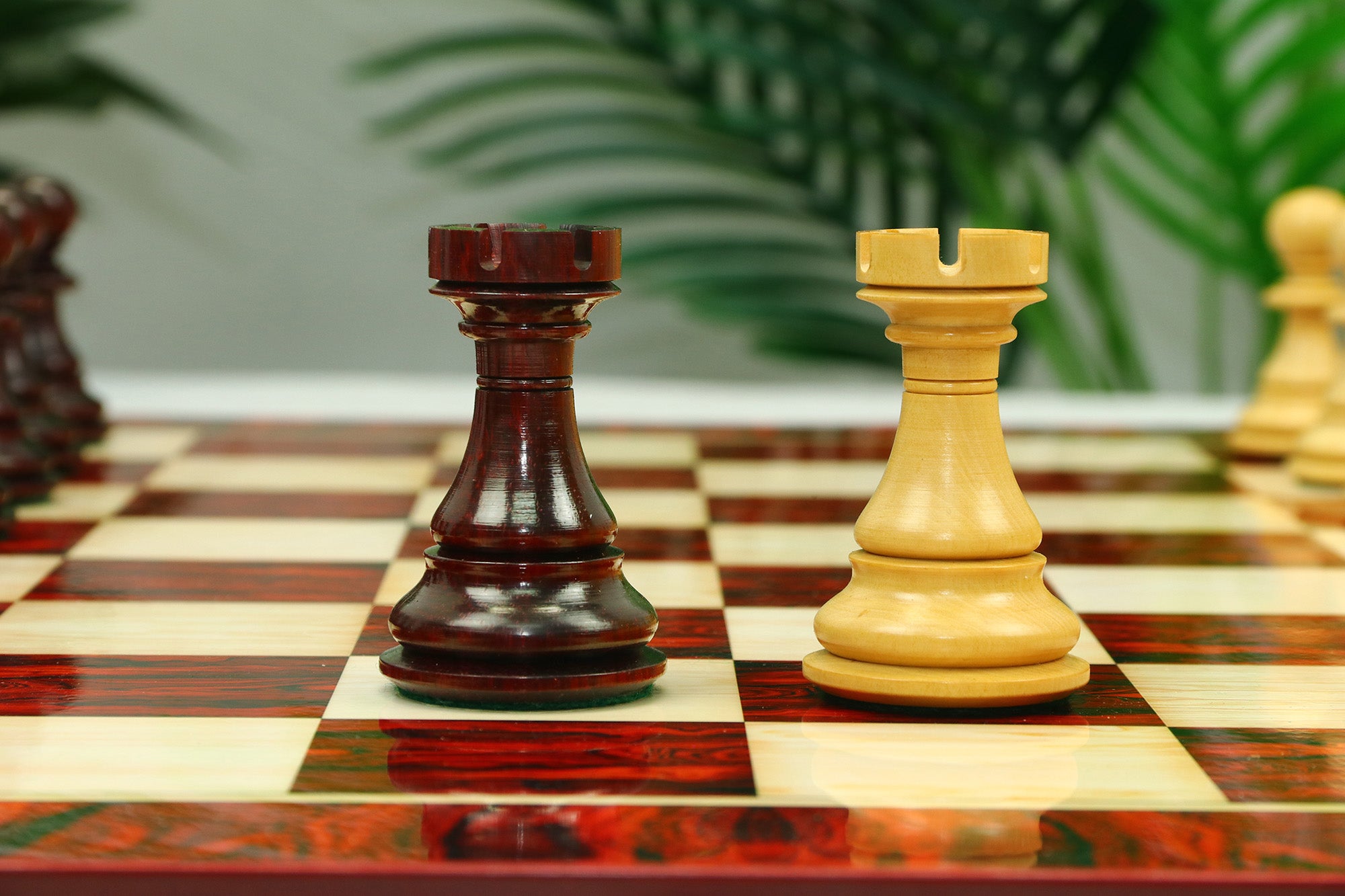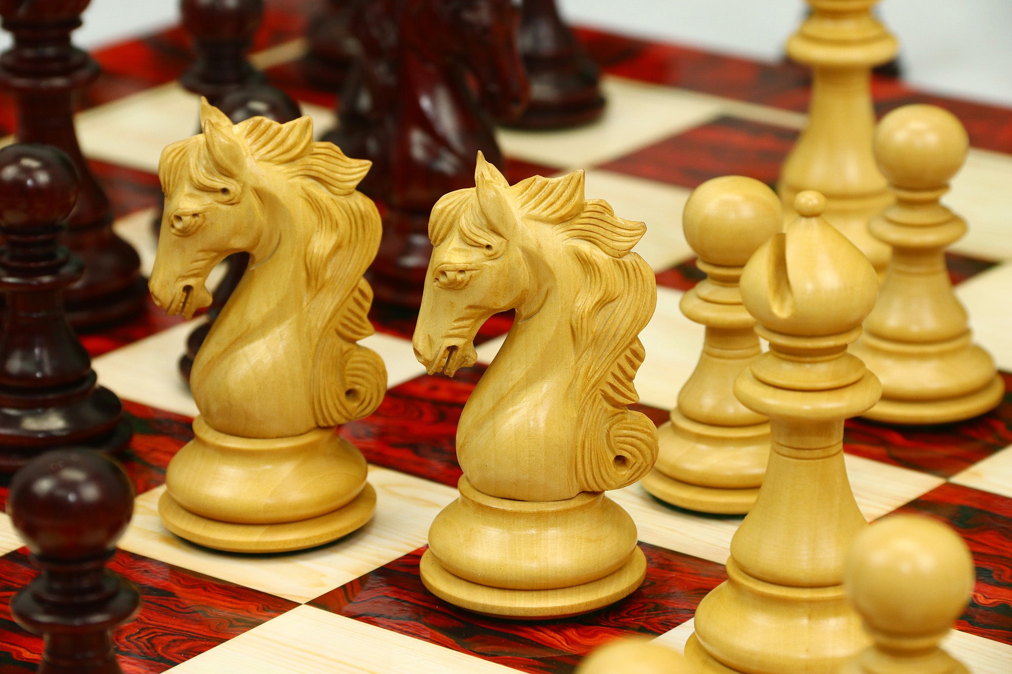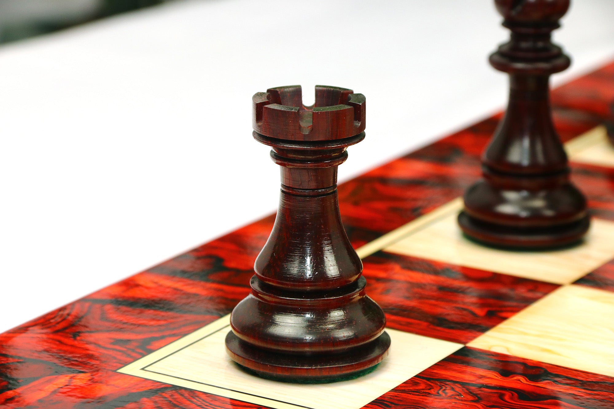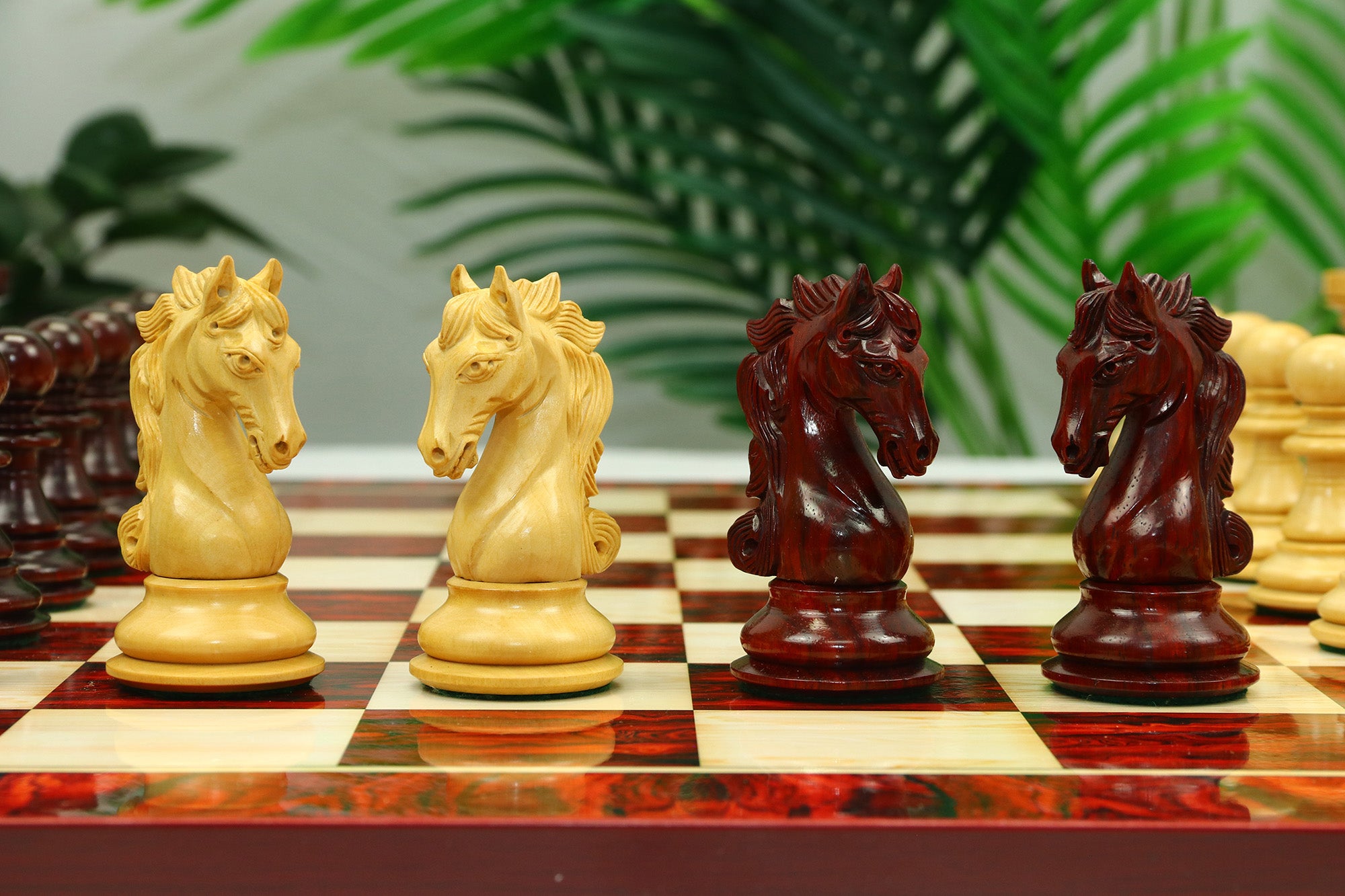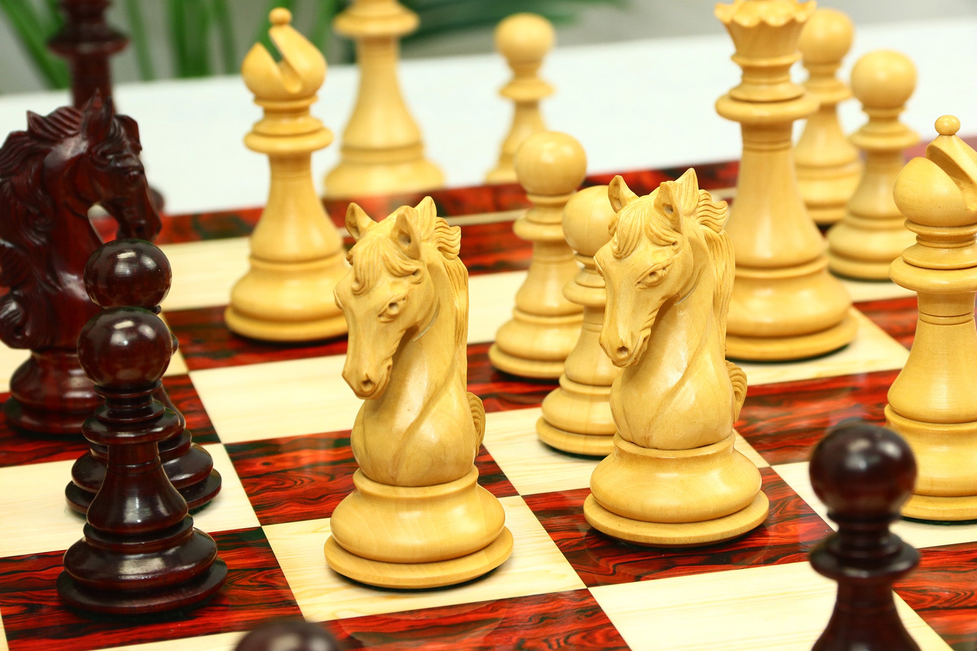 The chess pieces are crafted from high-grade African Padouk and premium Boxwood.